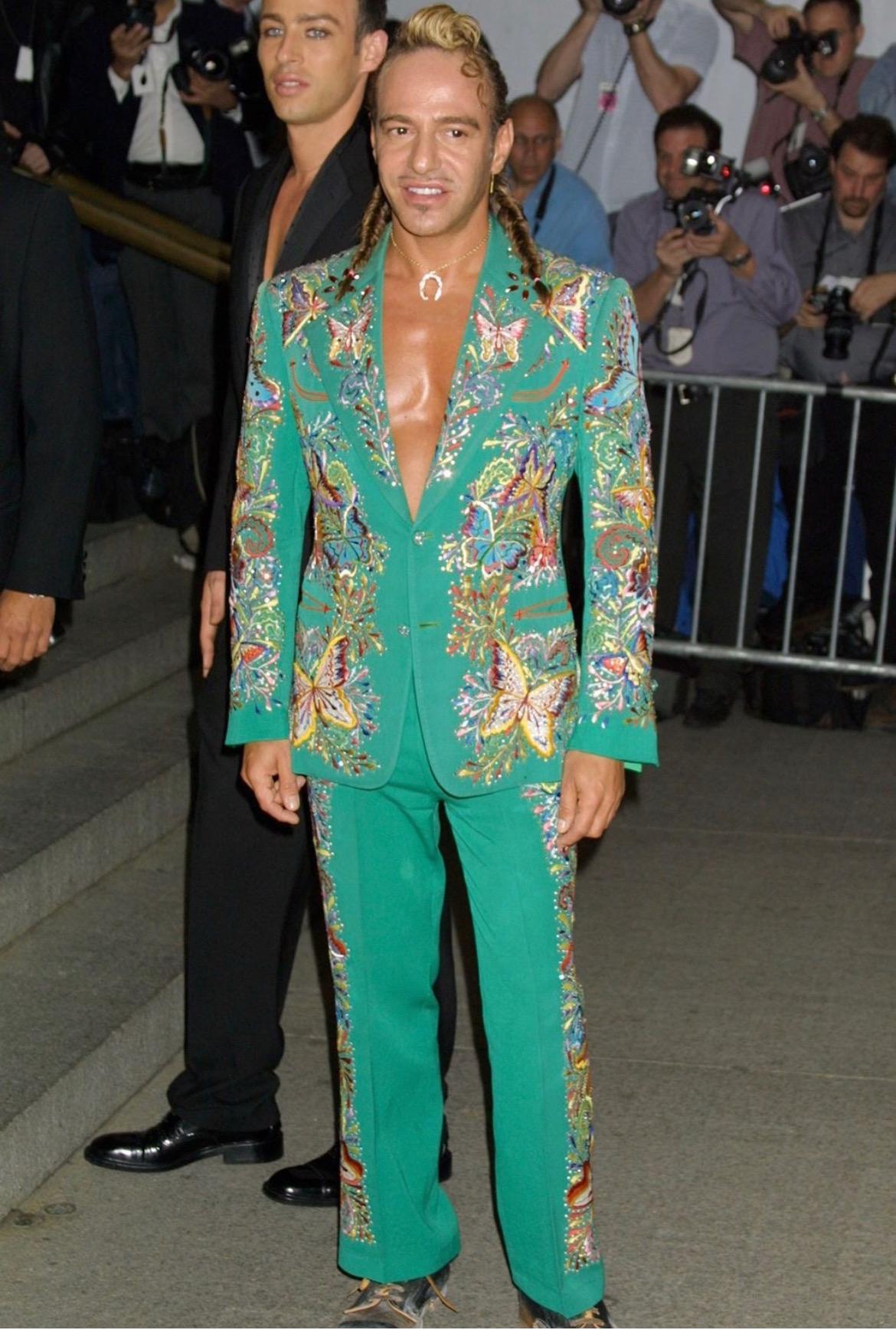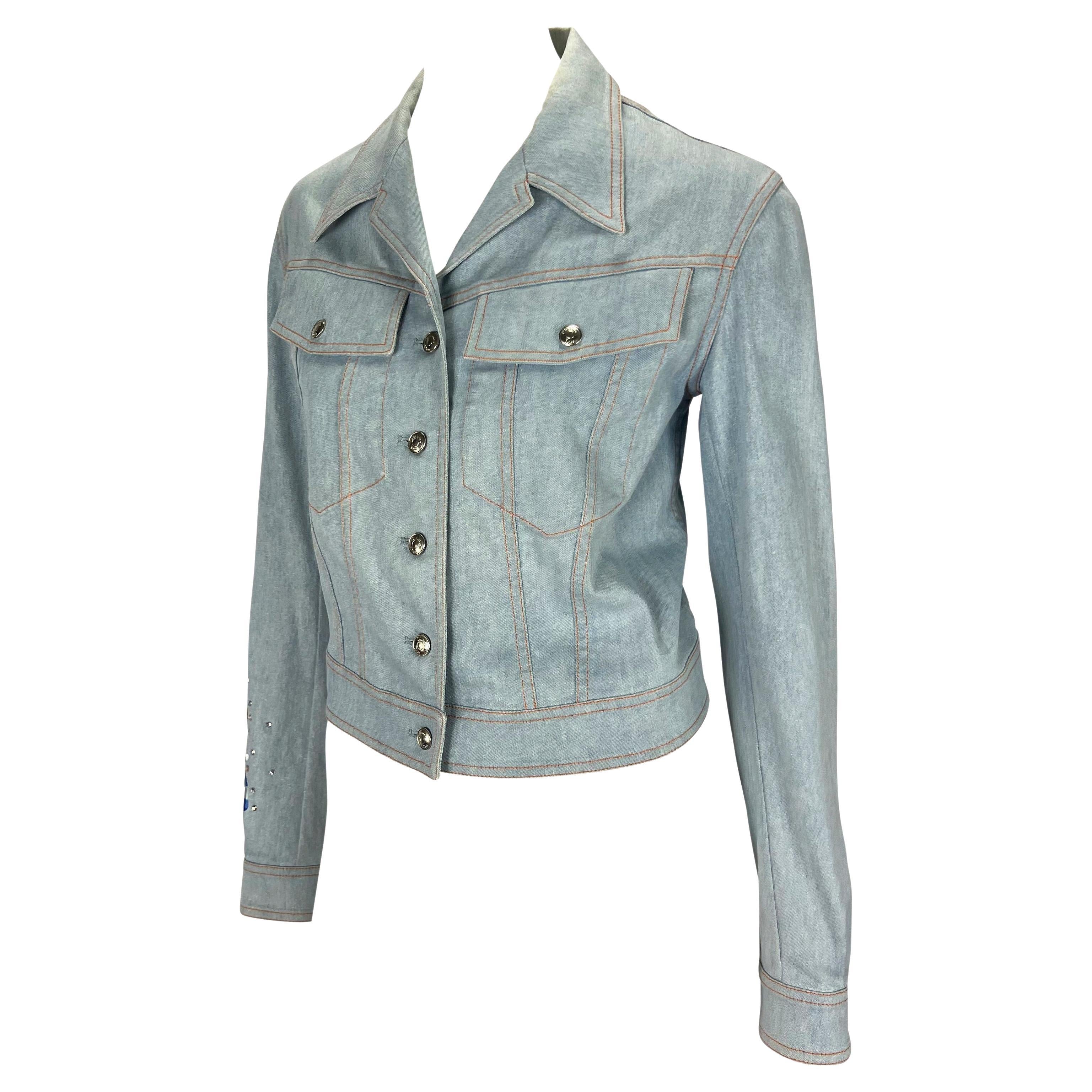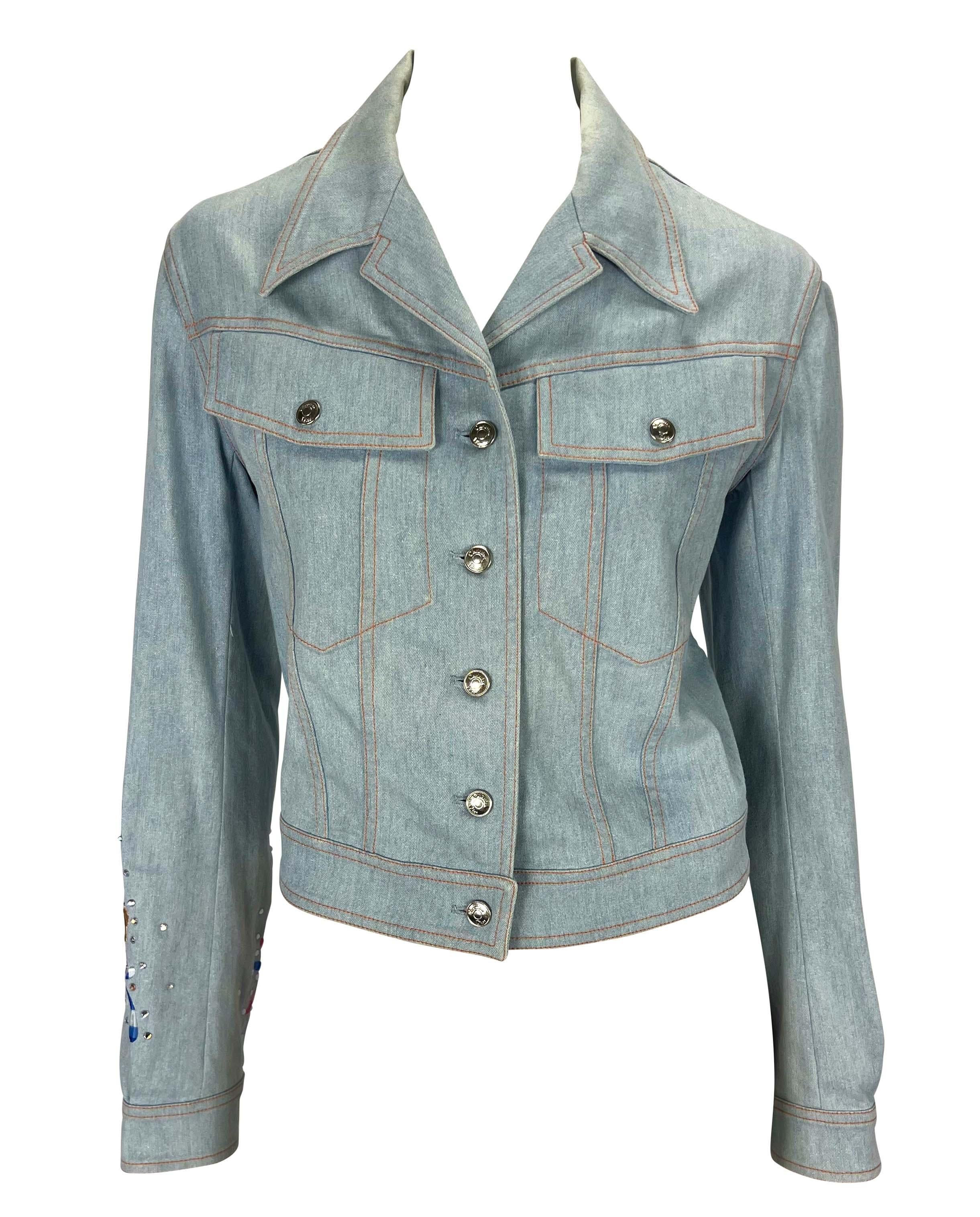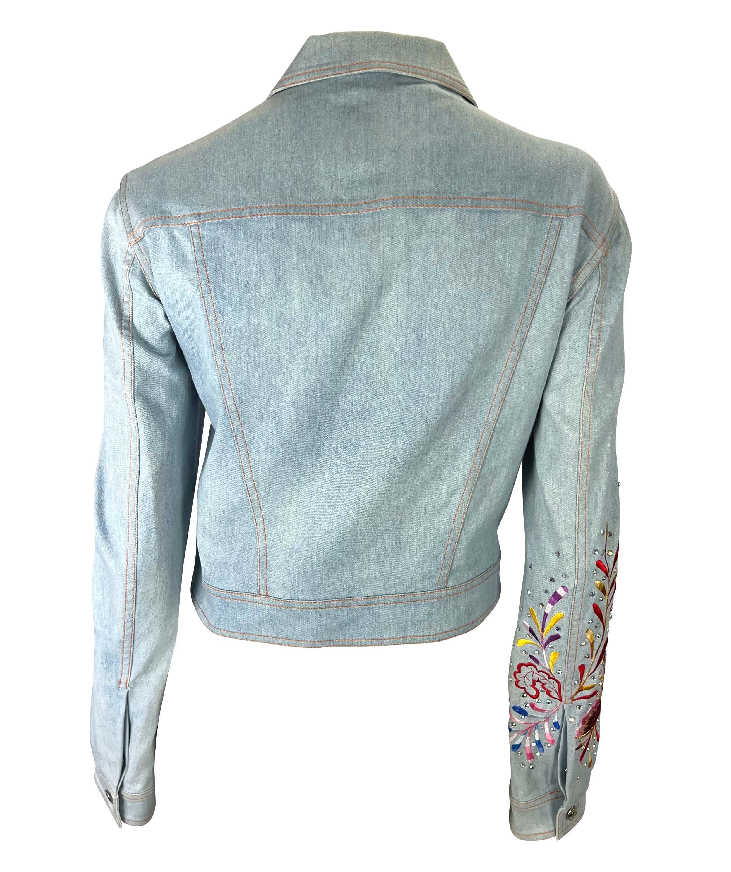 Presenting a light wash embroidered Christian Dior Boutique metallic denim jacket, designed by John Galliano. From the Spring/Summer 2002 collection, this fabulous collared jacket features branded silver-tone buttons at the front closure, front pockets, and cuffs. This jacket is made complete with rhinestones and a multicolor embroidered butterfly pattern on the right sleeve. John Galliano himself wore a suit covered in the same butterfly pattern to the Mat Gala in 2001. Add this perfectly Y2K Galliano for Dior piece to your wardrobe or collection!