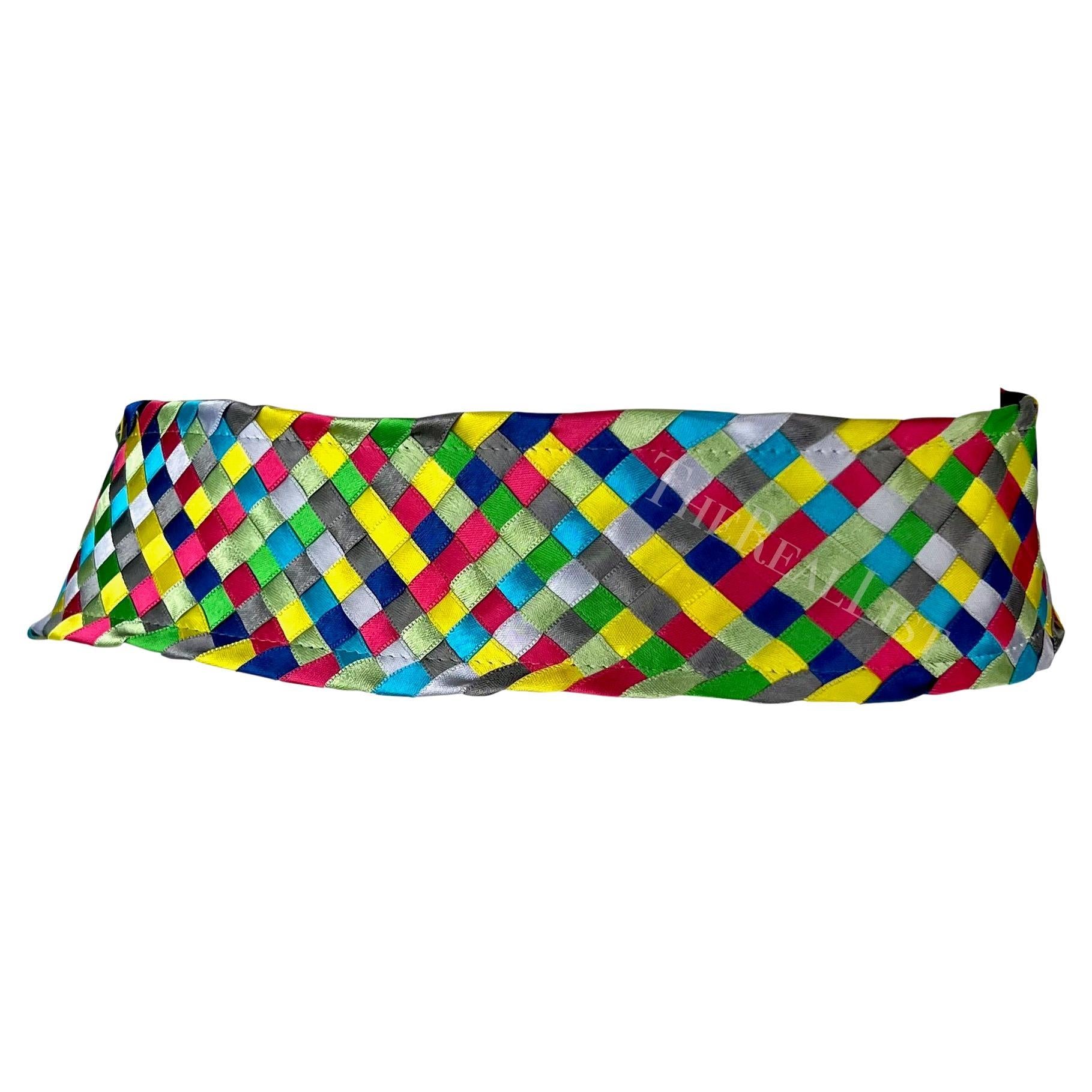 Presenting features a multicolor woven silk ribbon Dolce & Gabbana waist belt. From the Spring/Summer 2002 collection, this belt debuted on the season's runway as part of look 53, modeled by Maggie Rizer. The wide belt is tied with a knot and is made complete with long silk ribbons that fall from the hip. Add this rare Dolce & Gabbana runway belt to your wardrobe or collection!