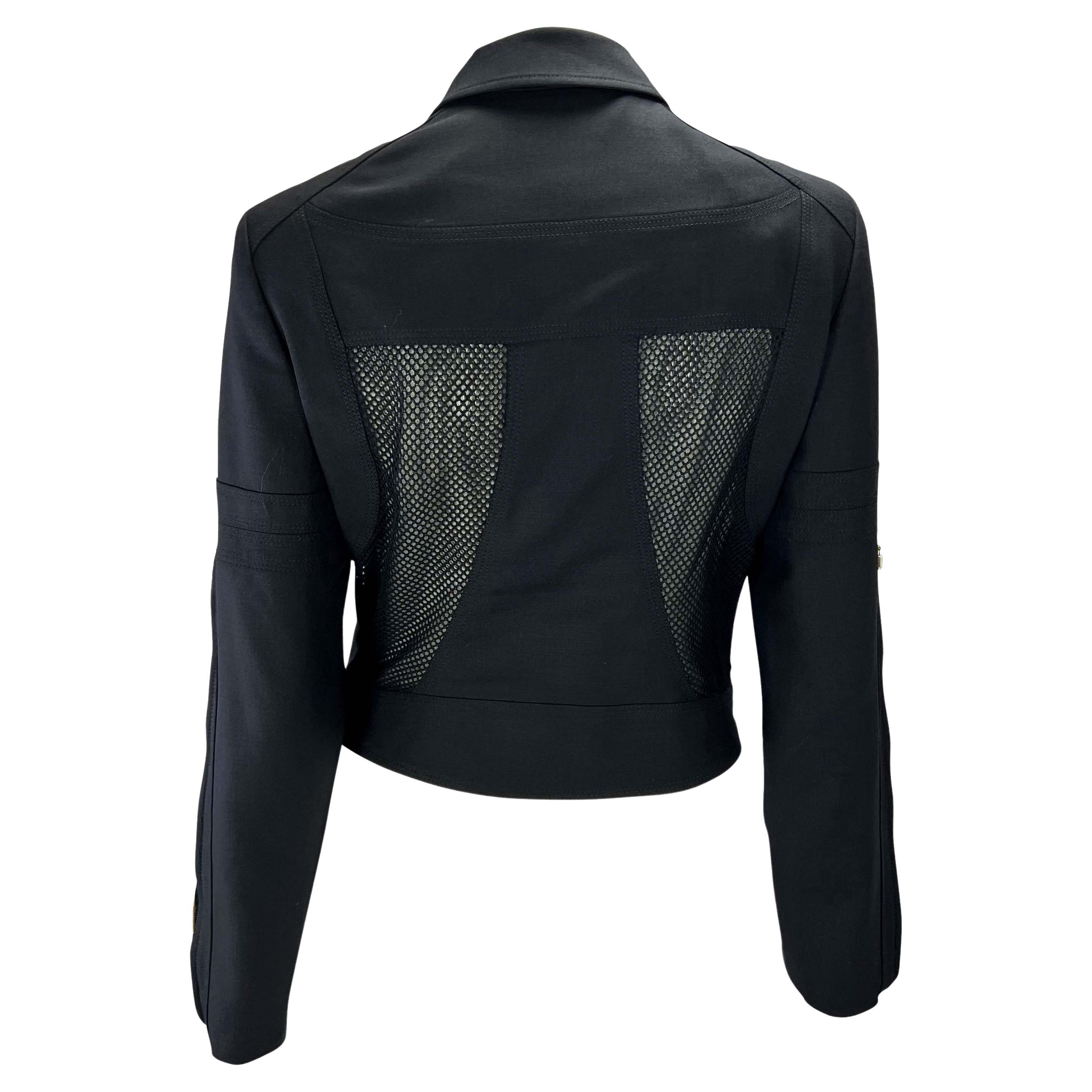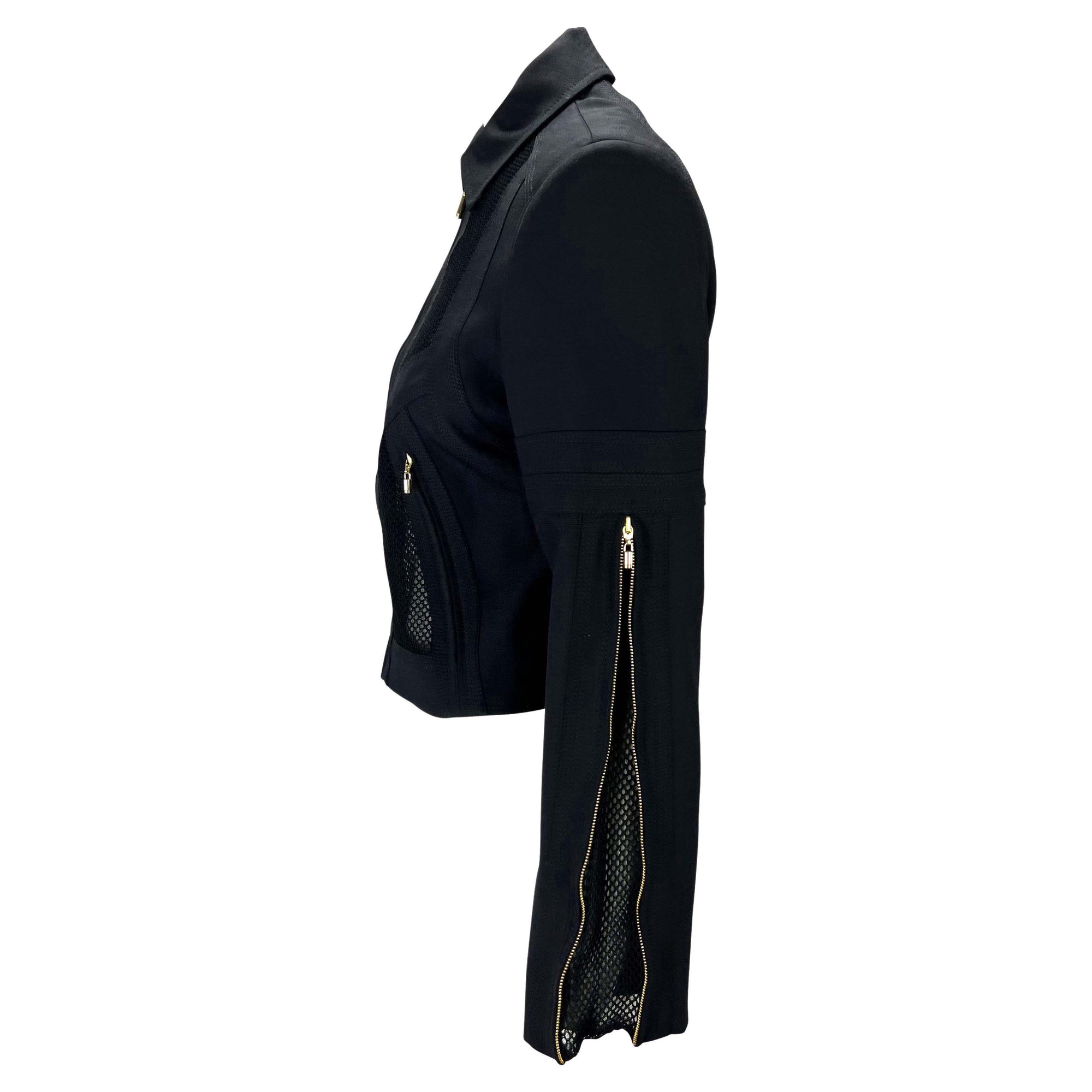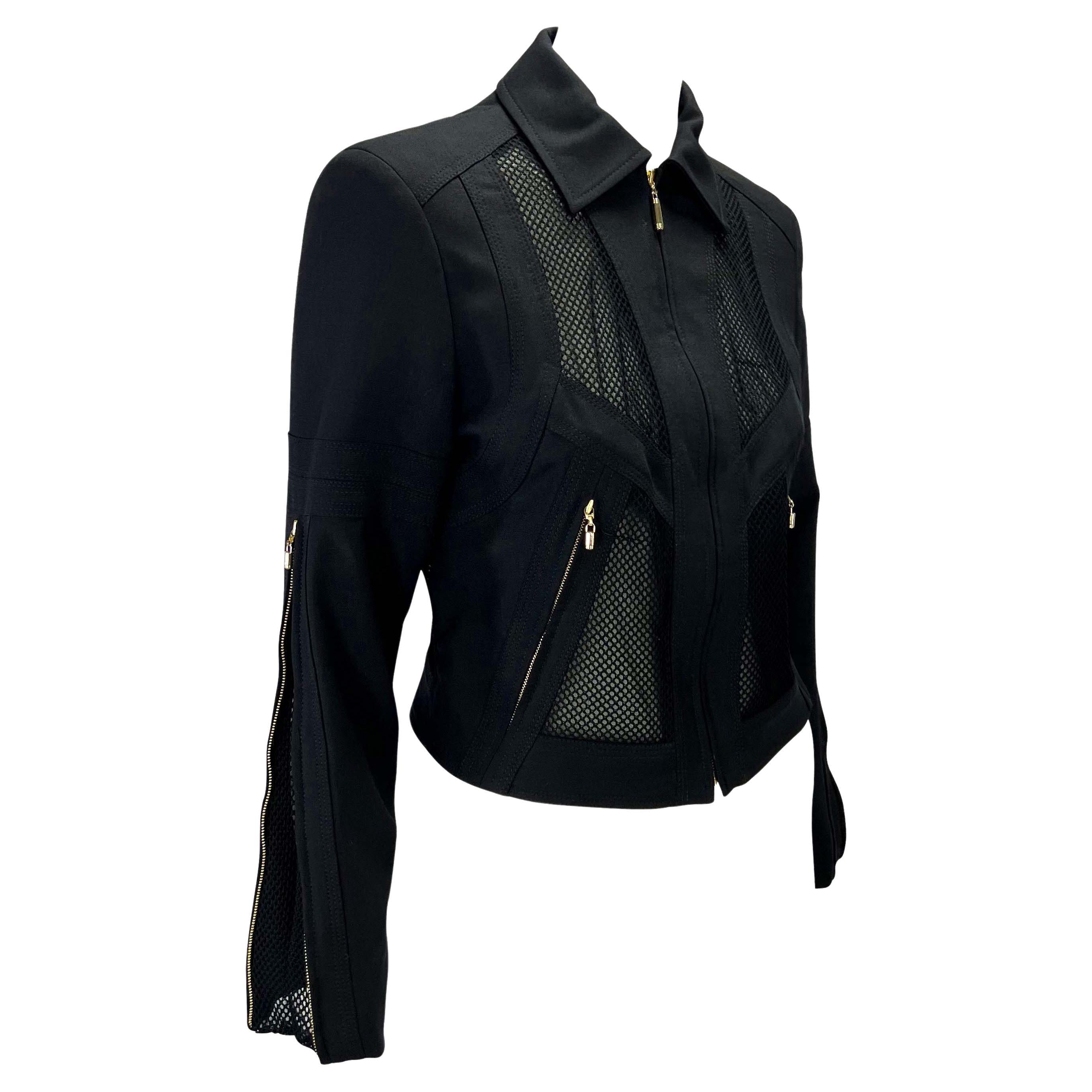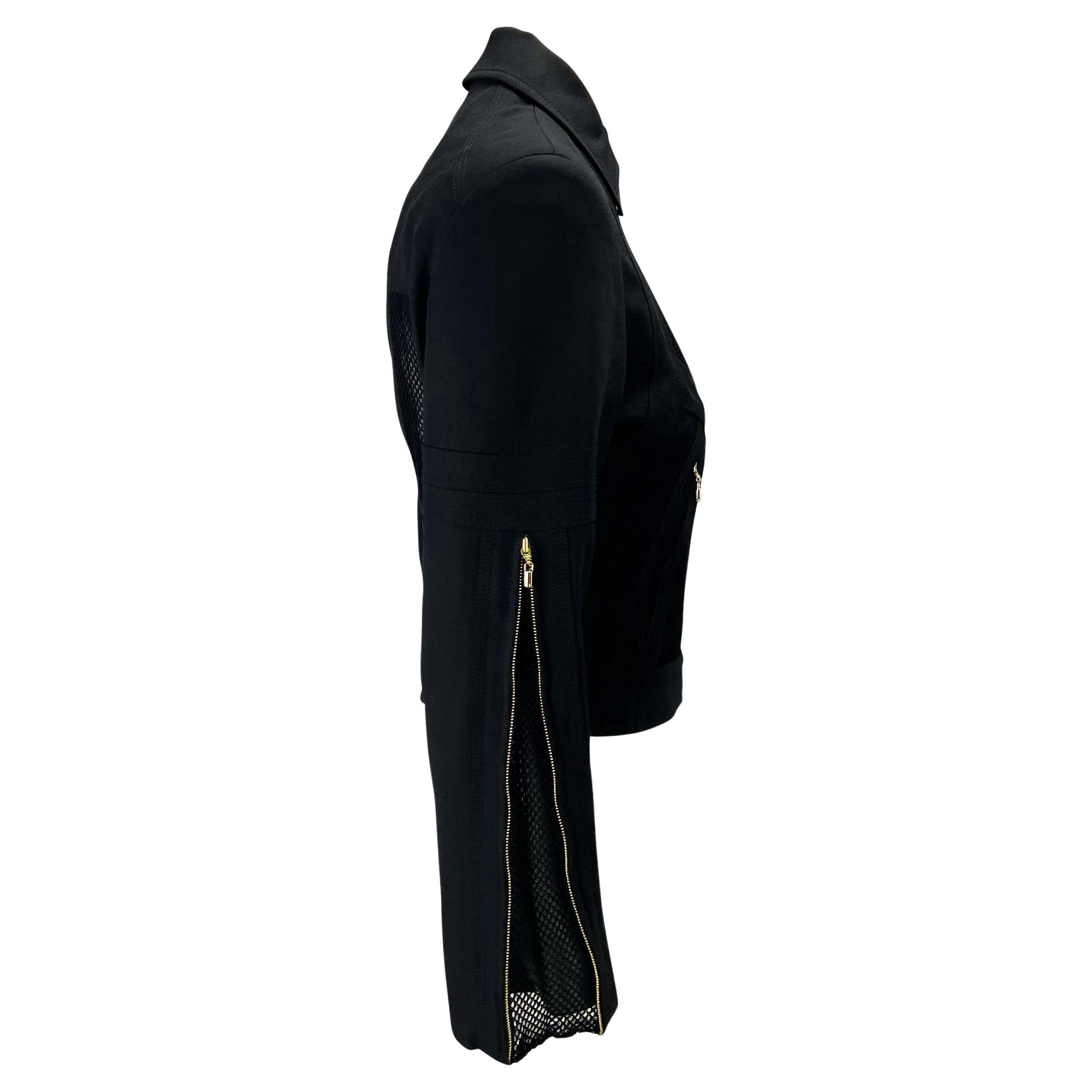 Presenting a cropped black mesh Gianni Versace jacket, designed by Donatella Versace. From the Spring/Summer 2002 collection, this stunning black jacket features panels of mesh at the front and back. The coat is made complete with a collar and gold zipper pulls at the front, pockets, and on the sleeves. This chic piece debuted on the season's menswear runway in leather. Elevated by the sleeve's zippers, the jacket opens to reveal additional sheer mesh webbing.