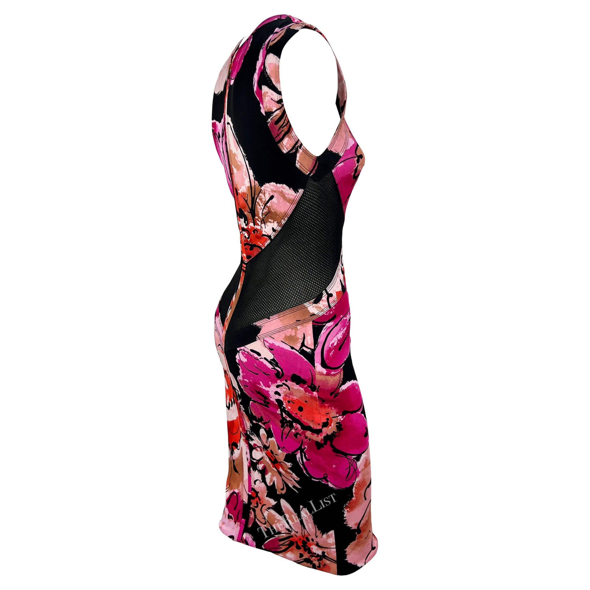 A chic pink floral mini dress by Donatella Versace for Gianni Versace from the Spring/Summer 2002 collection. This stretchy, form-fitting dress showcases a bold abstract floral print.The sleeveless dress features a crew neckline and is made complete with two black mesh panels that wrap from the lower back around to the sides of the dress. This sexy Gianni Versace mini dress adds the perfect pop to any wardrobe.