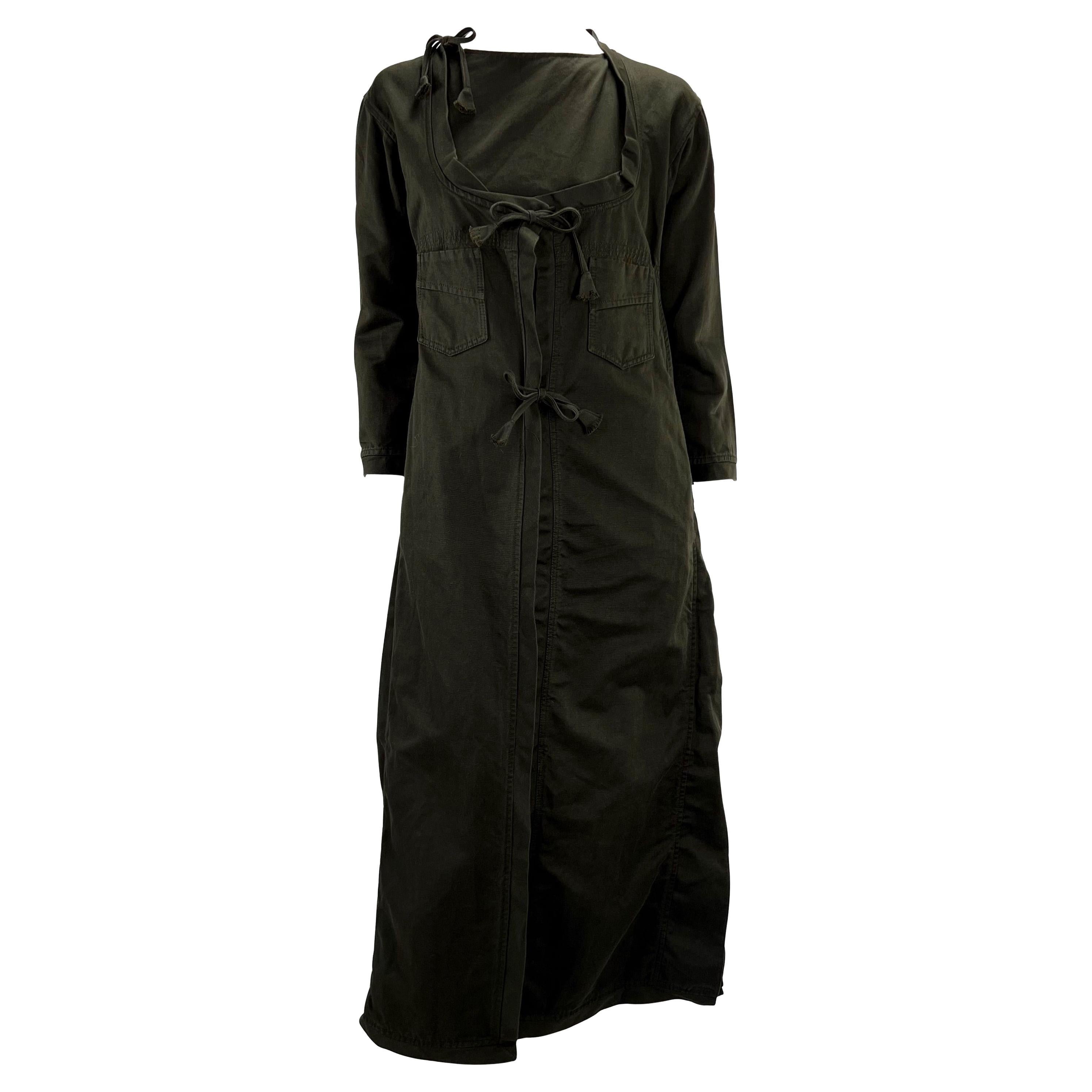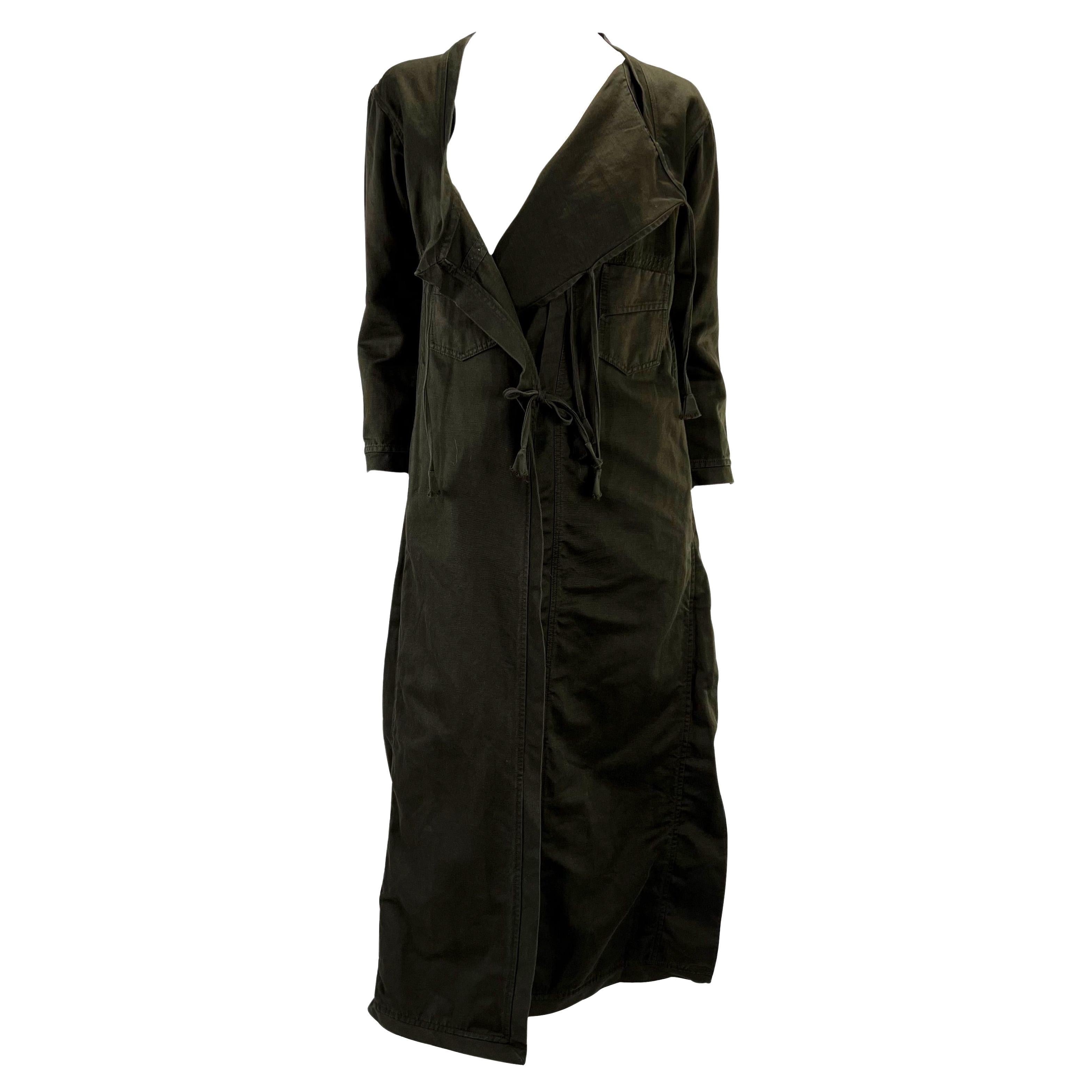 Presenting a dark olive cotton duster coat designed by Tom Ford for Gucci's Spring/Summer 2002 collection. An off-white suede version of this coat debuted on look 4 on Karolina Kurkova on the season's runway. This fabulous coat features tie closures, front pockets, and three-quarter length sleeves. This collection is noted for its departure from Ford's structured designs as this collection ushered in a relaxed and laid-back feeling with desert-chic-inspired attire. This must-have rare coat is the perfect piece to add to any Gucci by Tom Ford lover's collection!
