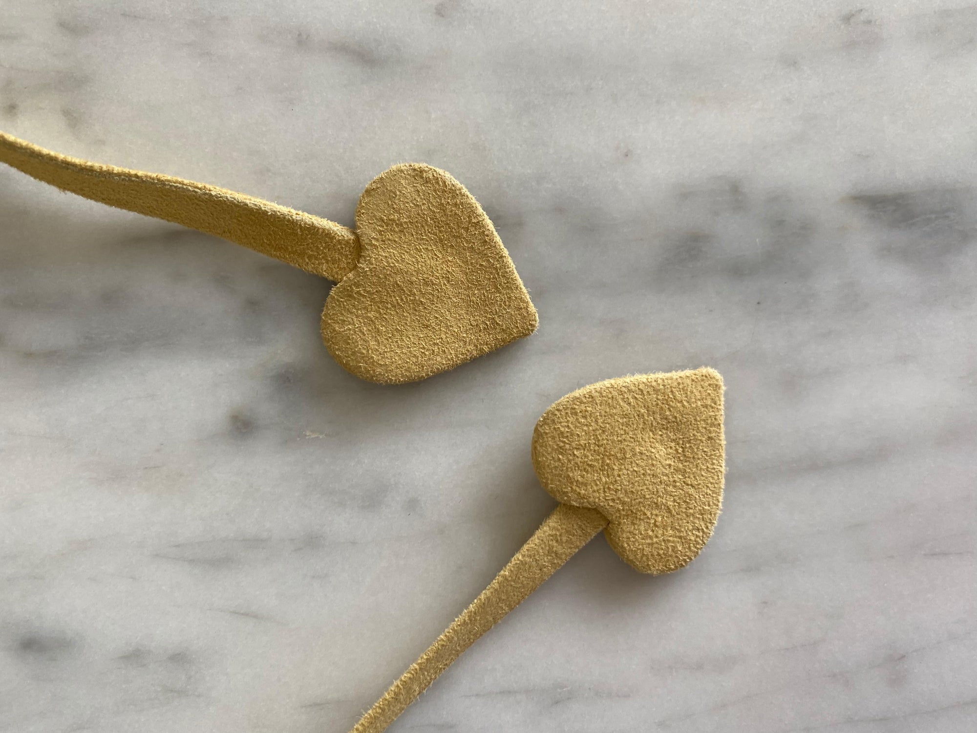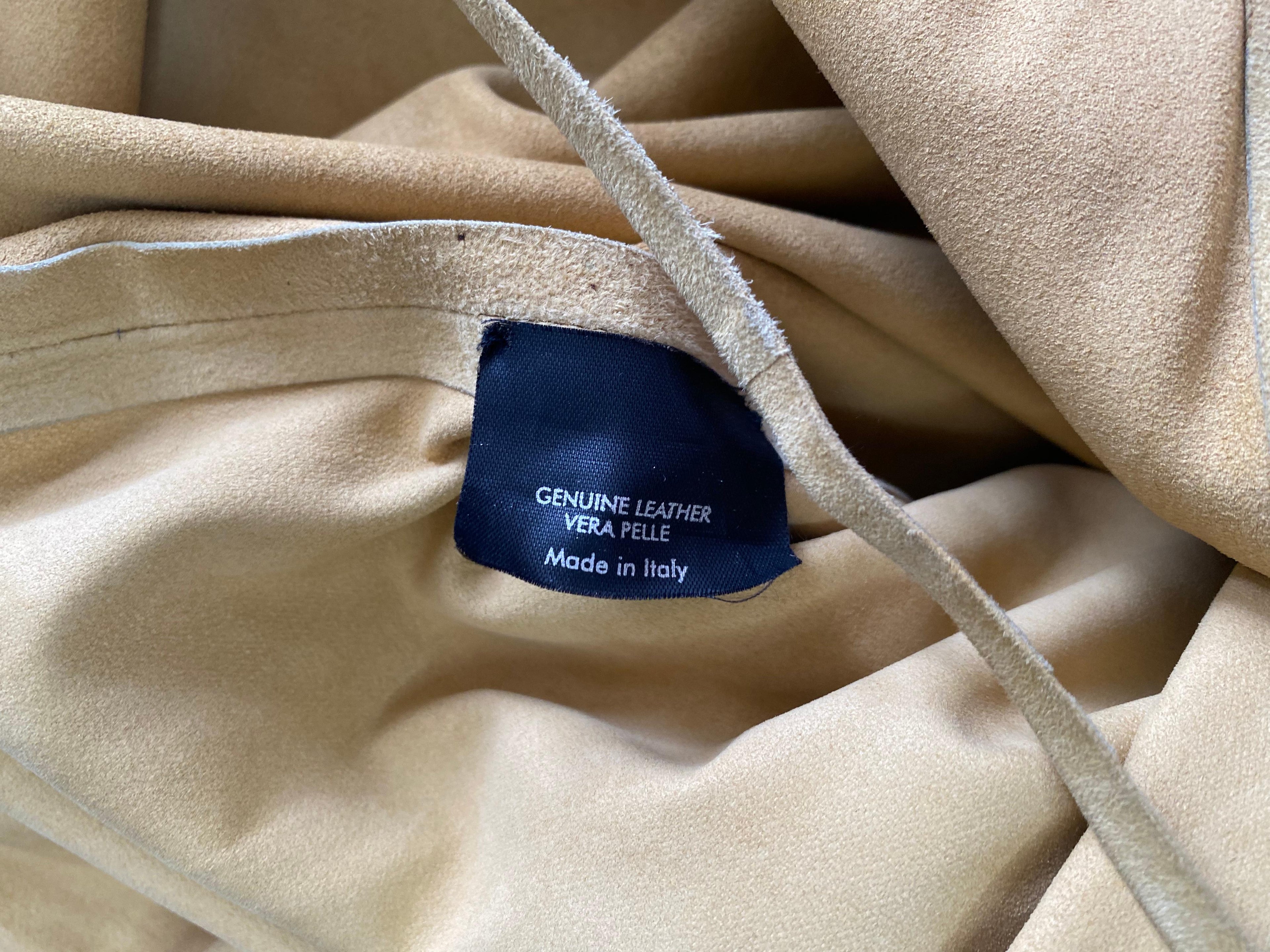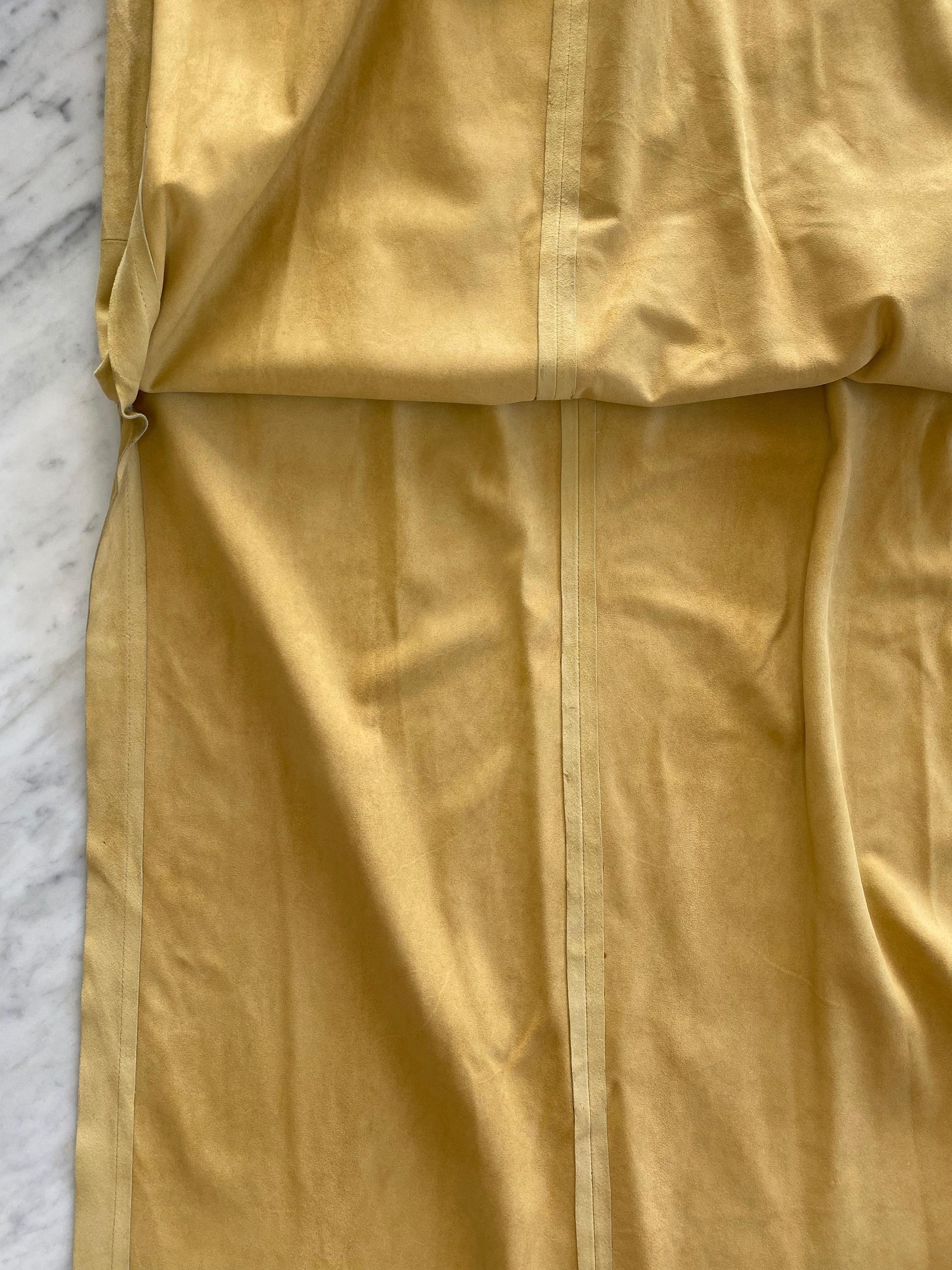 Presenting a fabulous tan suede dress from Gucci's Spring/Summer 2002 collection, designed by Tom Ford. Constructed purely of suede, this dress debuted on the season's runway and featured a tie closure at the top and a suede wrap-around belt adorned with hearts at both ends to tie the waist. The dress is simple and sexy, with two slits on either side. This dress was also featured in the season's ad campaign on Rie Rasmussen, photographed by Terry Richardson.