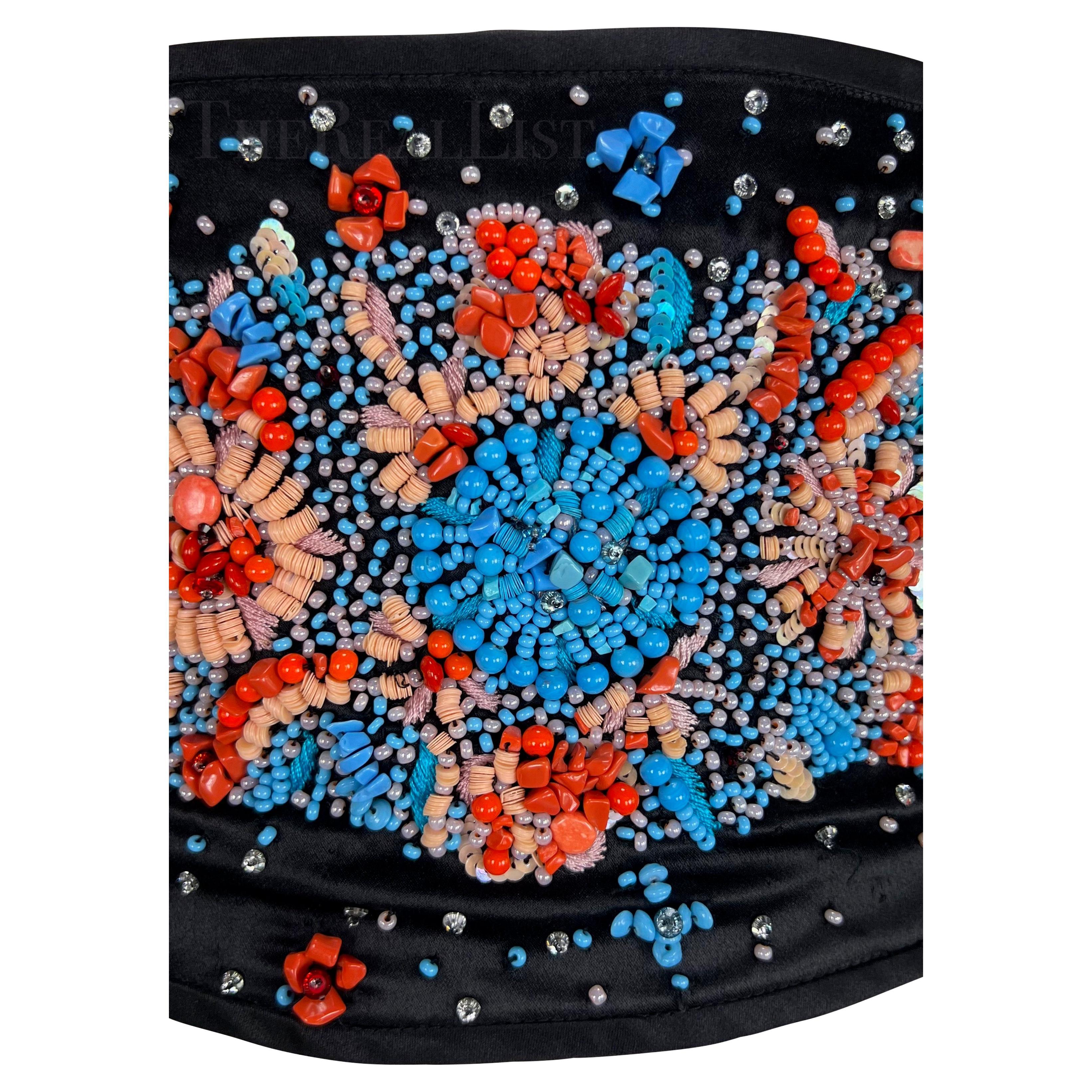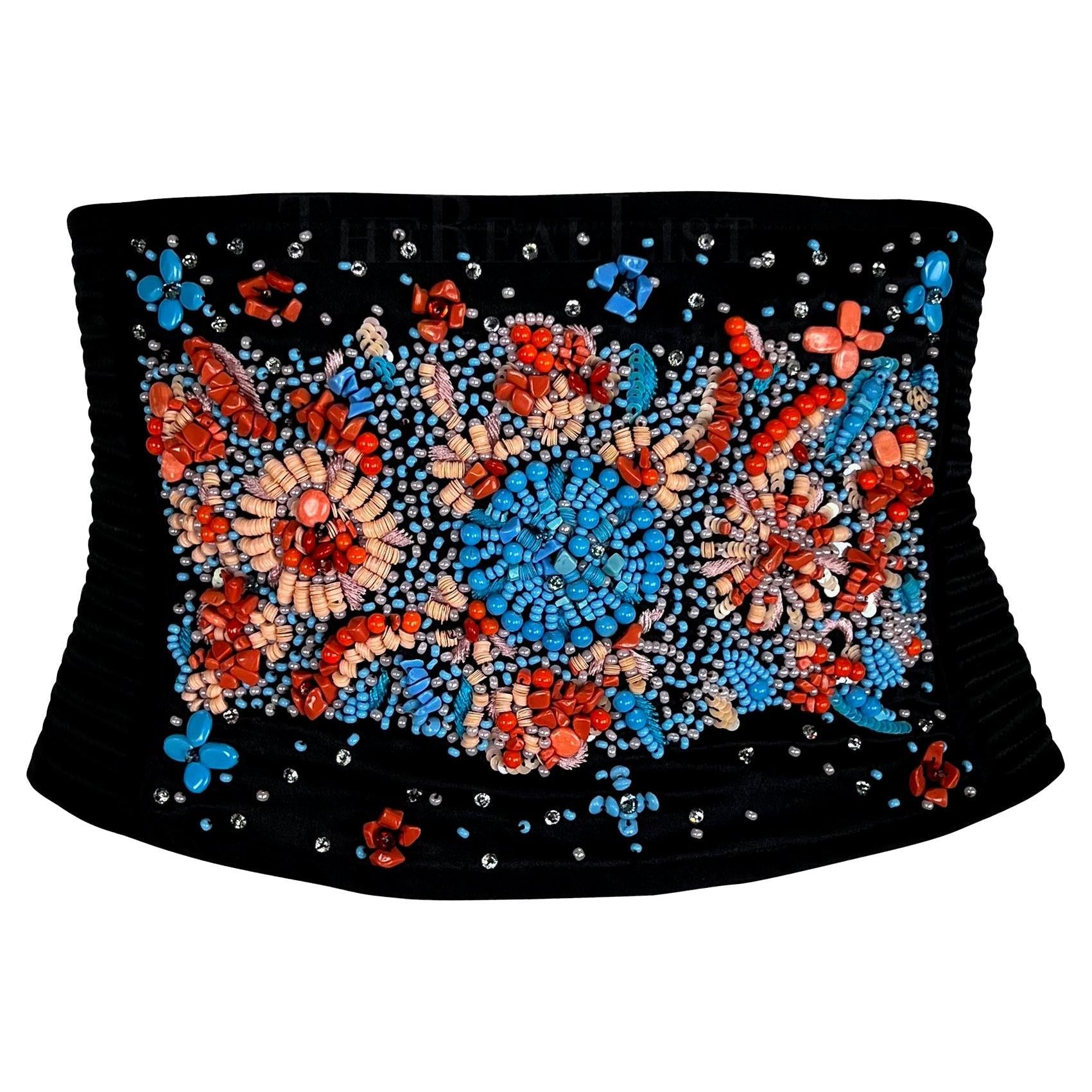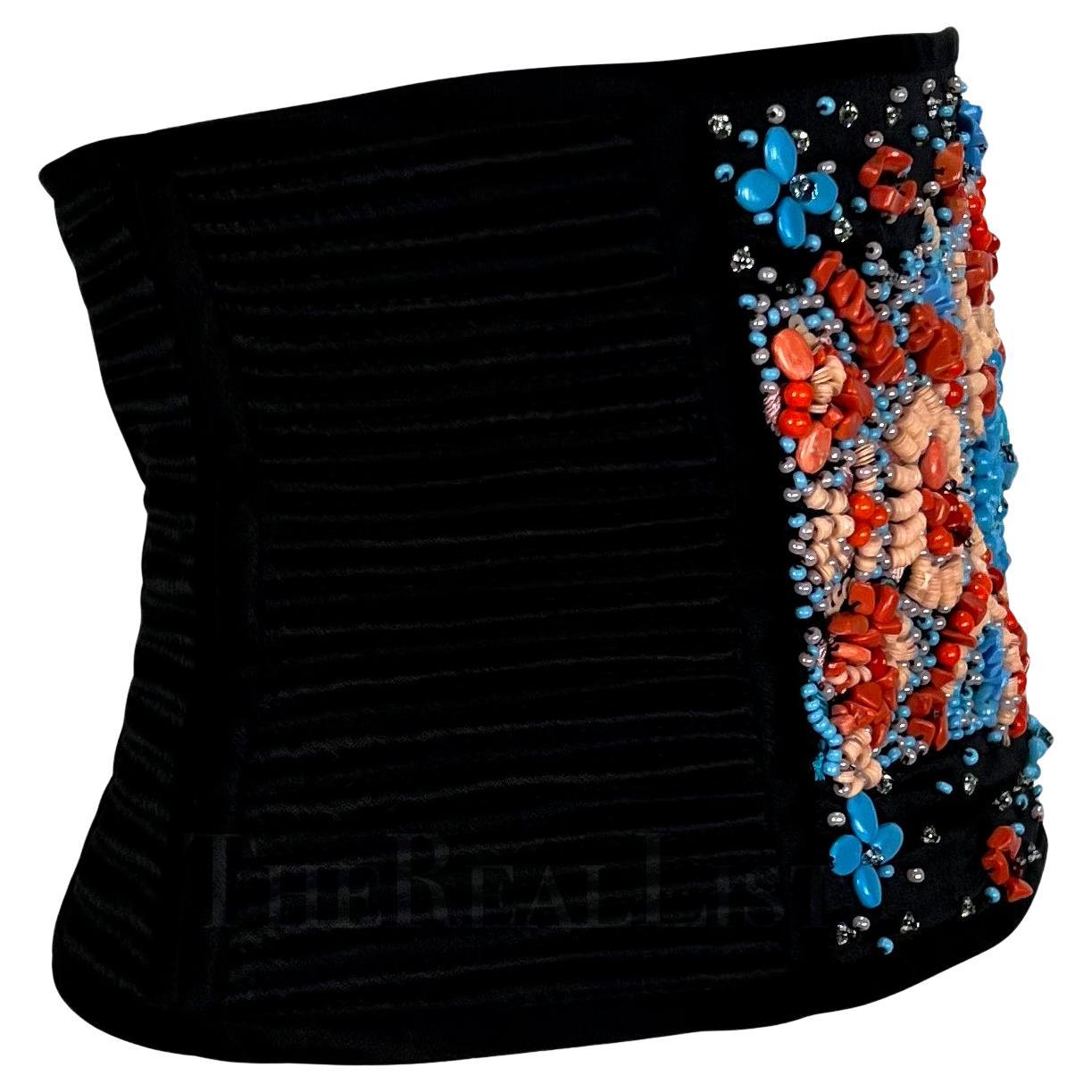 Presenting a fabulous black beaded Valentino waist belt. From the Spring/Summer 2002 collection, this chic waist belt debuted on the season's runway as part of look 71, modeled by Hannelore Knuts. Also appeared in the season's ad campaign on Caroline Ribeiro, captured by Steven Meisel. Covered in intricate turquoise and coral beads, this quilted belt is the perfect unique addition to any wardrobe.