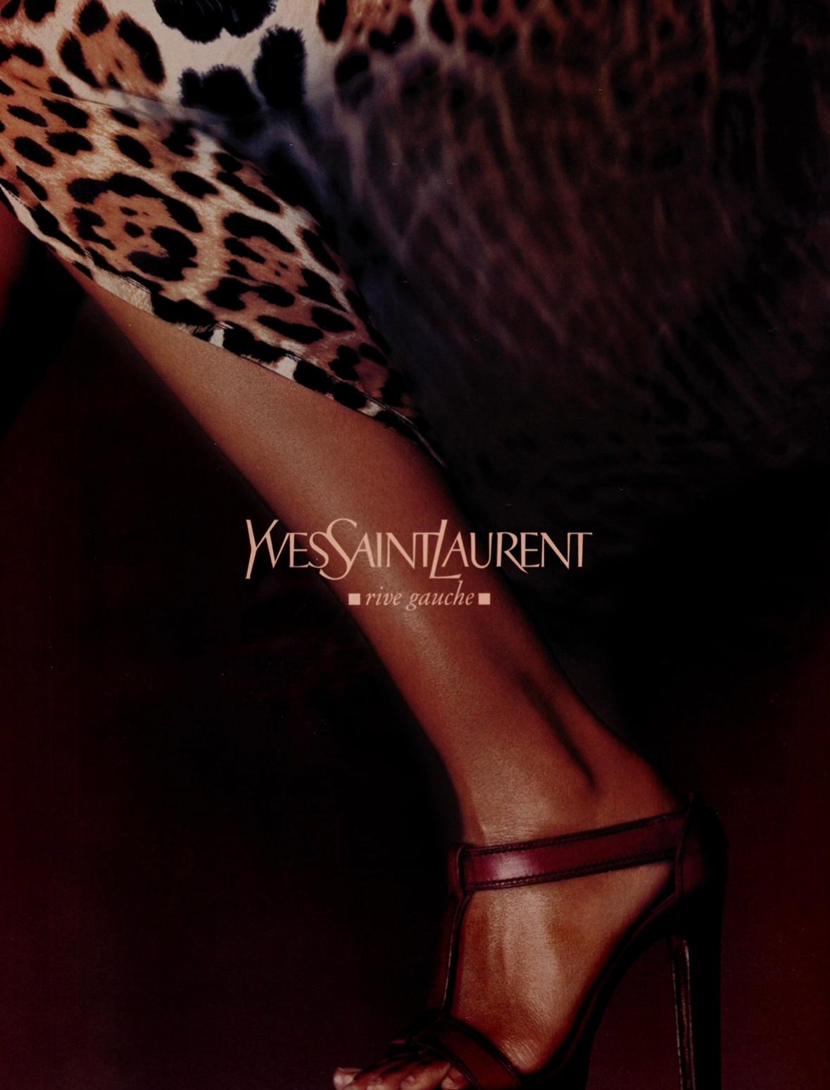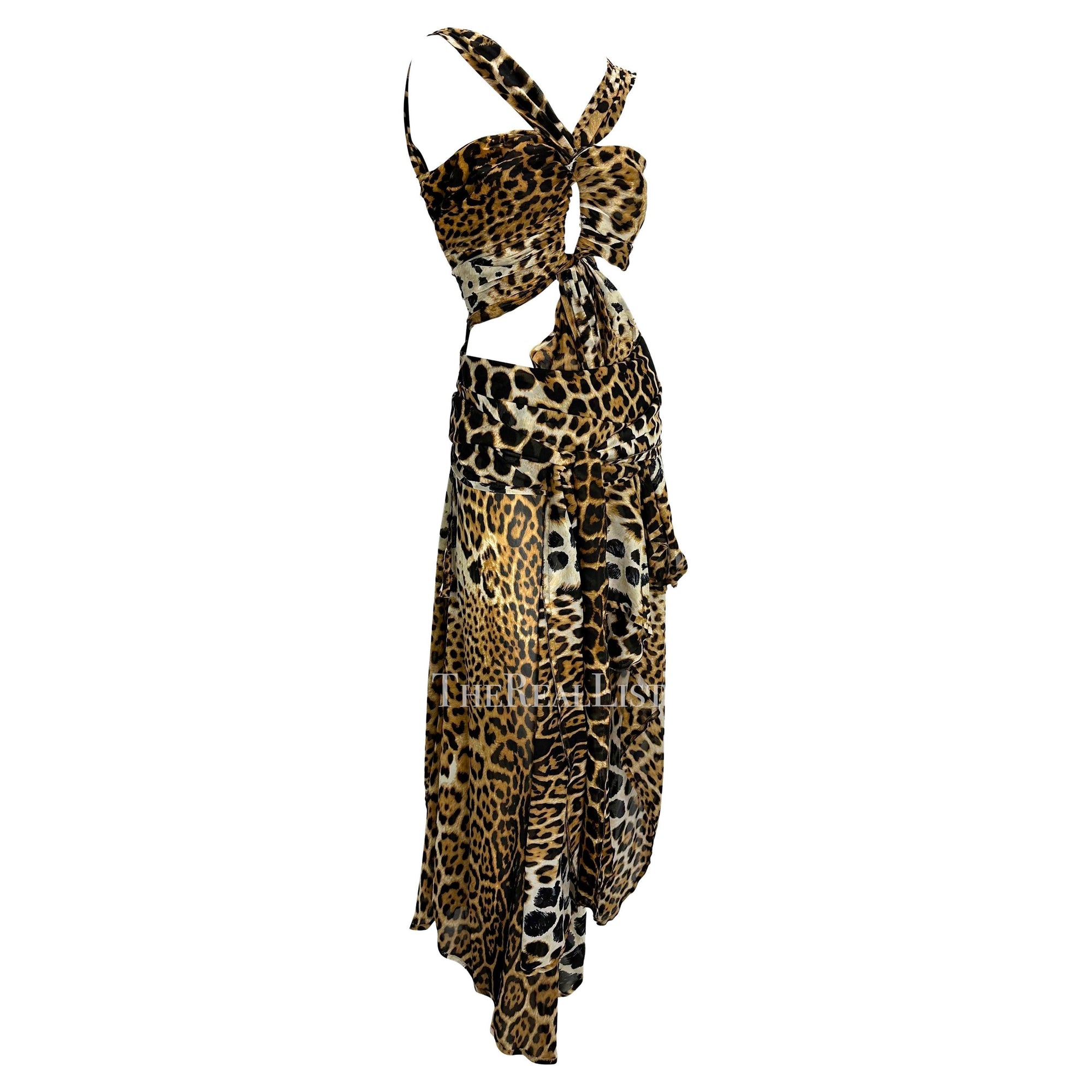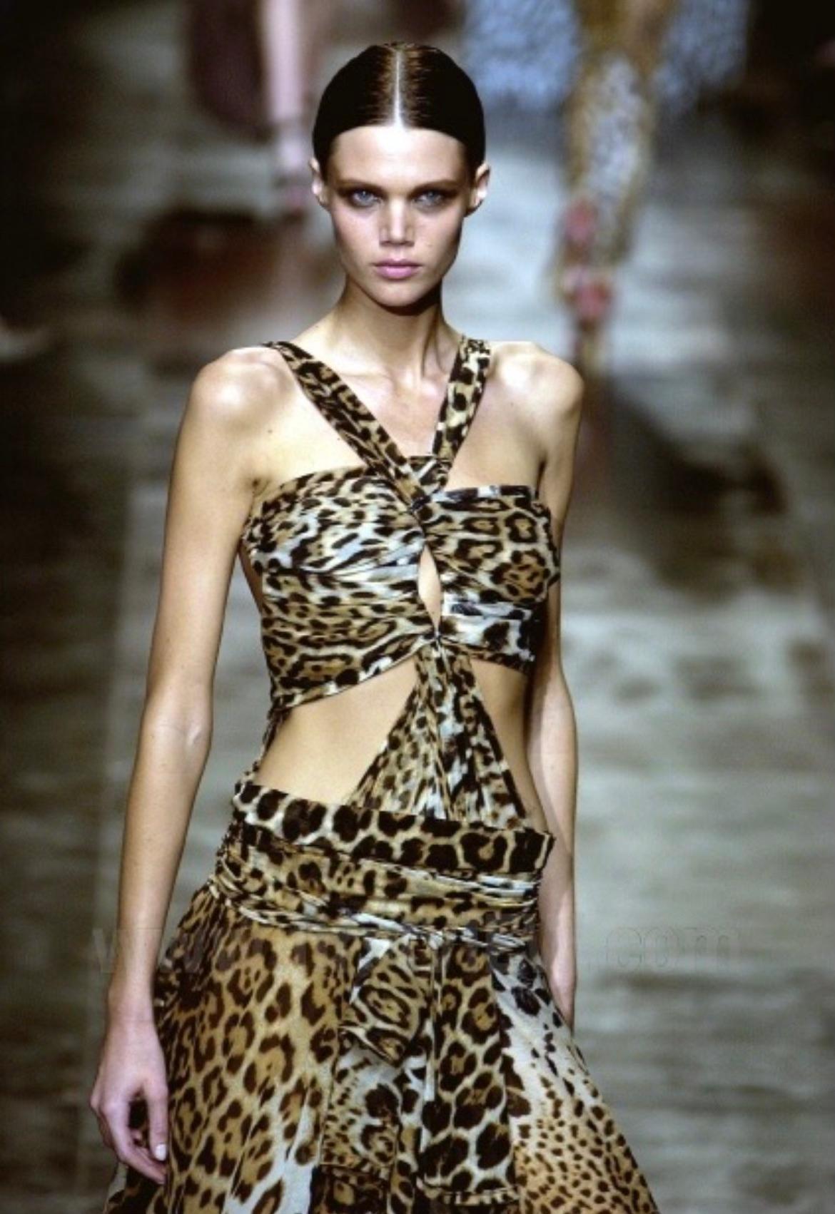 Presenting an incredible jaguar print, Yves Saint Laurent Rive Gauche's backless gown designed by Tom Ford. From the Spring/Summer 2002 collection, this fabulous cut-out gown debuted on the season's runway as Look 42, modeled by Diana Gärtner. It was also highlighted in the season's ad campaign on Liya Kebede, captured by Steven Meisel. This genuinely stunning dress is constructed of a wrap-style bodysuit with long strips of a stretchy silk blend, creating a high-slit skirt, exposed back, cut-outs at the sides, and an eyelet between the breasts. Check out our storefront for other YSL by Tom Ford gems from this collection and others!