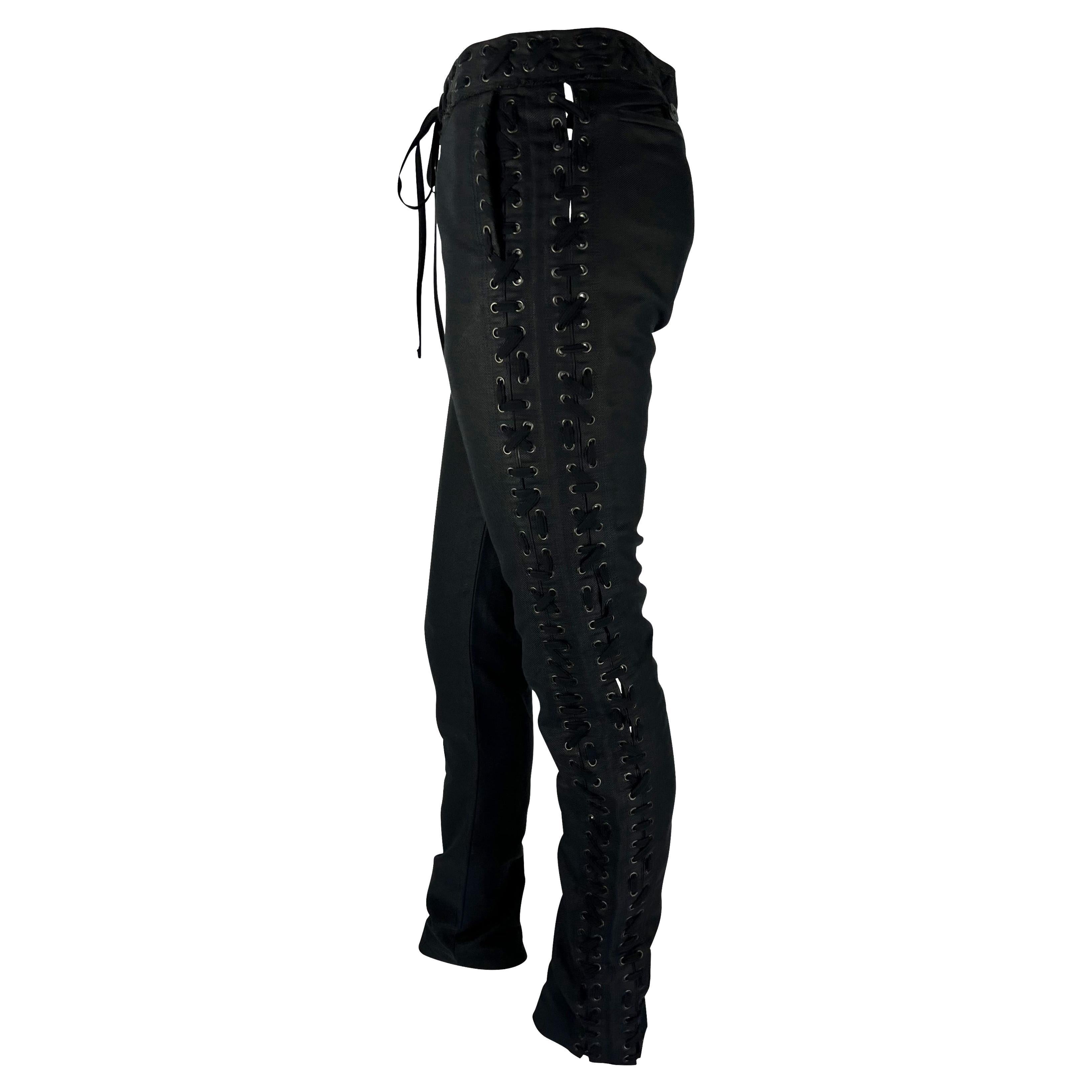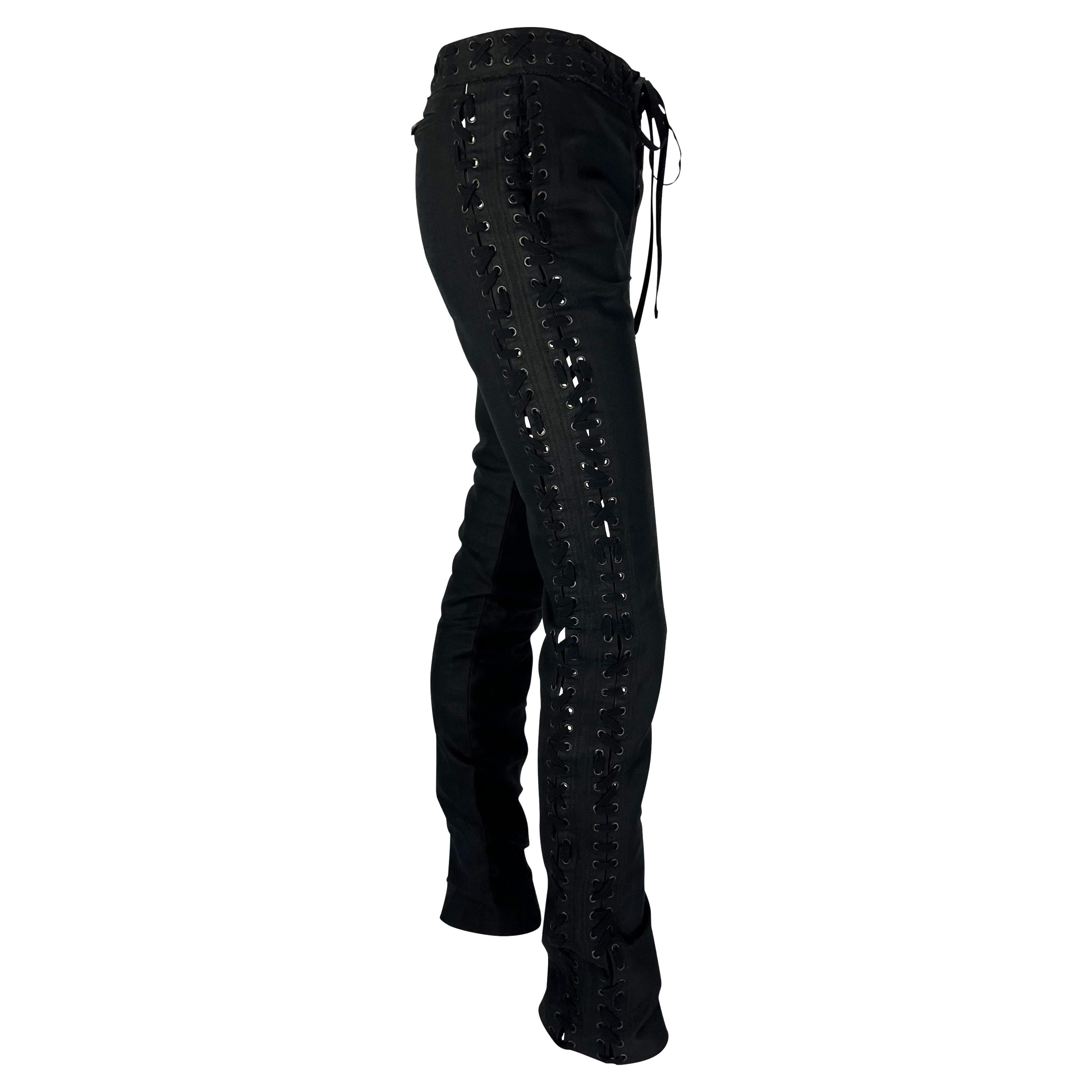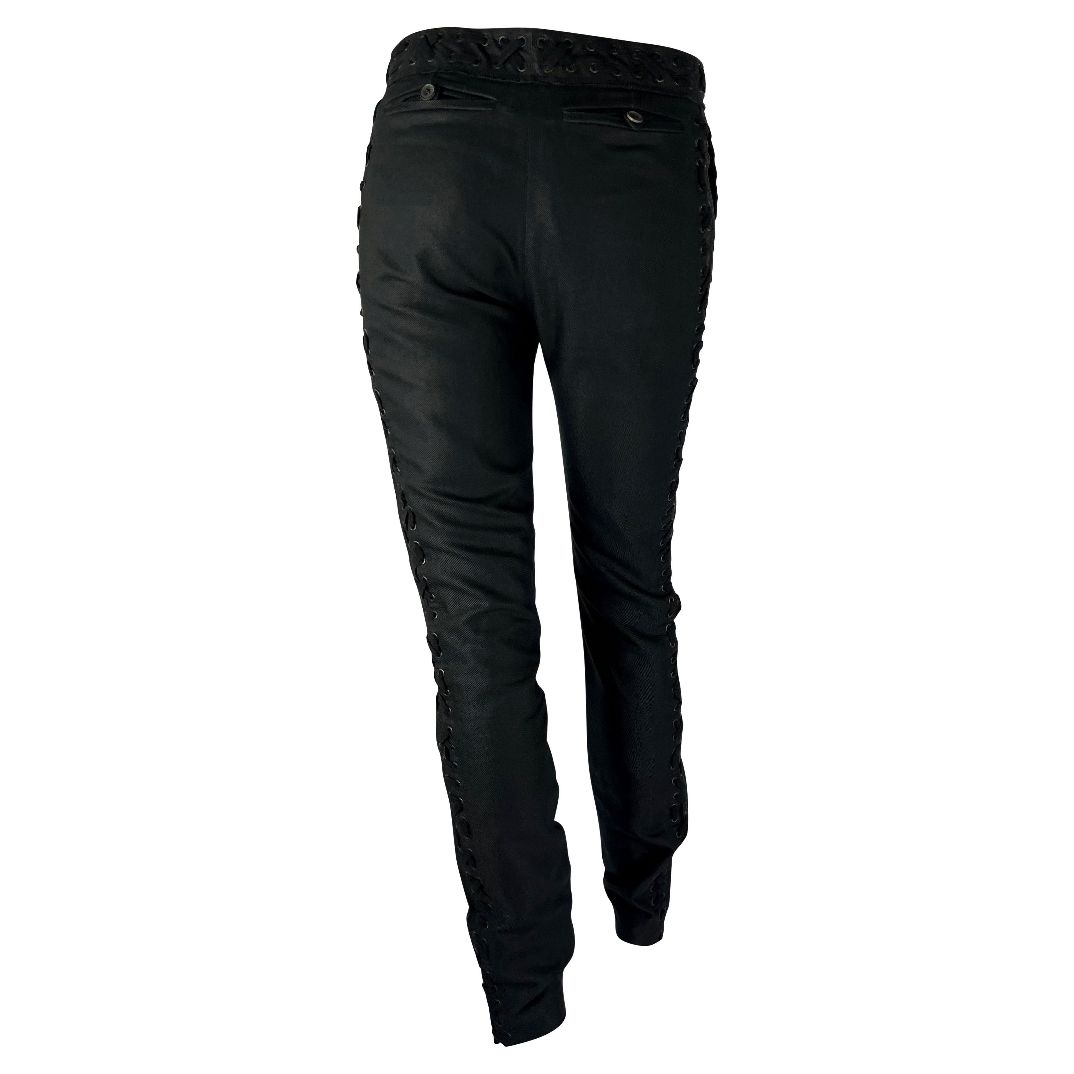 Presenting a pair of lace-up Yves Saint Laurent Rive Gauche pants, designed by Tom Ford. From the Spring/Summer 2002 Safari collection, these black pants feature lace details on both sides, at the waist, and crotch. Many looks on the season's runway and ad campaign featured similar lace details. These pants are amped up with corset-esque lace-up details and are the perfect addition to any wardrobe!