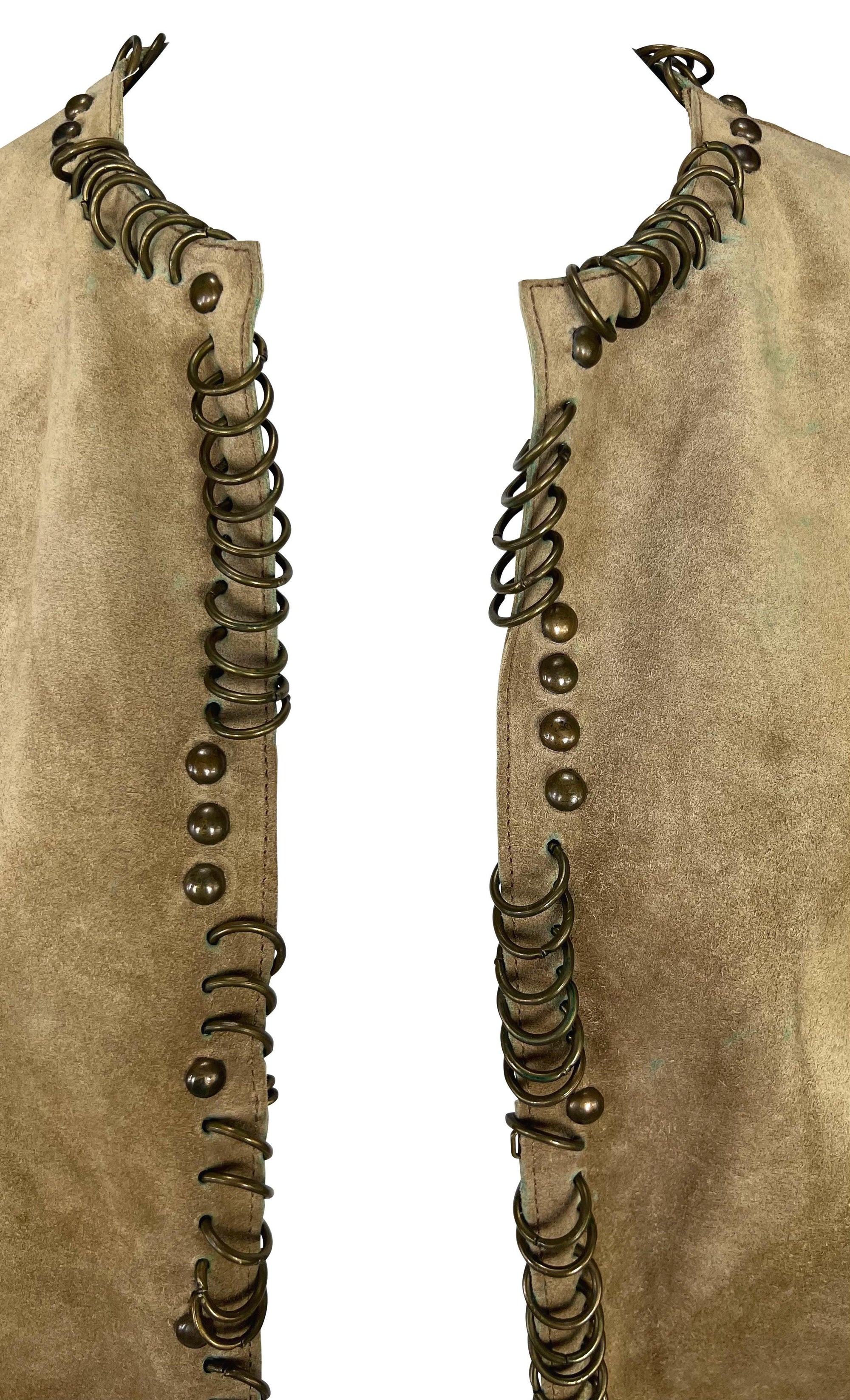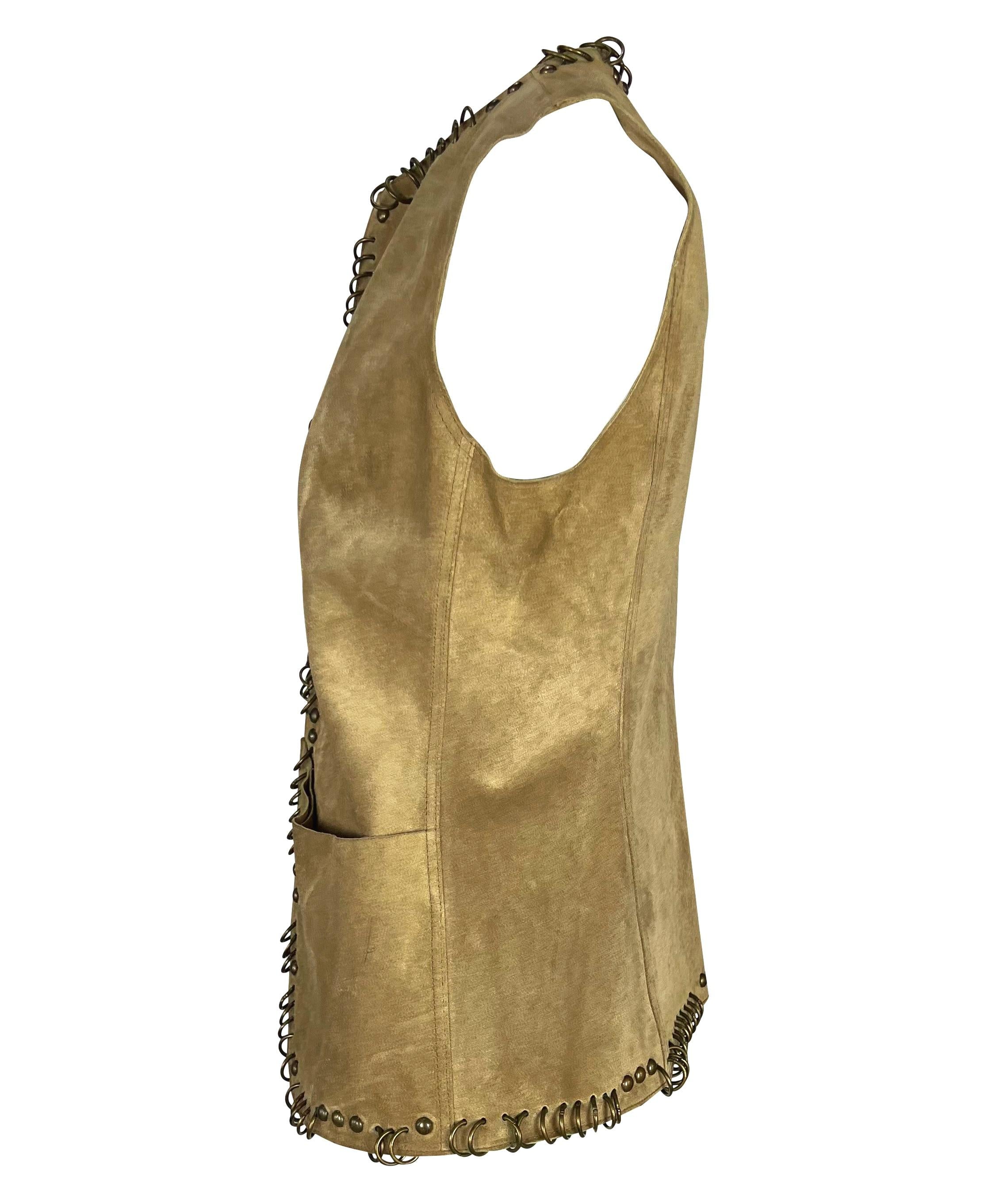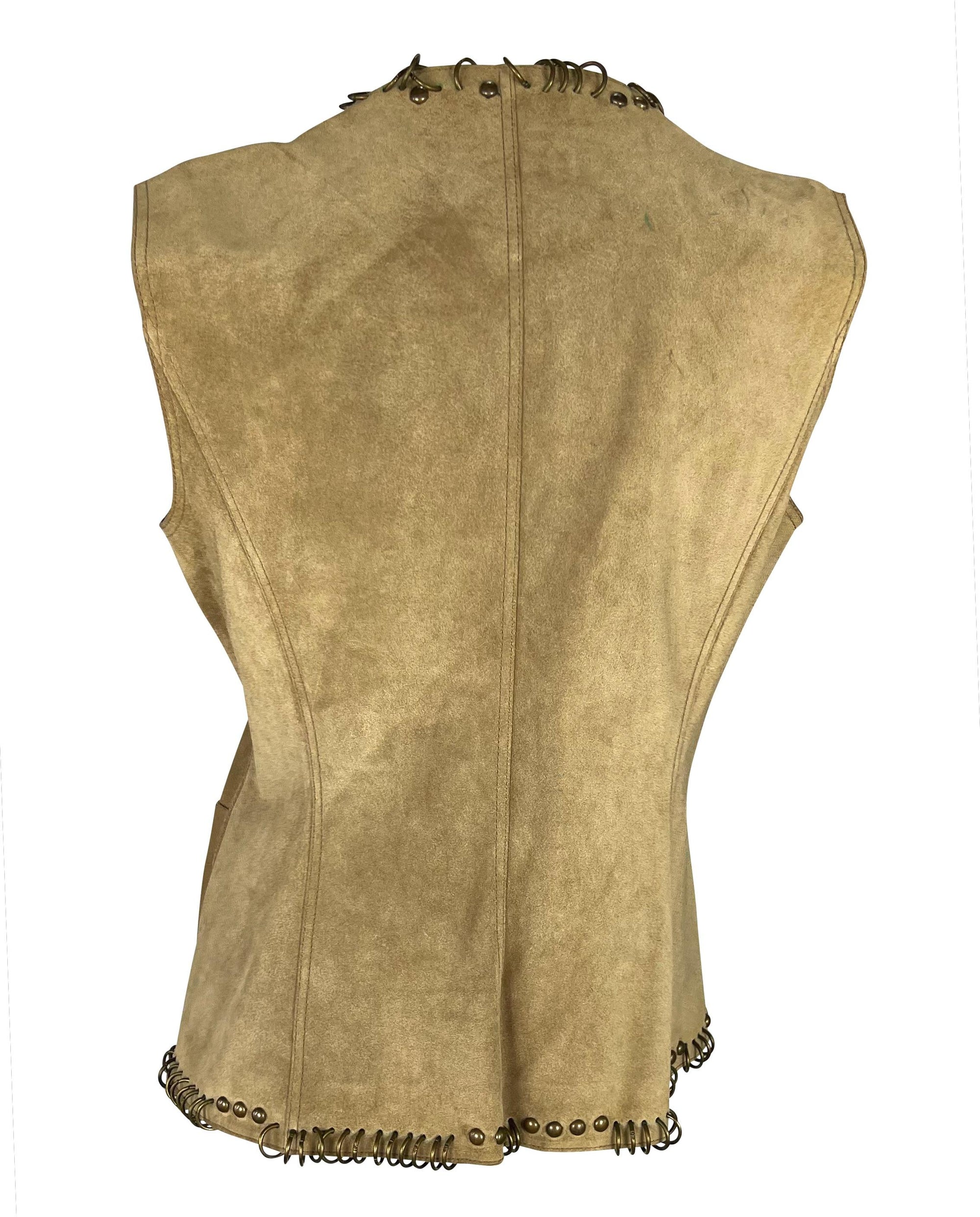 Presenting a fabulous camel-colored suede Yves Saint Laurent Rive Guache vest, designed by Tom Ford. From the Spring/Summer 2002 collection, this safari-inspired piece features pierced metal and riveted details along the neckline, down the front, and at the hem. Several pieces from this season's runway featured the same metal details including the clutch.