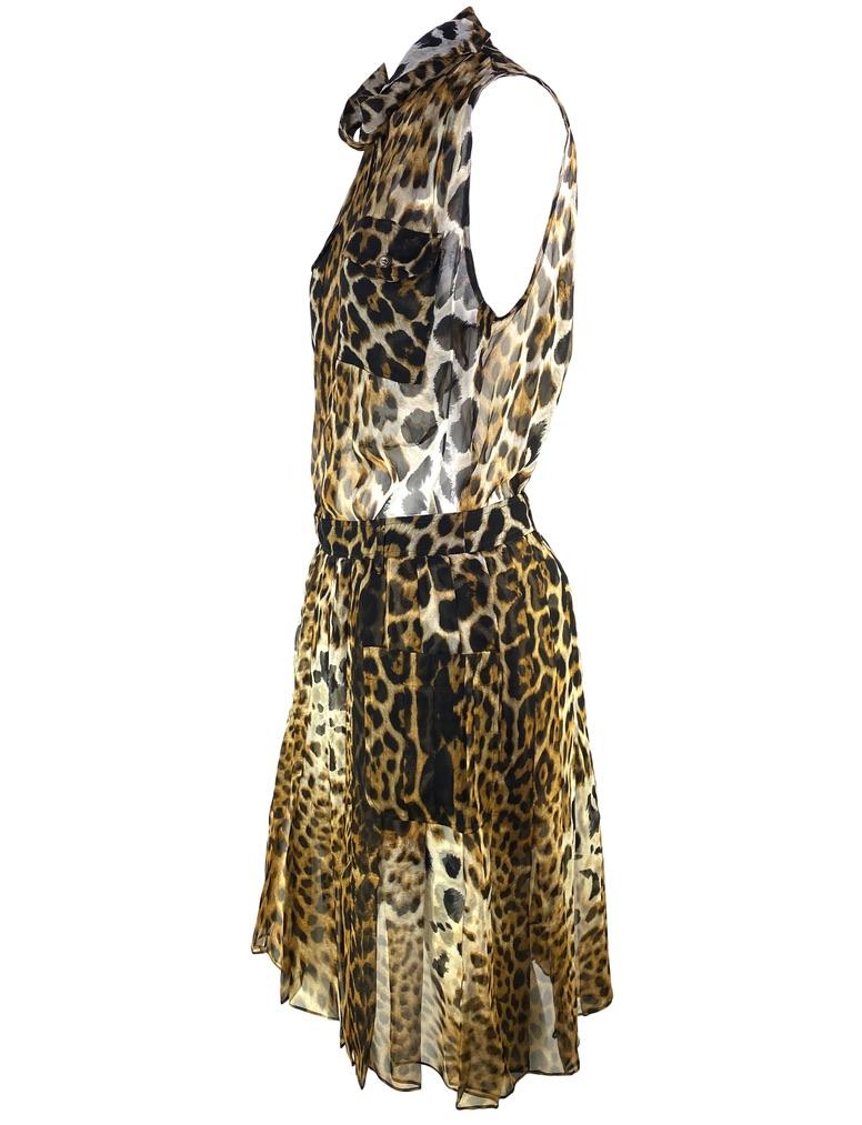 Presenting a sheer printed silk top and pleated skirt set designed by Tom Ford for Yves Saint Laurent Rive Gauche's Spring/Summer 2002 collection. The fabric is printed in the season's signature jaguar print, with the brand's YSL monogram peppered throughout. Two oversized pockets at the bust reduce the sheerness by adding extra fabric, and the neckline features a unique tie closure that buttons to the sides of the collar.