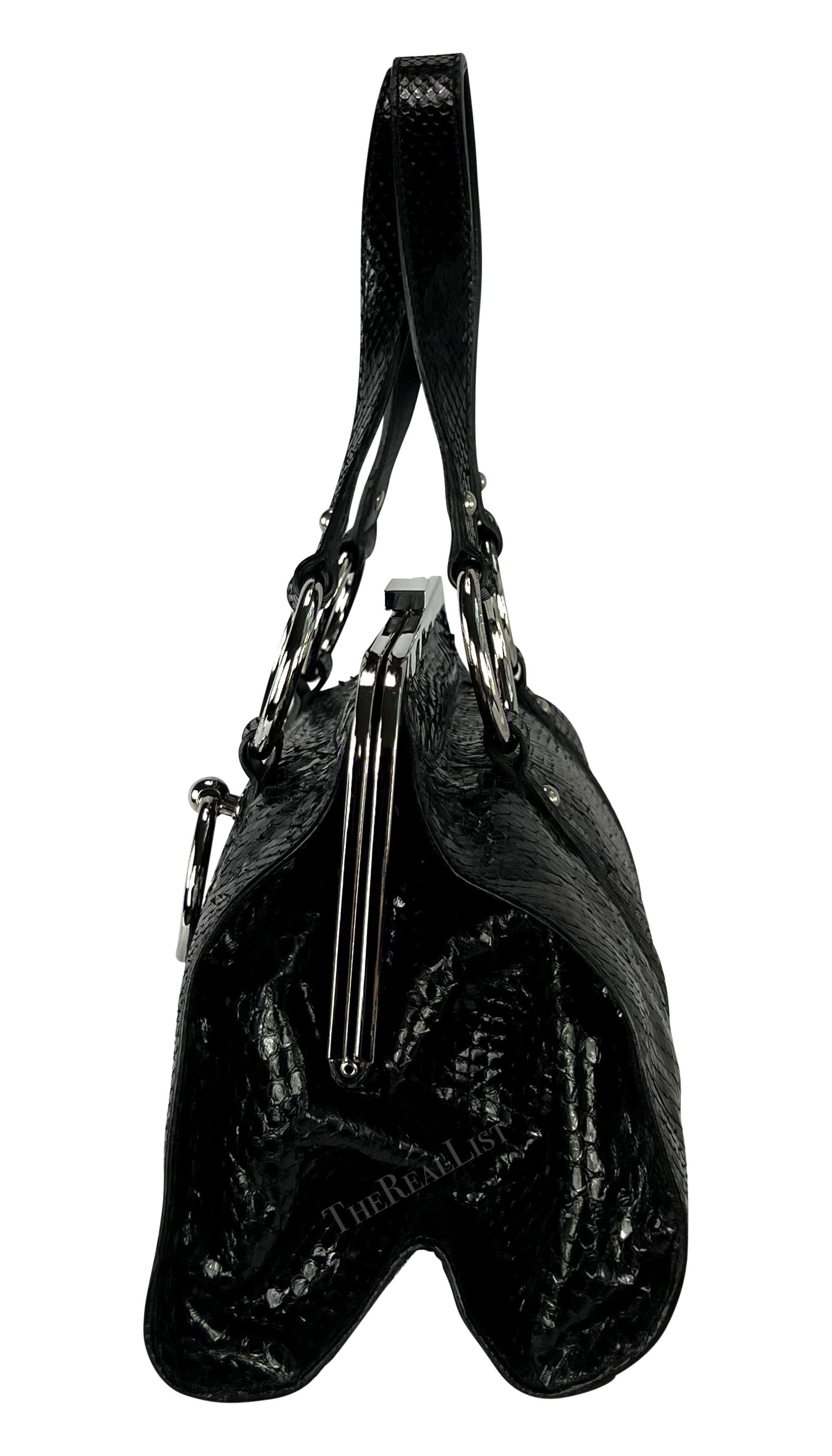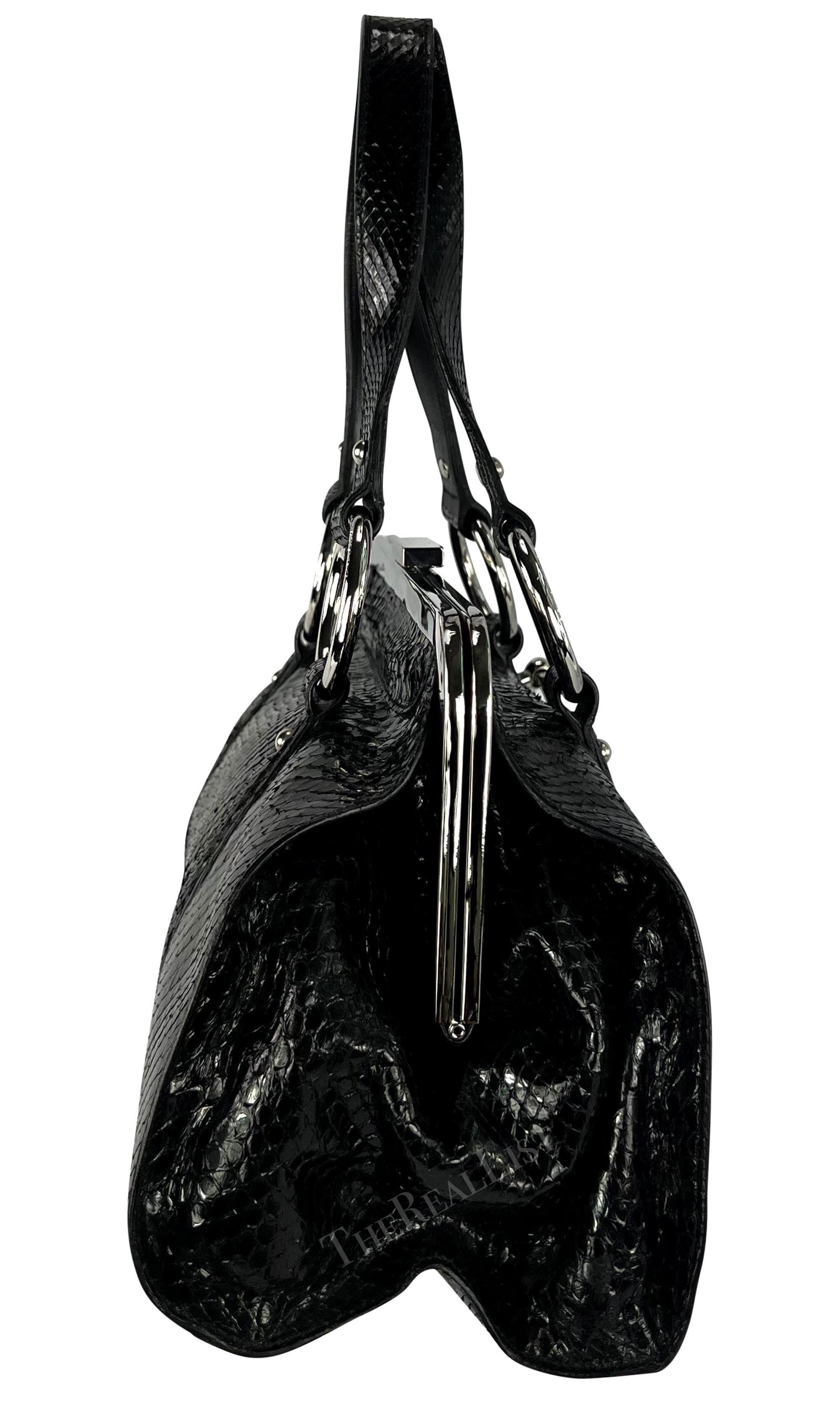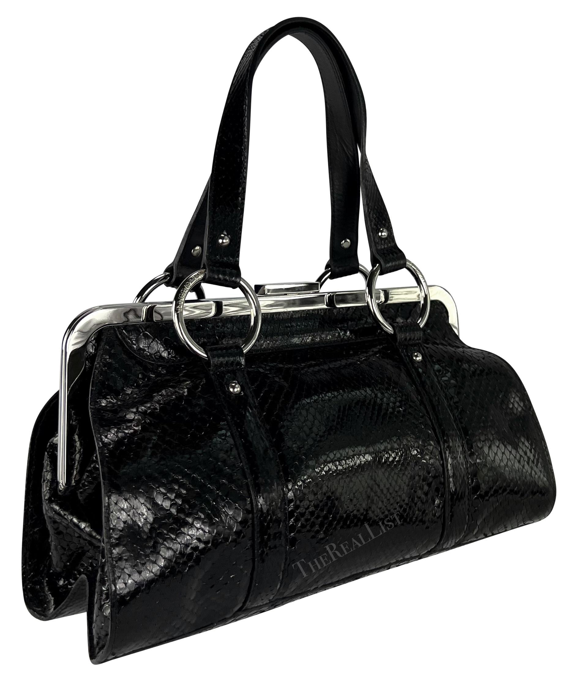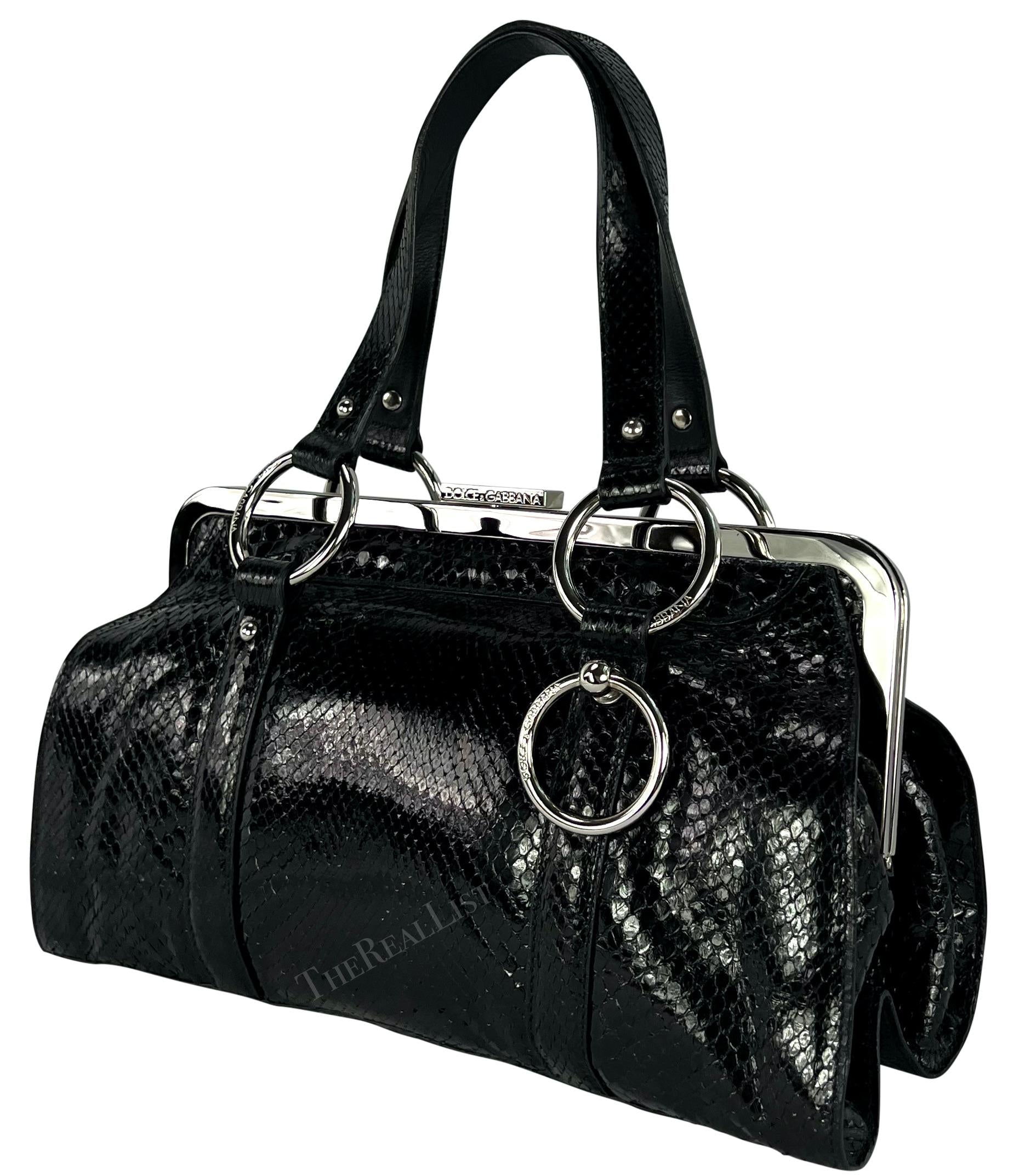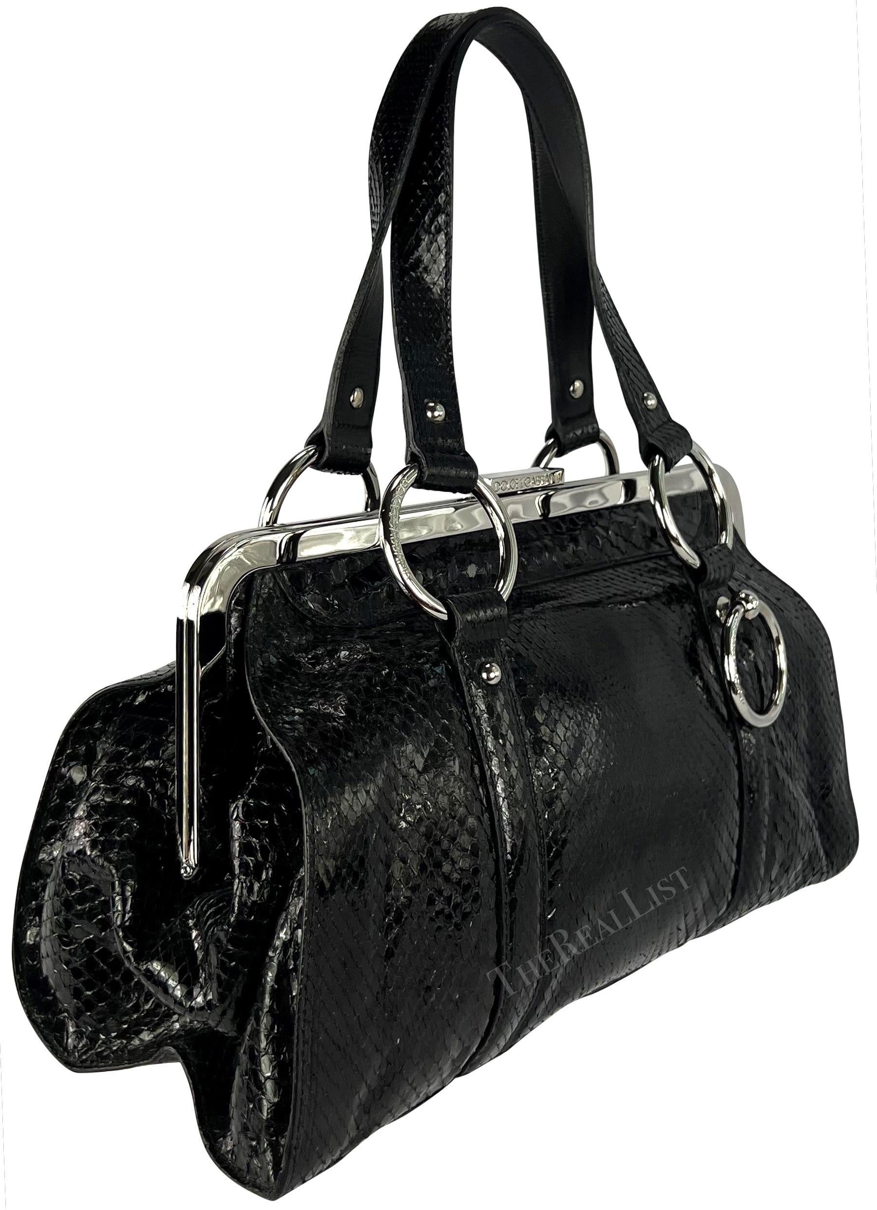 Introducing a fabulous black python skin bag by Dolce & Gabbana from the Spring/Summer 2003 collection. The patent leather iteration of this bag made its runway debut in look 8, modeled by Eva Herzigova. As seen on Victoria Beckham front row at the Fall/Winter 2003 Dolce & Gabbana runway show. Constructed entirely of black python skin, this bag features a silver-tone metal clamshell closure and is made complete with ring accents.
