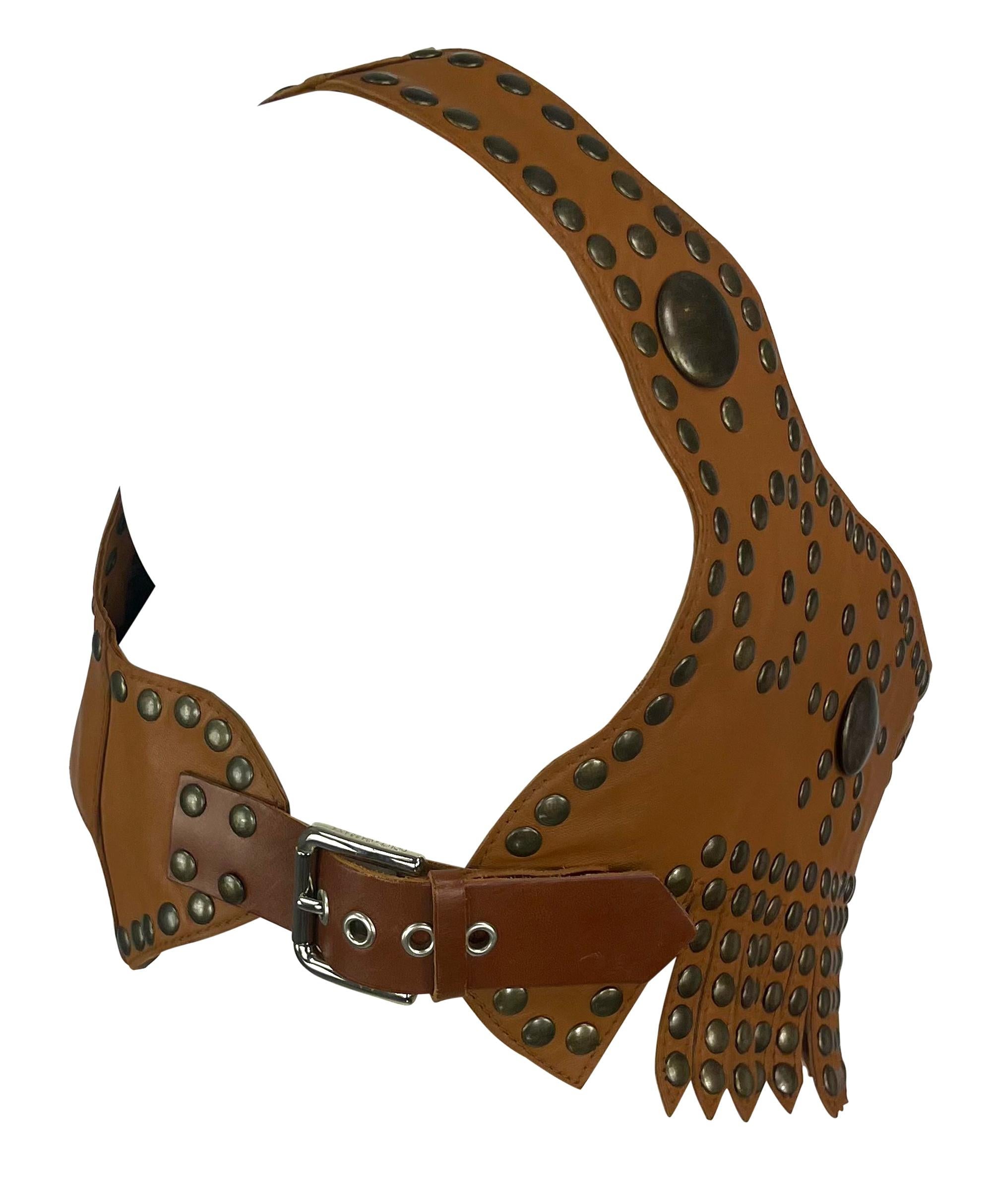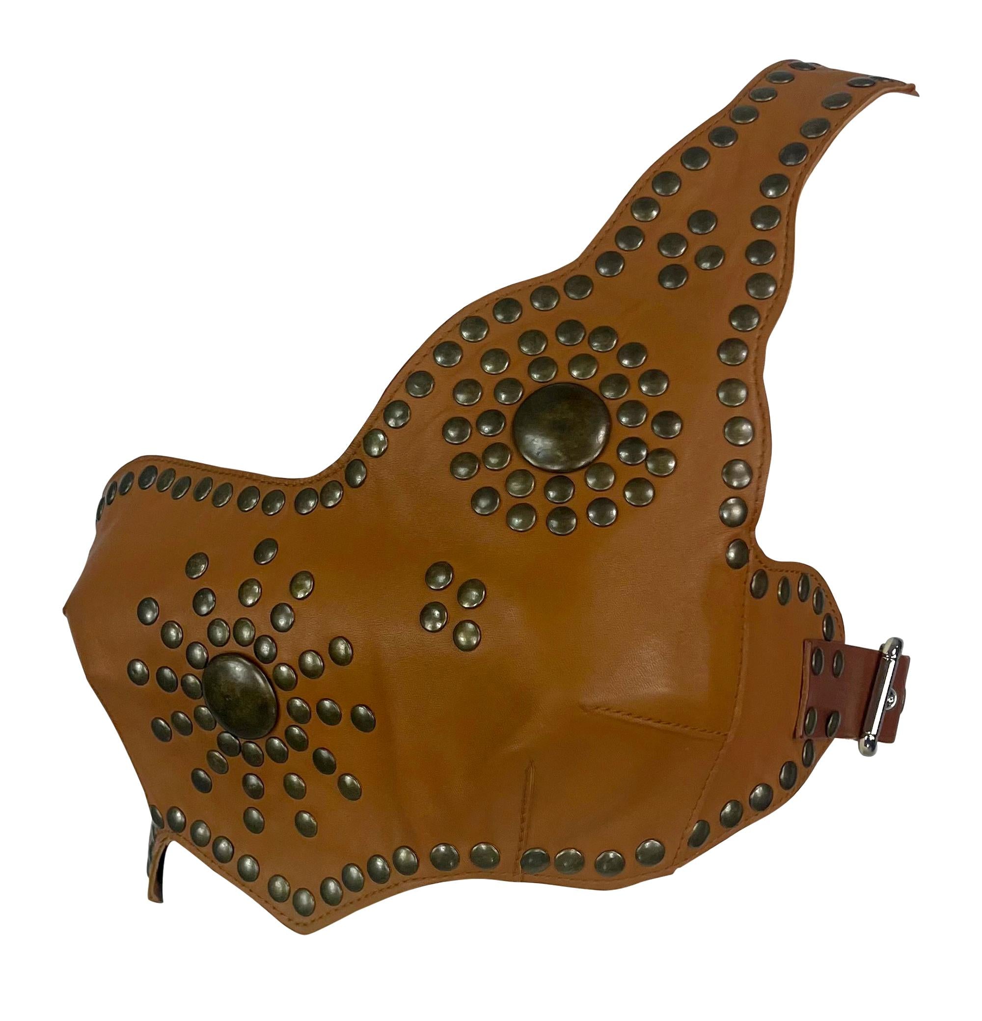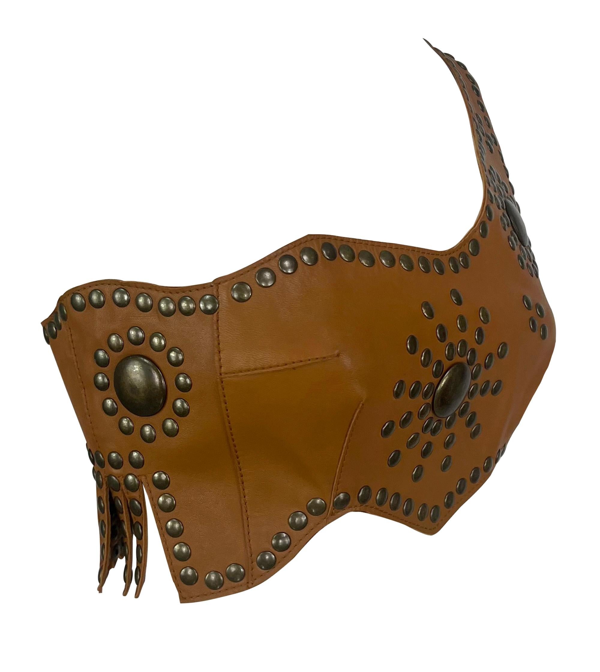From the Spring/Summer 2003 Dolce & Gabbana 'Sex & Love' collection, this saddle brown leather harness crop top debuted on the season's runway as part of look 53, modeled by Naomi Campbell. This fabulous single-shoulder top is constructed entirely of leather and features patinated studs throughout, a buckle at one side, and fringe at the back. As worn by Naomi Campbell on the February 2003 cover of I-D Magazine, captured by Tesh, this runway piece has never been worn before and comes complete with the original brand tags still attached.