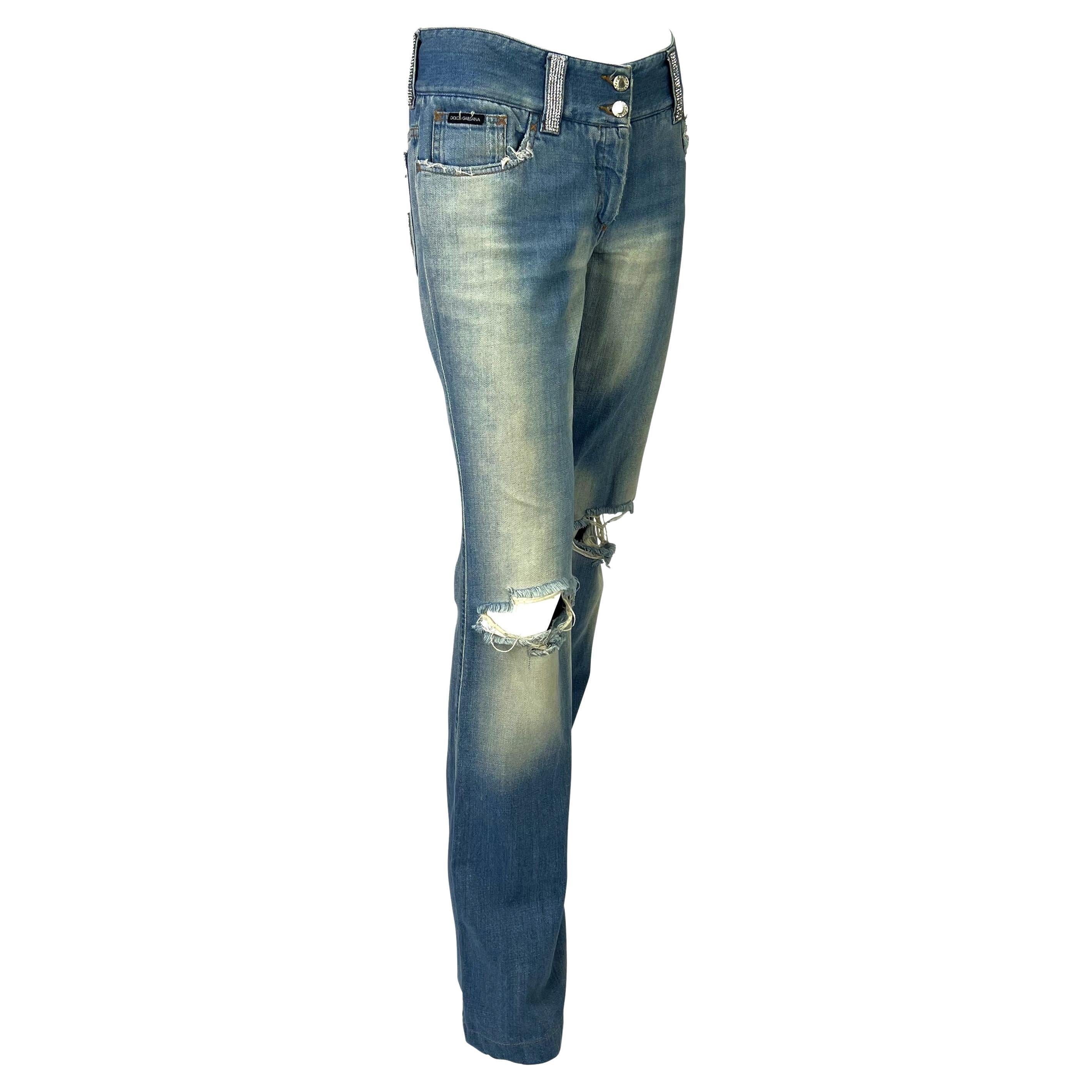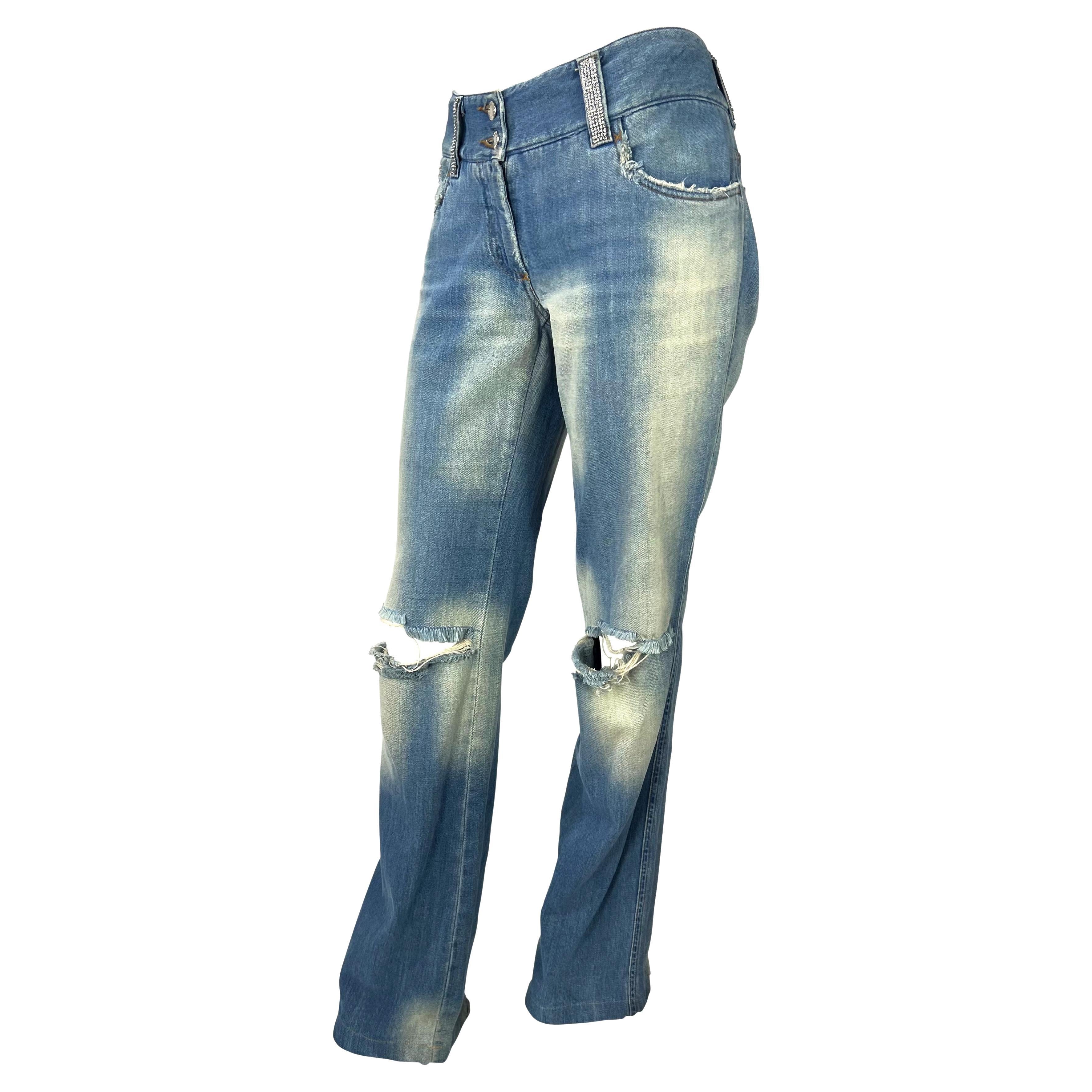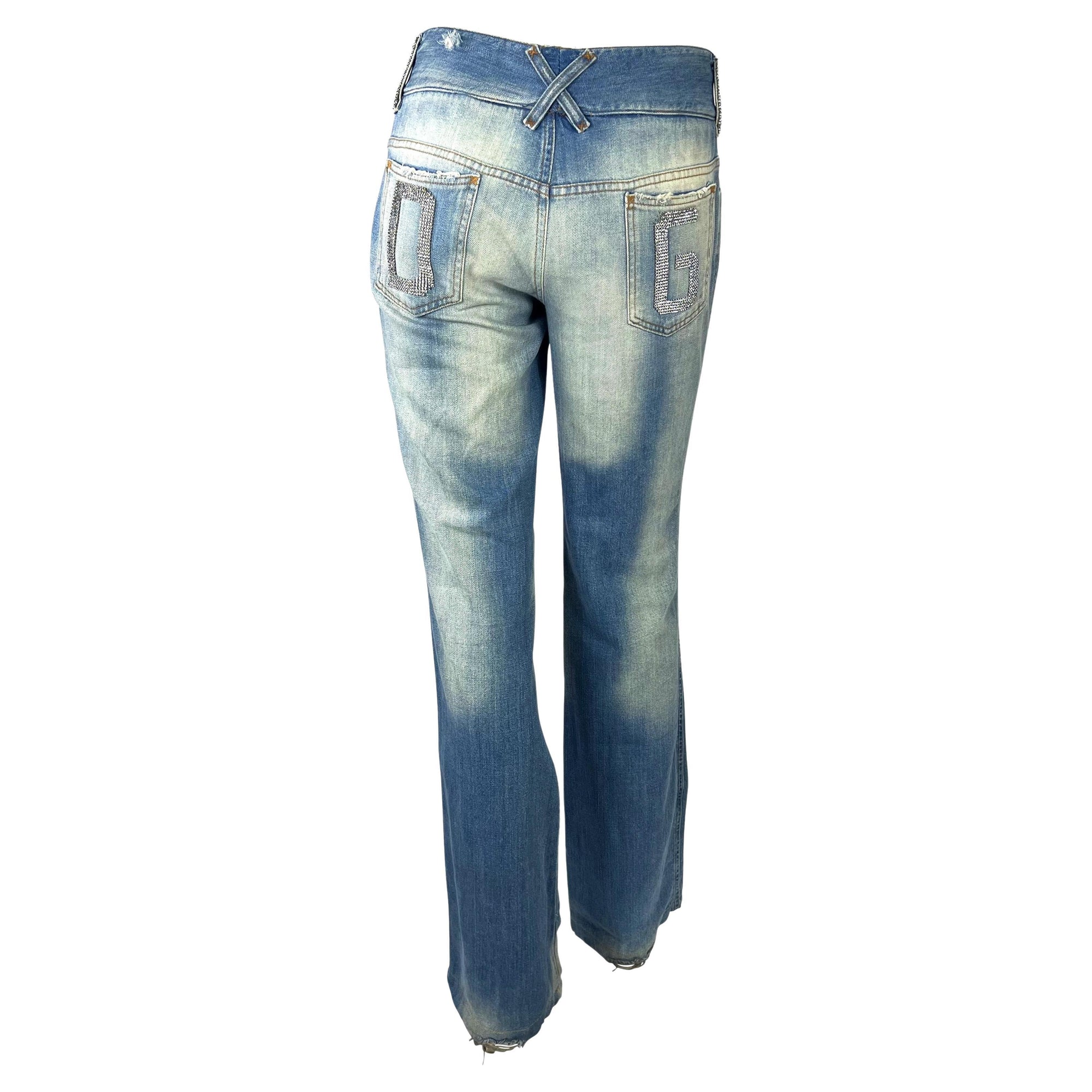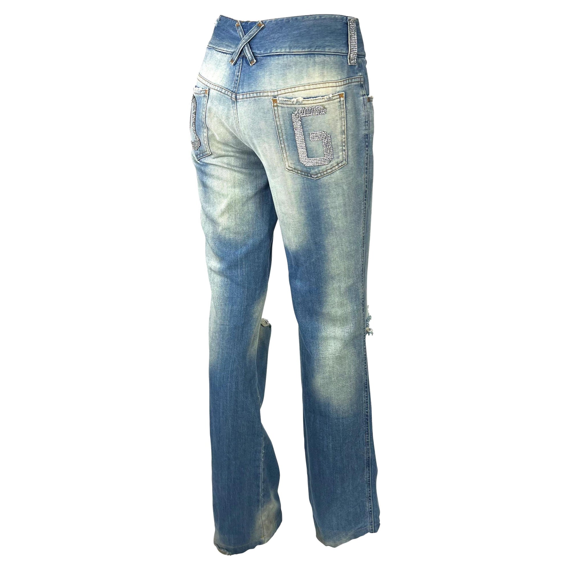 These distressed low-rise jeans from Dolce & Gabbana’s Spring/Summer 2003 “Sex & Love” collection are a quintessential Y2K design. The light-wash denim is detailed with acid wash and distressed holes at the knees. Rhinestone chainmail accents adorn the belt loops, while large rhinestone “D” and “G” motifs embellish the back pockets. A statement casual piece, these jeans capture the bold, glamorous spirit of early-2000s Dolce & Gabbana.