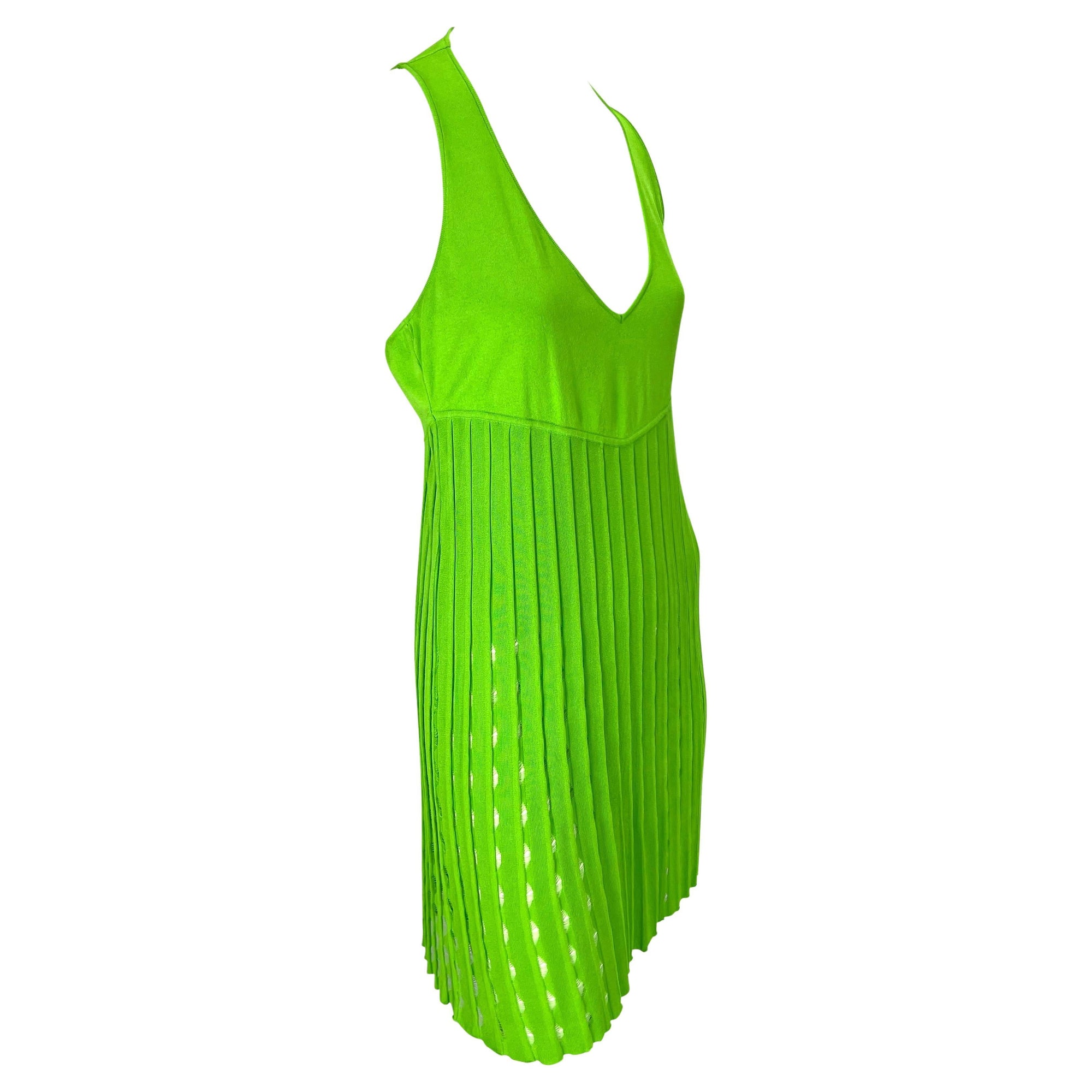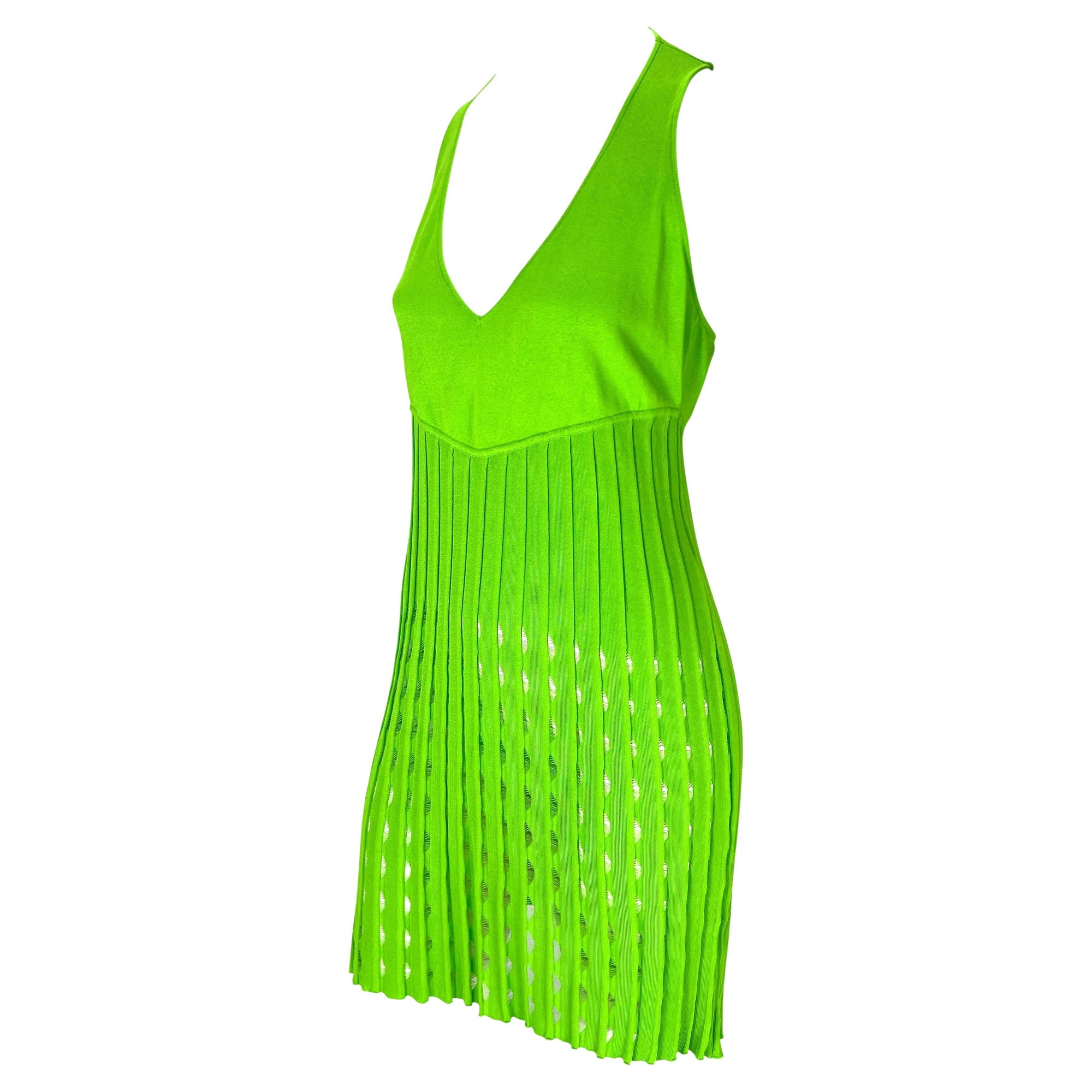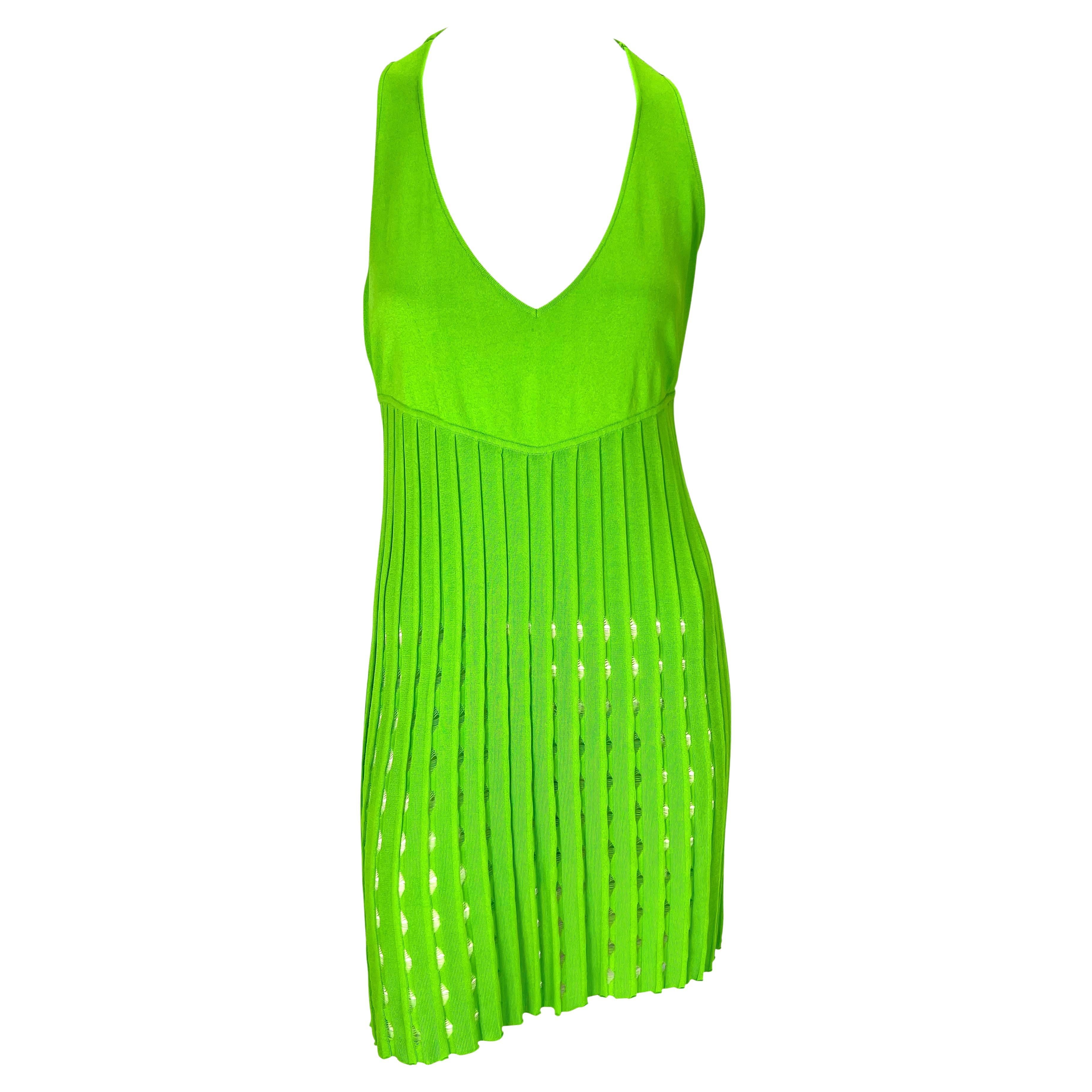 Presenting a neon green Gianni Versace Couture dress, designed by Donatella Versace. From the Spring/Summer 2003 collection, this dress debuted on the season's runway as part of look 16 modeled by Christina Kruse. This vibrant stretchy knit dress features a v-neckline, racerback, and eyelet cutouts at the pleated skirt. Add this perfect Y2K Gianni Versace by Donatella piece to your wardrobe!