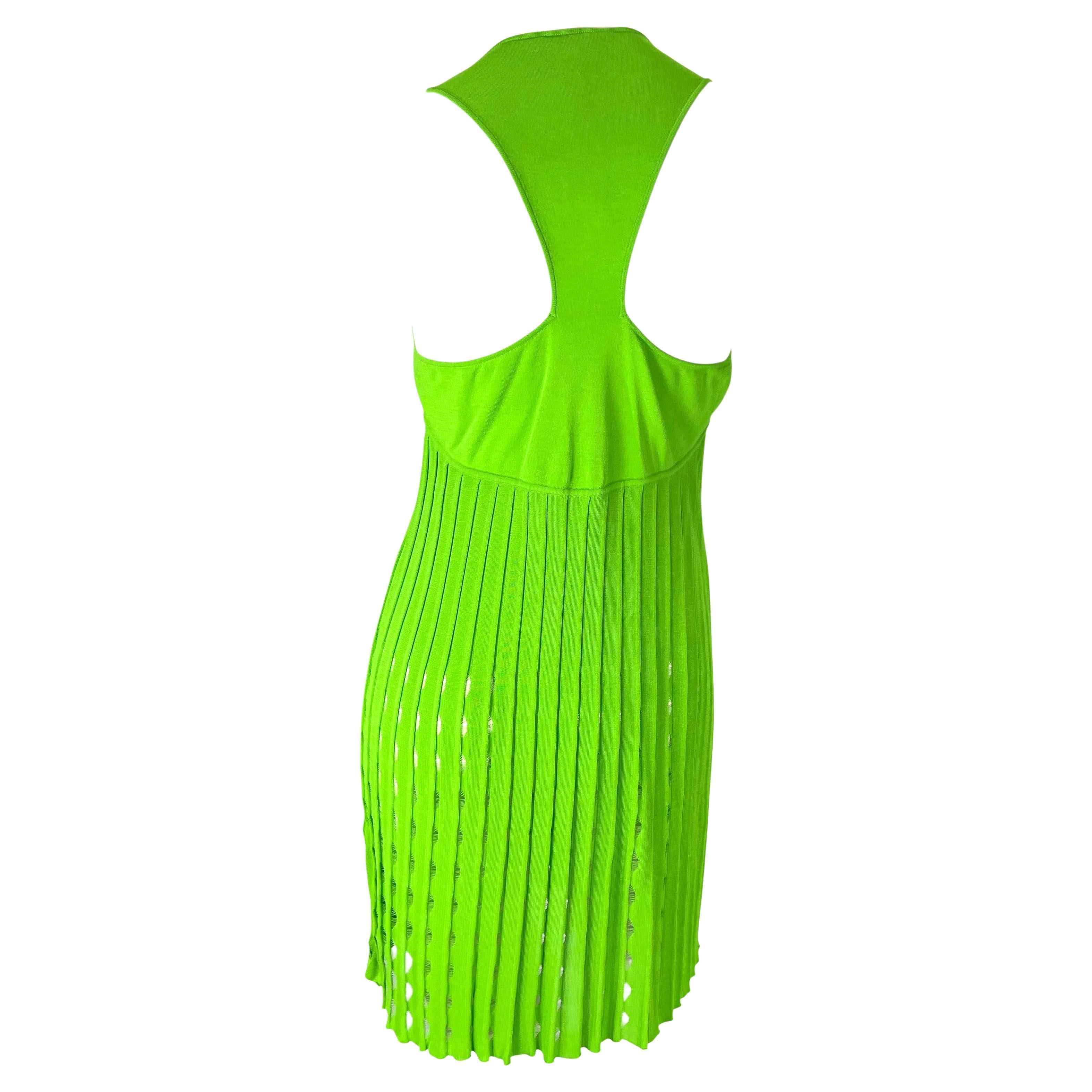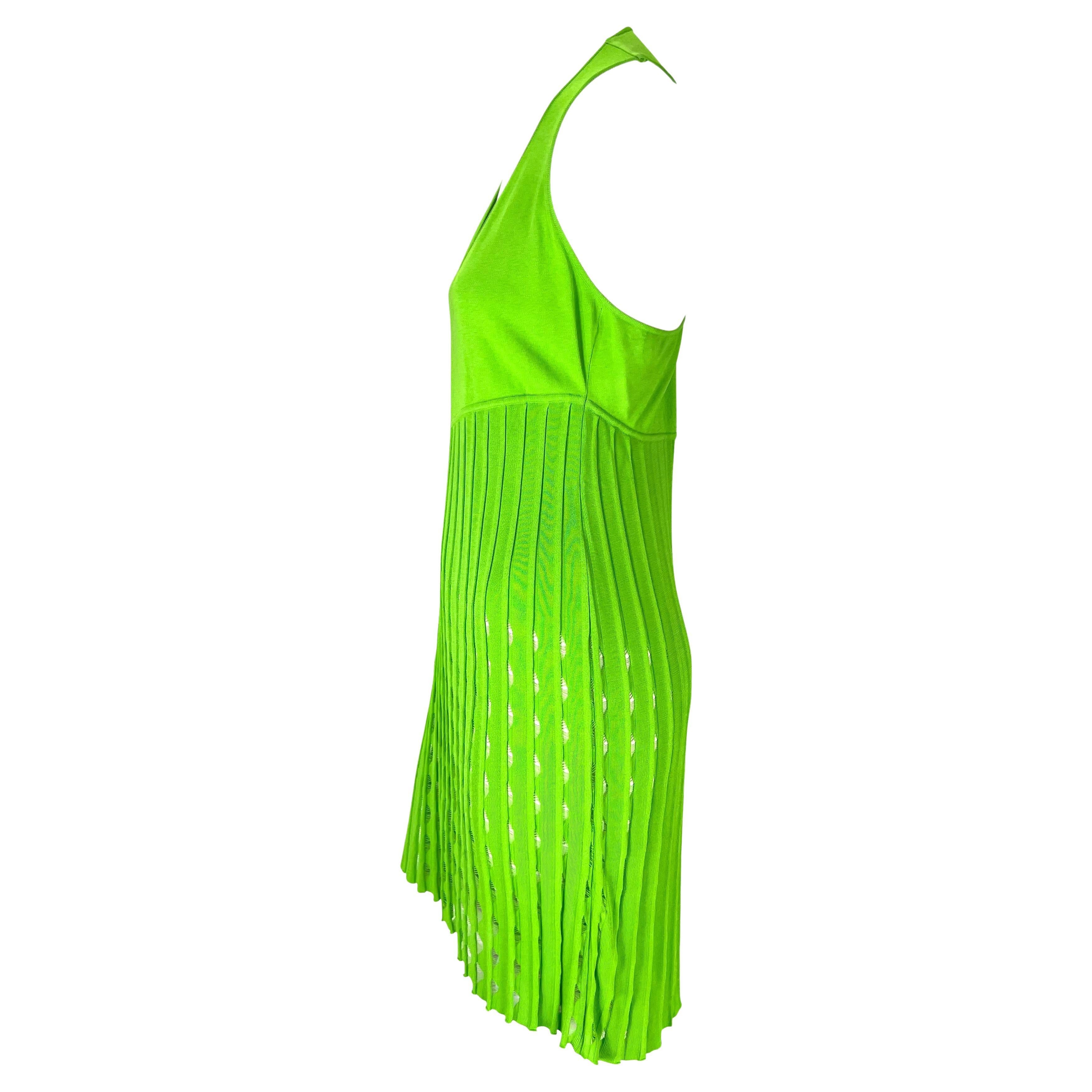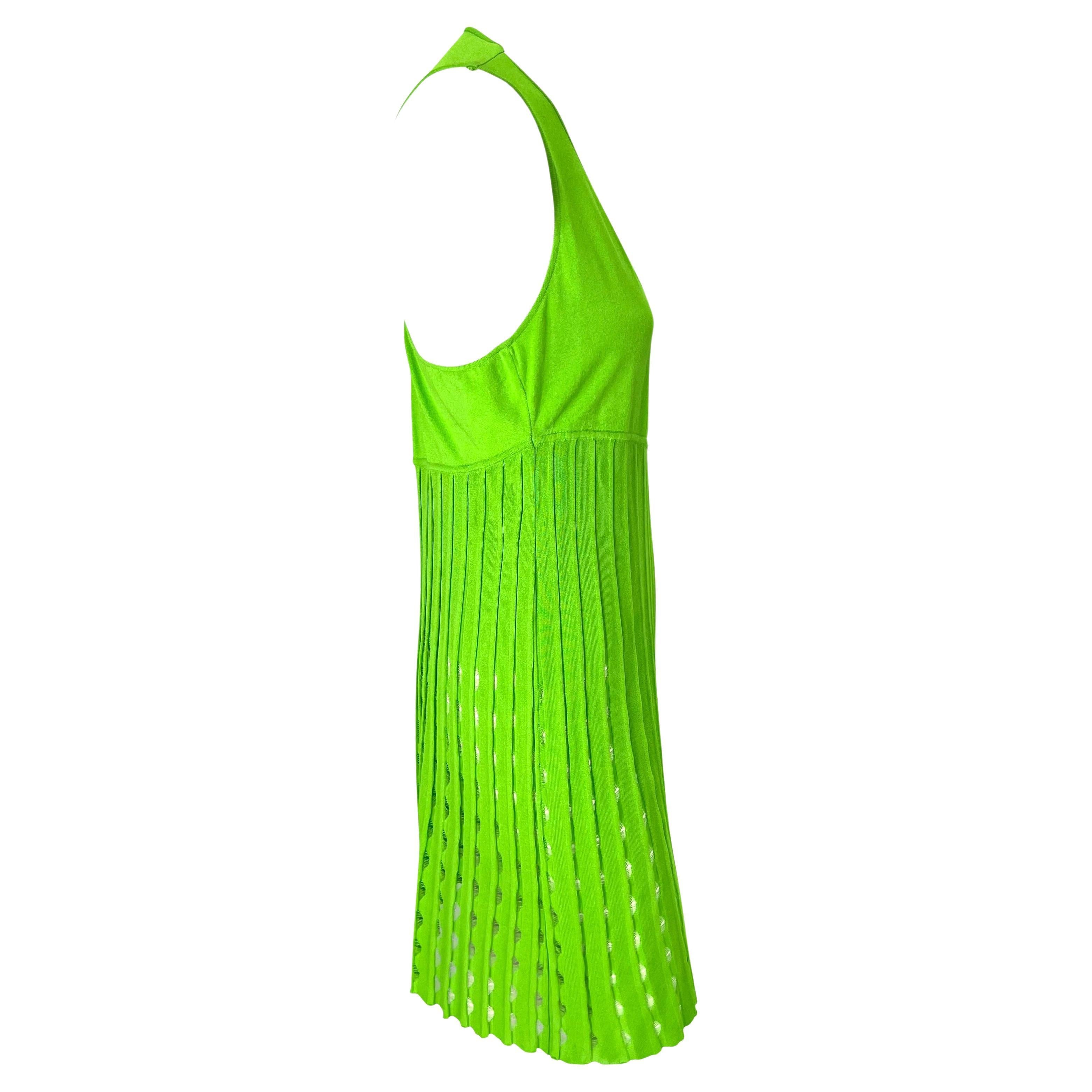 Presenting a neon green Gianni Versace Couture dress, designed by Donatella Versace. From the Spring/Summer 2003 collection, this dress debuted on the season's runway as part of look 16 modeled by Christina Kruse. This vibrant stretchy knit dress features a v-neckline, racerback, and eyelet cutouts at the pleated skirt. Add this perfect Y2K Gianni Versace by Donatella piece to your wardrobe!