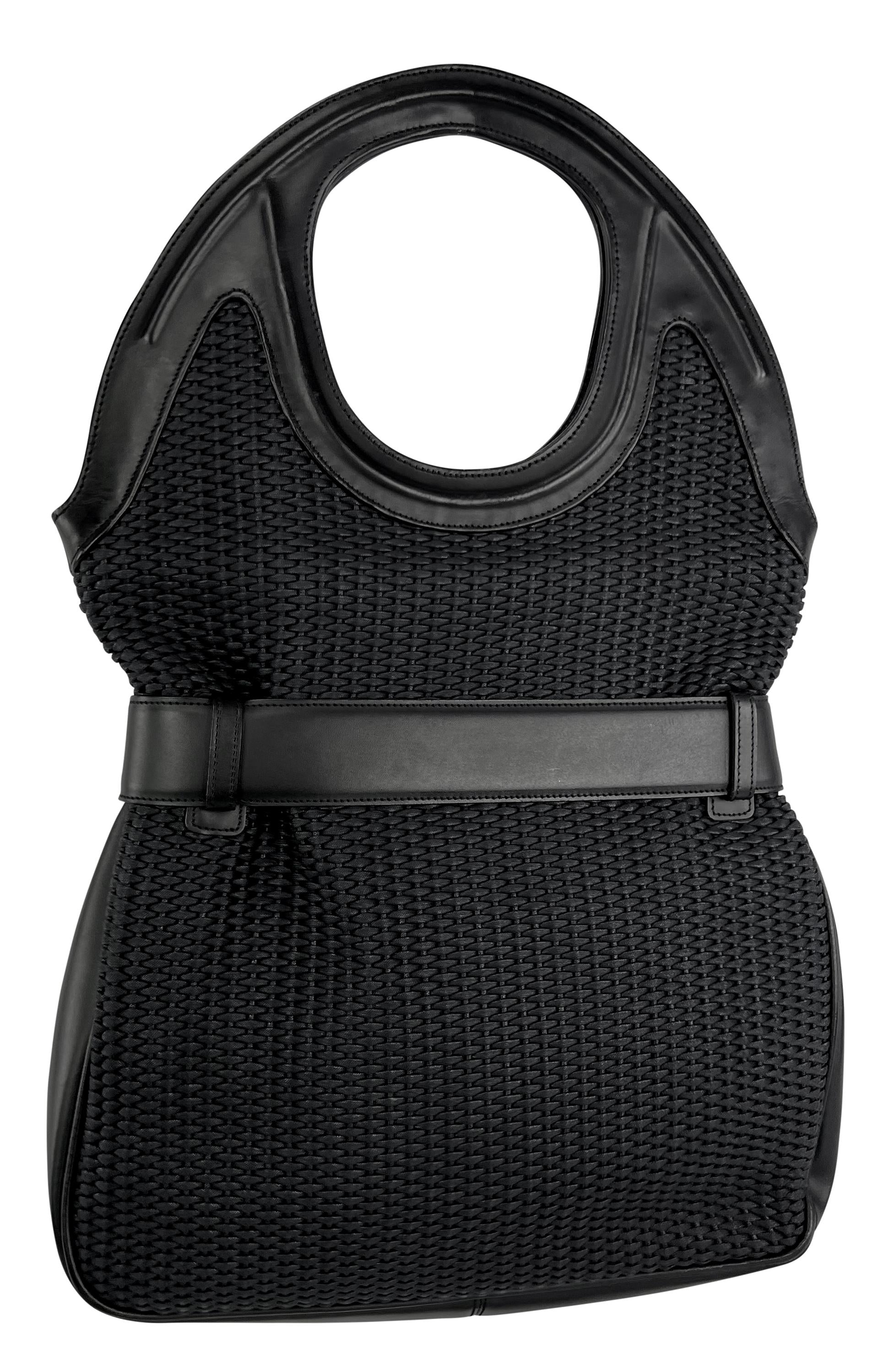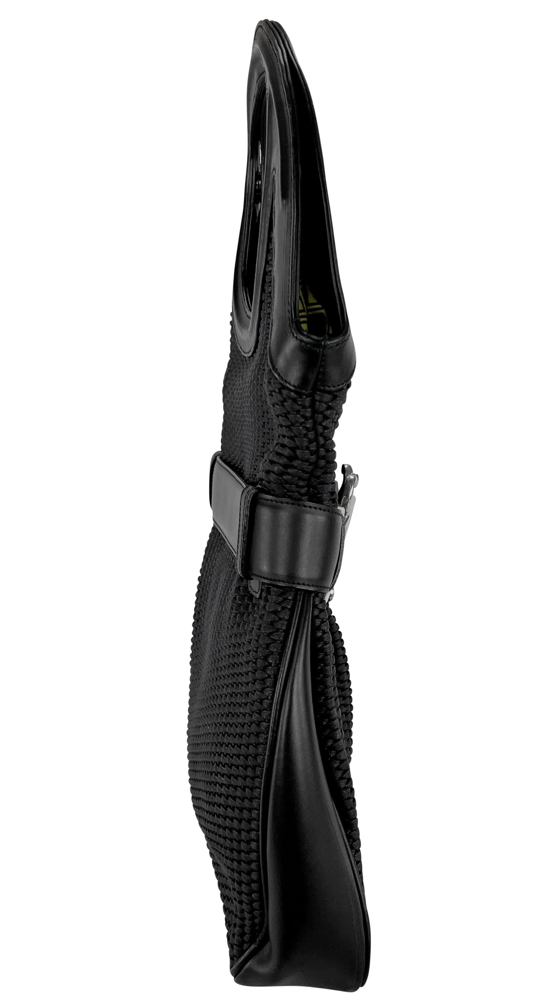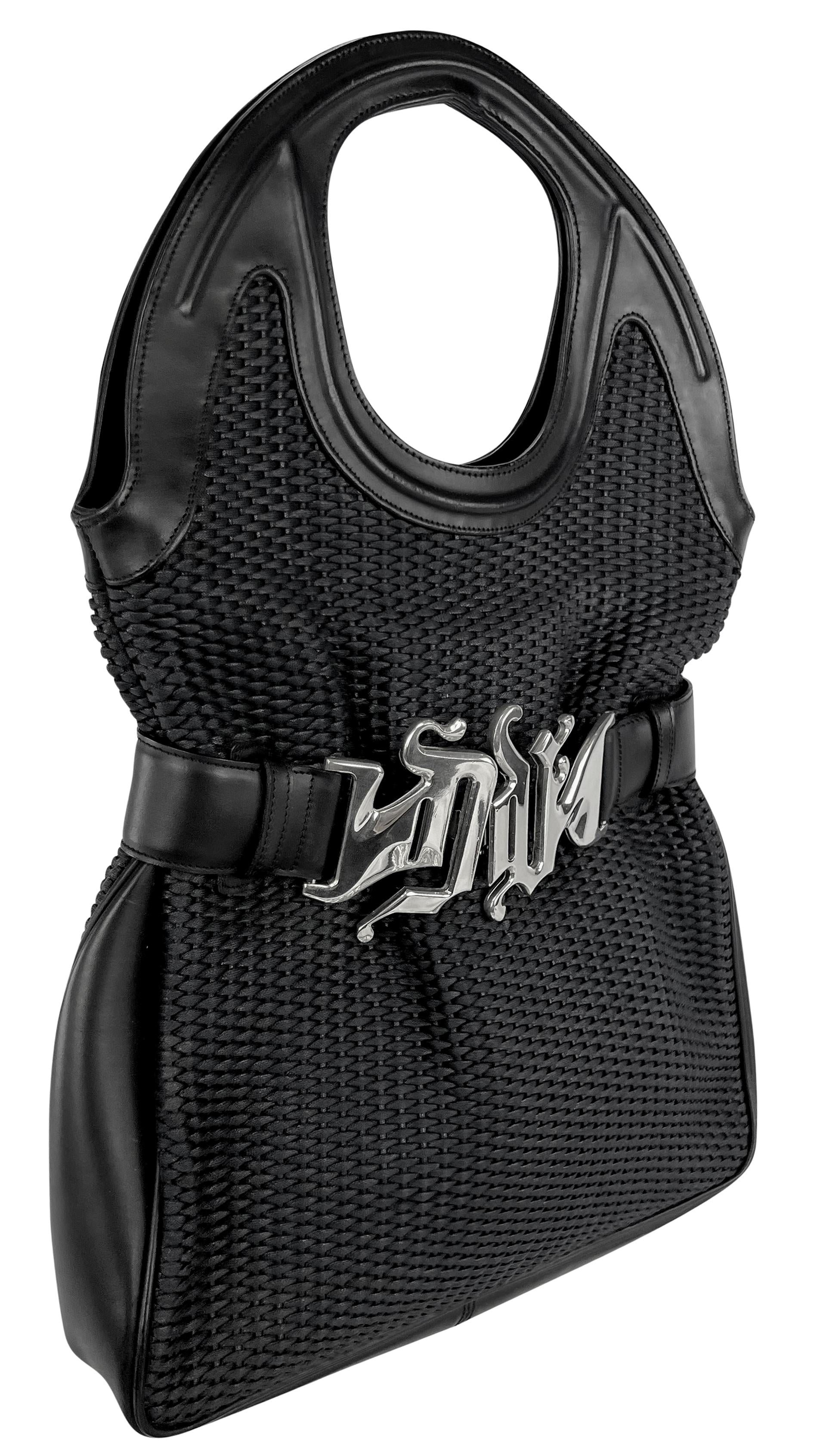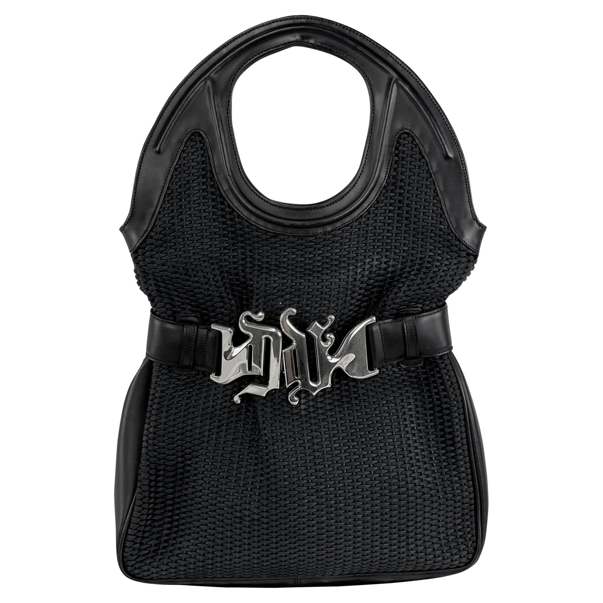 Donatella Versace designed this chic black woven bag for her Spring/Summer 2003 Gianni Versace collection. A version of this bag debuted on the season's runway. This all-black bag features a black woven body with black leather accents. This tote-style bag is cinched in the middle with a black leather band complemented with a large silver-tone 'DV' monogram.