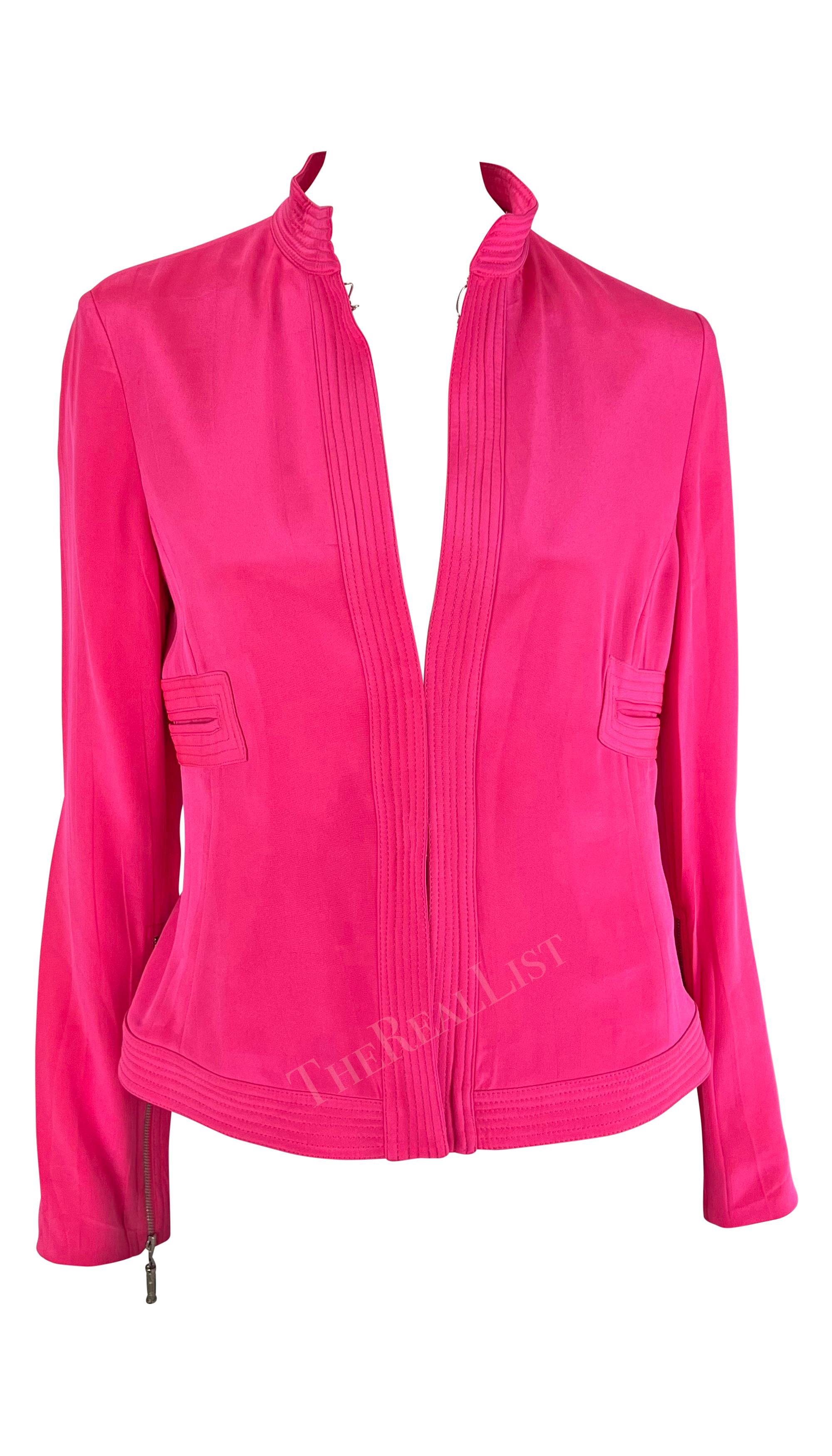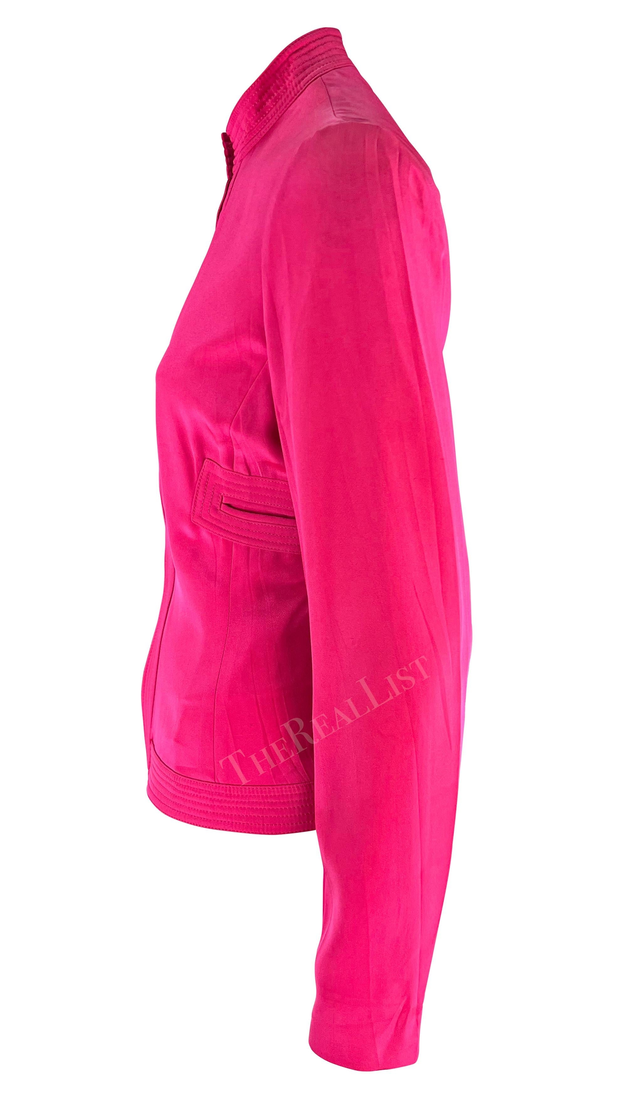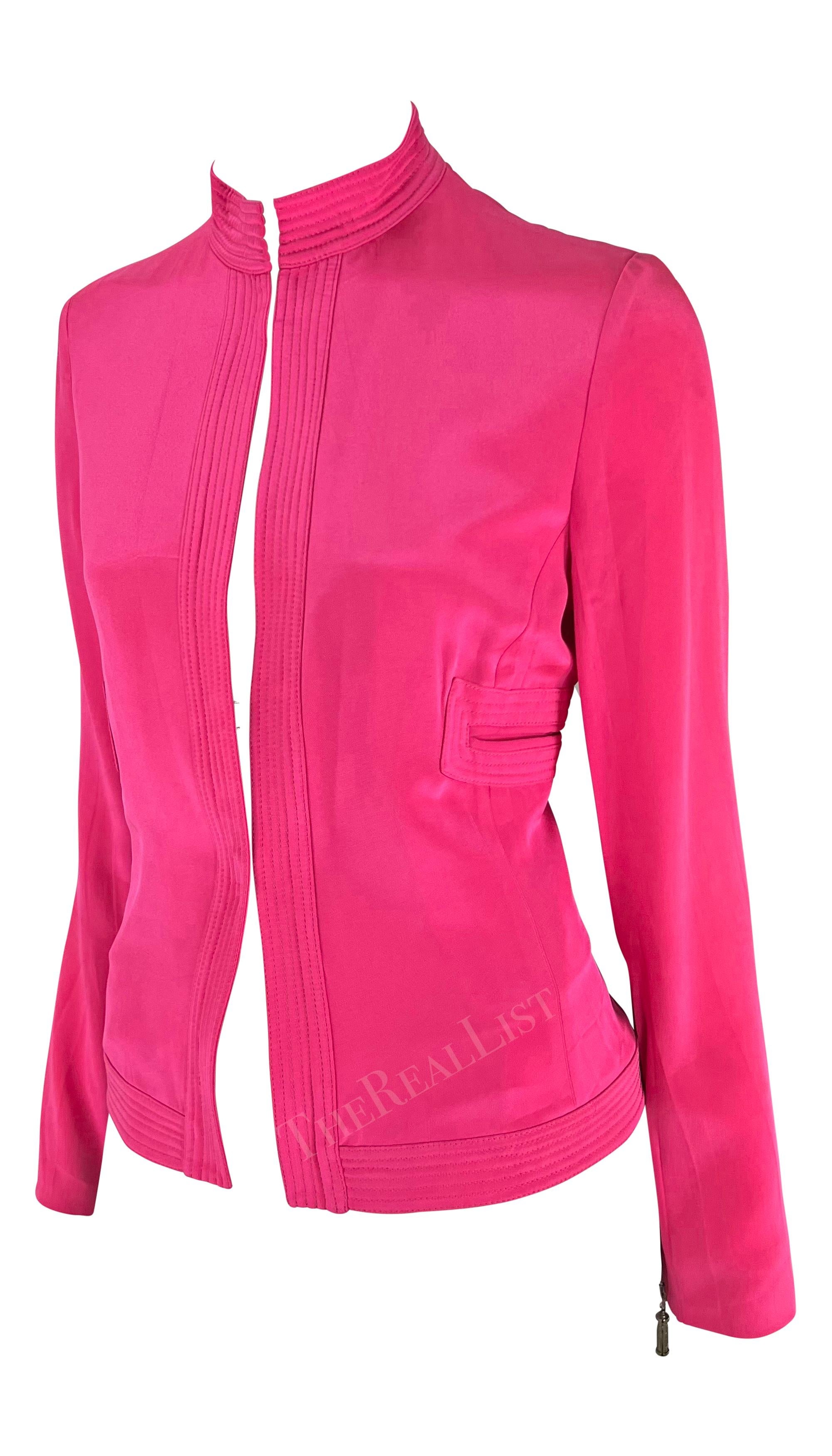 Presenting a fabulous hot pink Gianni Versace jacket, designed by Donatella Versace. From the Spring/Summer 2003 collection, this lightweight jacket debuted on the season's runway as part of look 12 modeled by Raquel Zimmermann. Featuring a stand-up collar, this jacket is made complete with pockets below the bust and hook and eye closures.