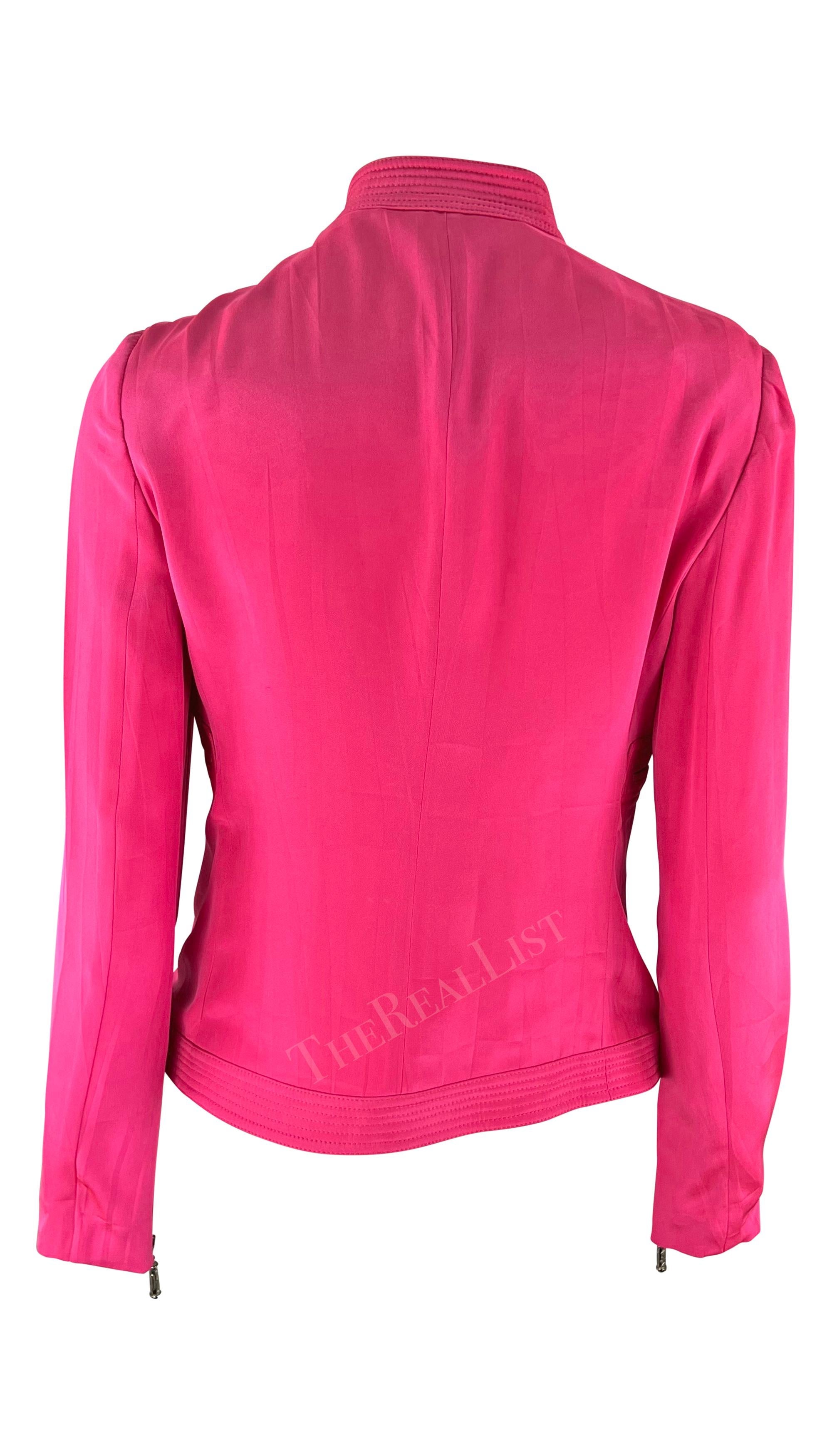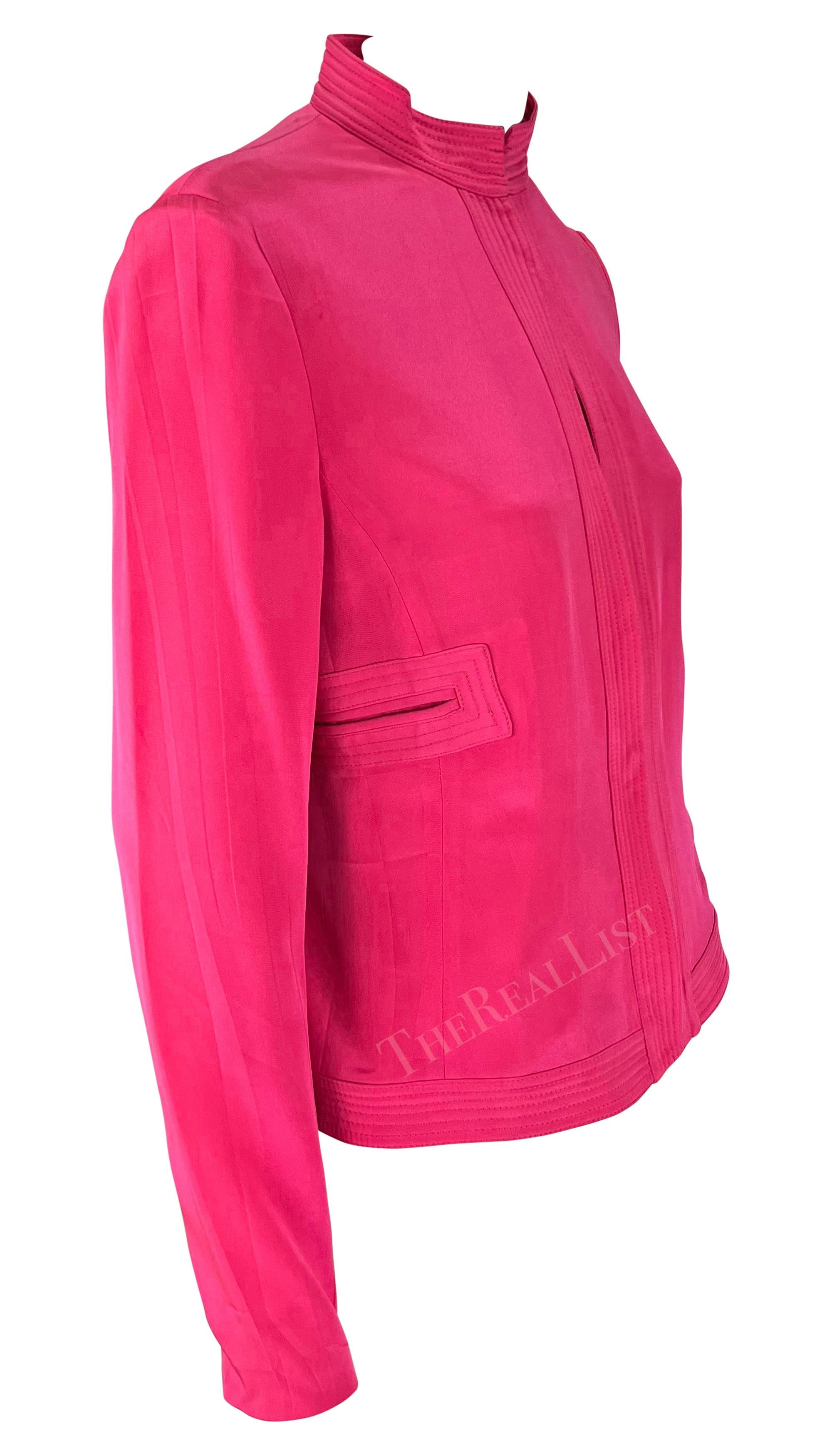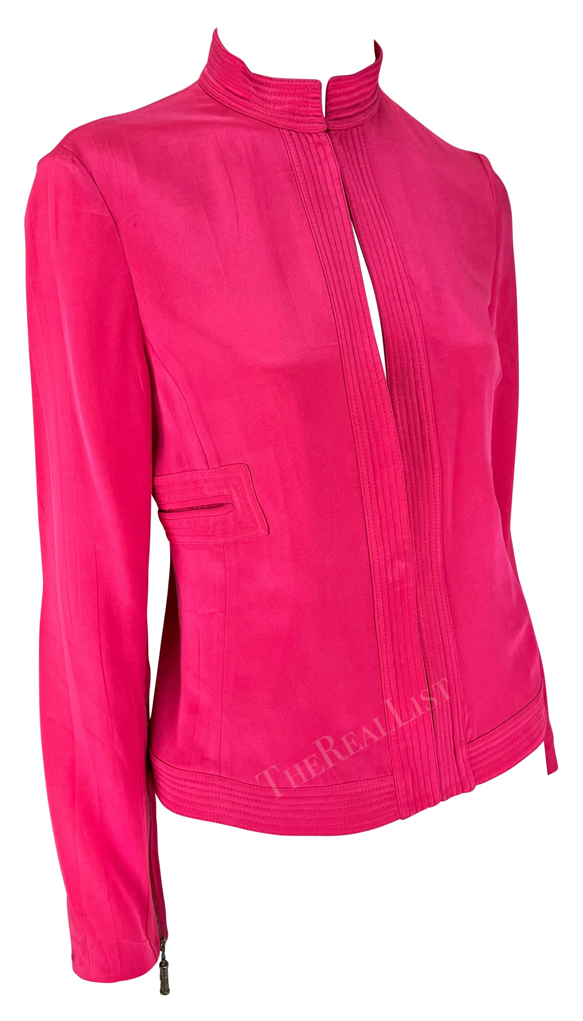 Presenting a fabulous hot pink Gianni Versace jacket, designed by Donatella Versace. From the Spring/Summer 2003 collection, this lightweight jacket debuted on the season's runway as part of look 12 modeled by Raquel Zimmermann. Featuring a stand-up collar, this jacket is made complete with pockets below the bust and hook and eye closures.