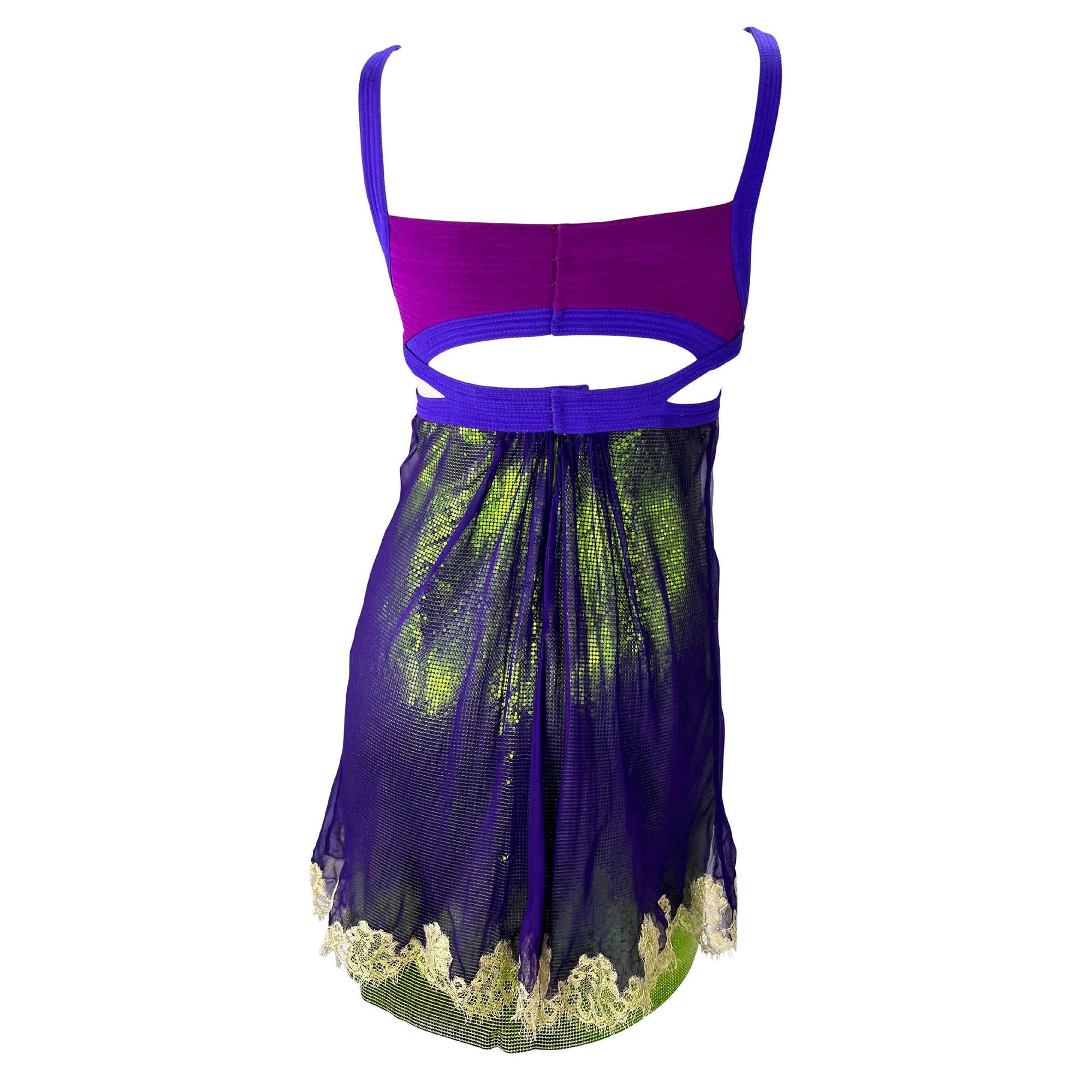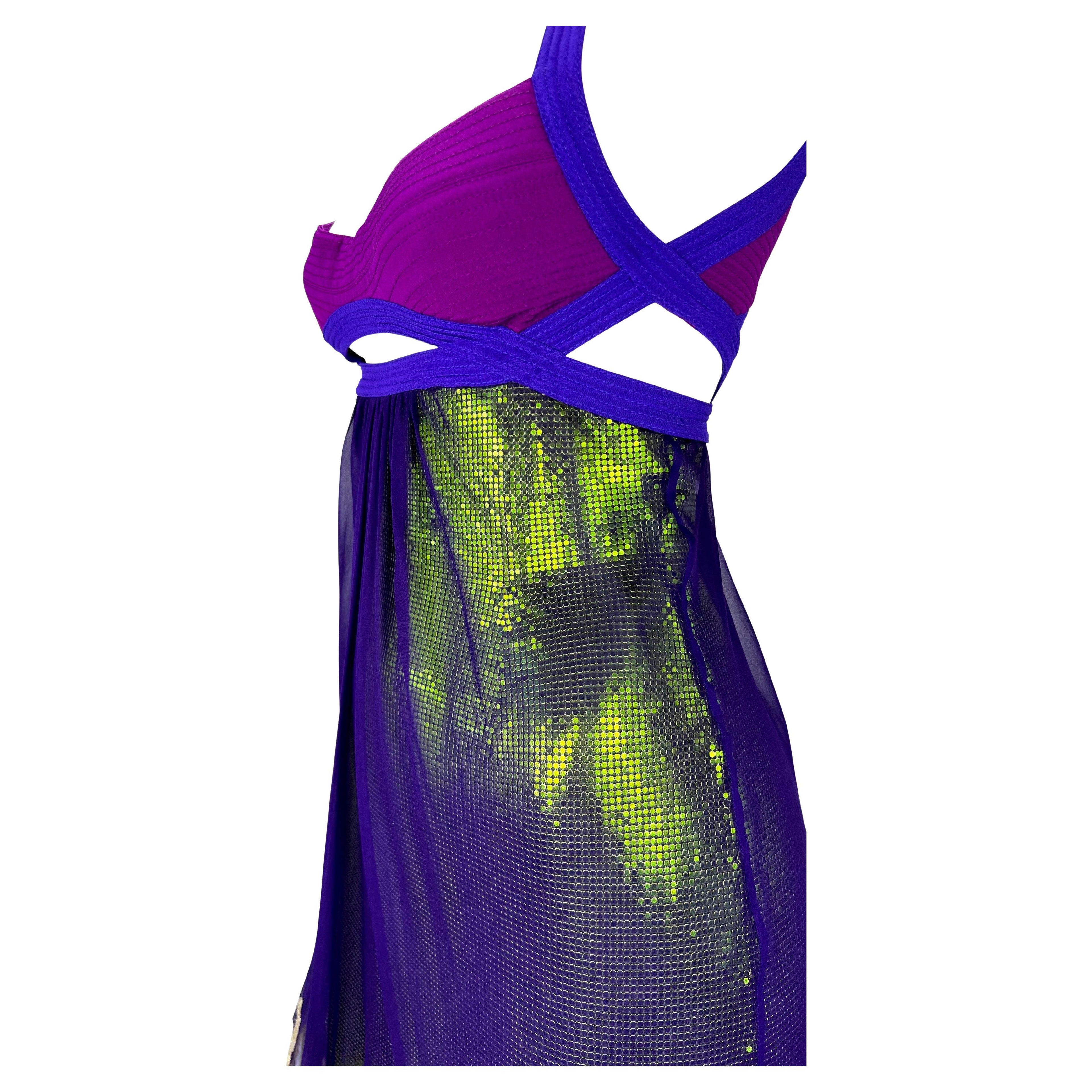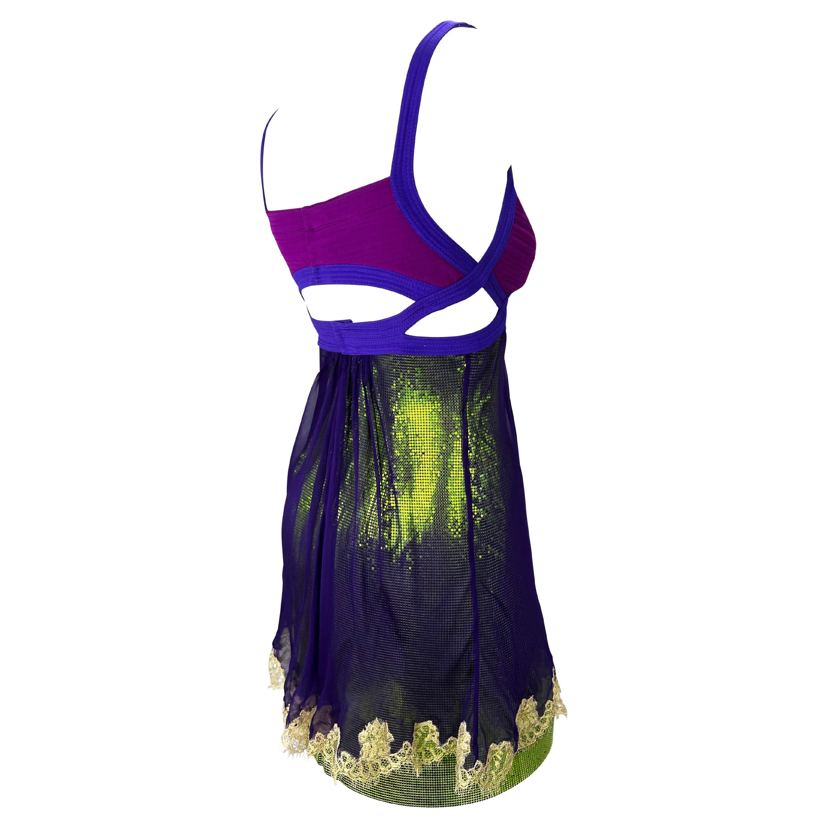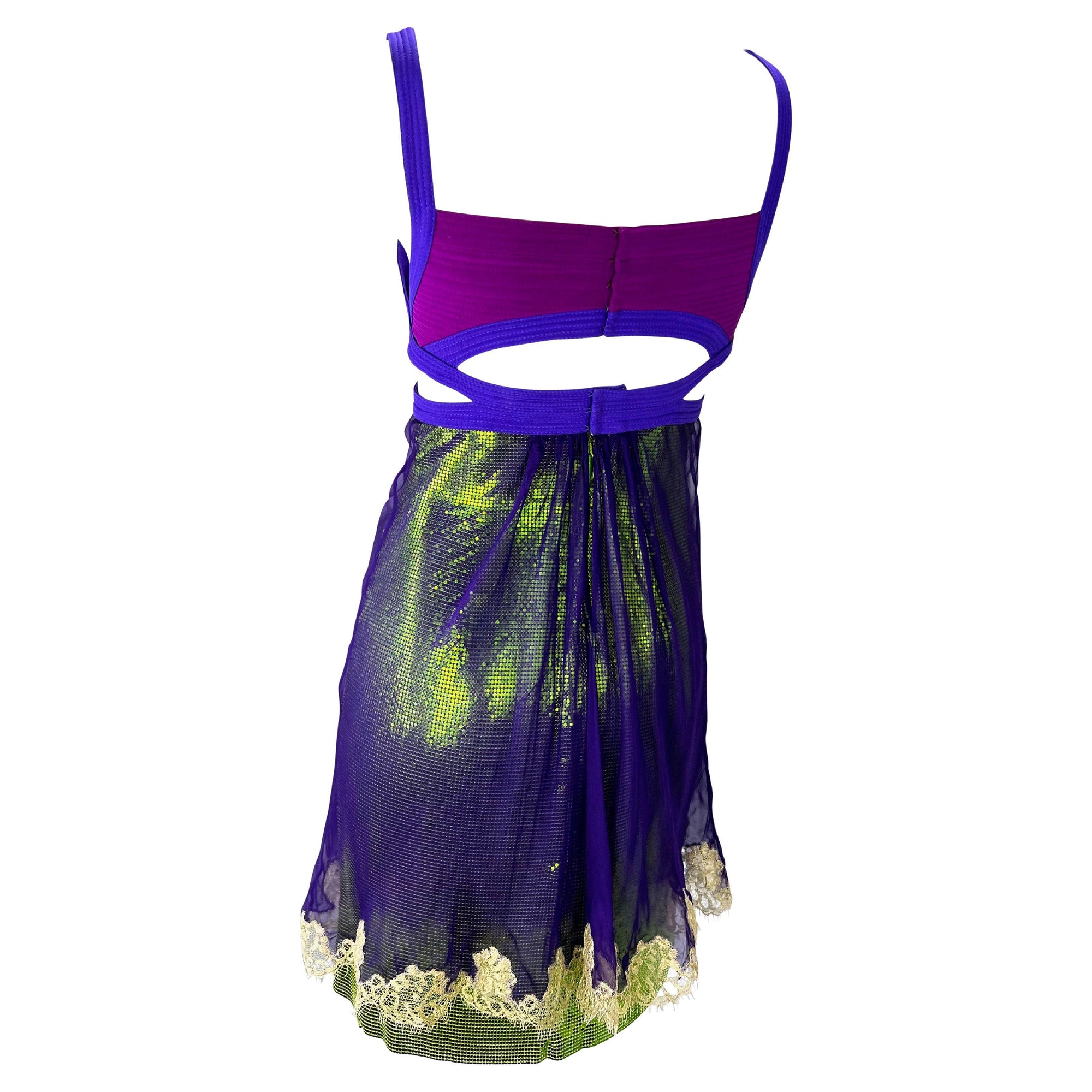 Presenting an incredible acid green and purple Oroton Gianni Versace Couture mini dress designed by Donatella Versace. From the Spring/Summer 2003 collection, this dress debuted as Look 55, modeled by Nicola Breytenbach. This ultra-sexy dress was also worn by Eve to the 2003 MTV Movie Awards and by Paris Hilton to the 2009 Grammy Awards. This dress features a bandeau bust with an angular neckline and openings between the bust and the dress's skirt. The skirt is a vibrant green Oroton chainmail skirt with a sheer silk and lace overlay. An incredible Versace Y2K masterpiece, this dress is the perfect sexy throwback.