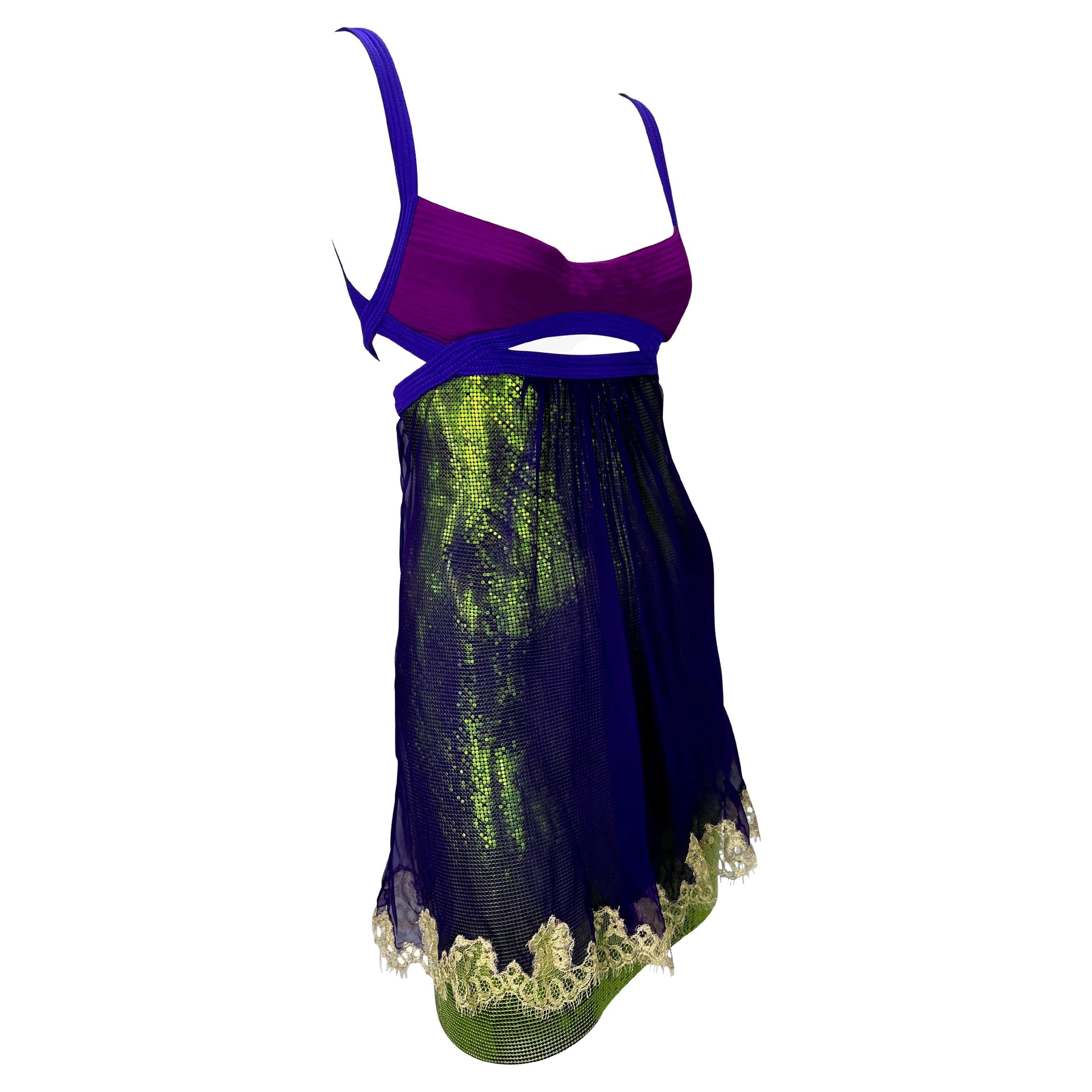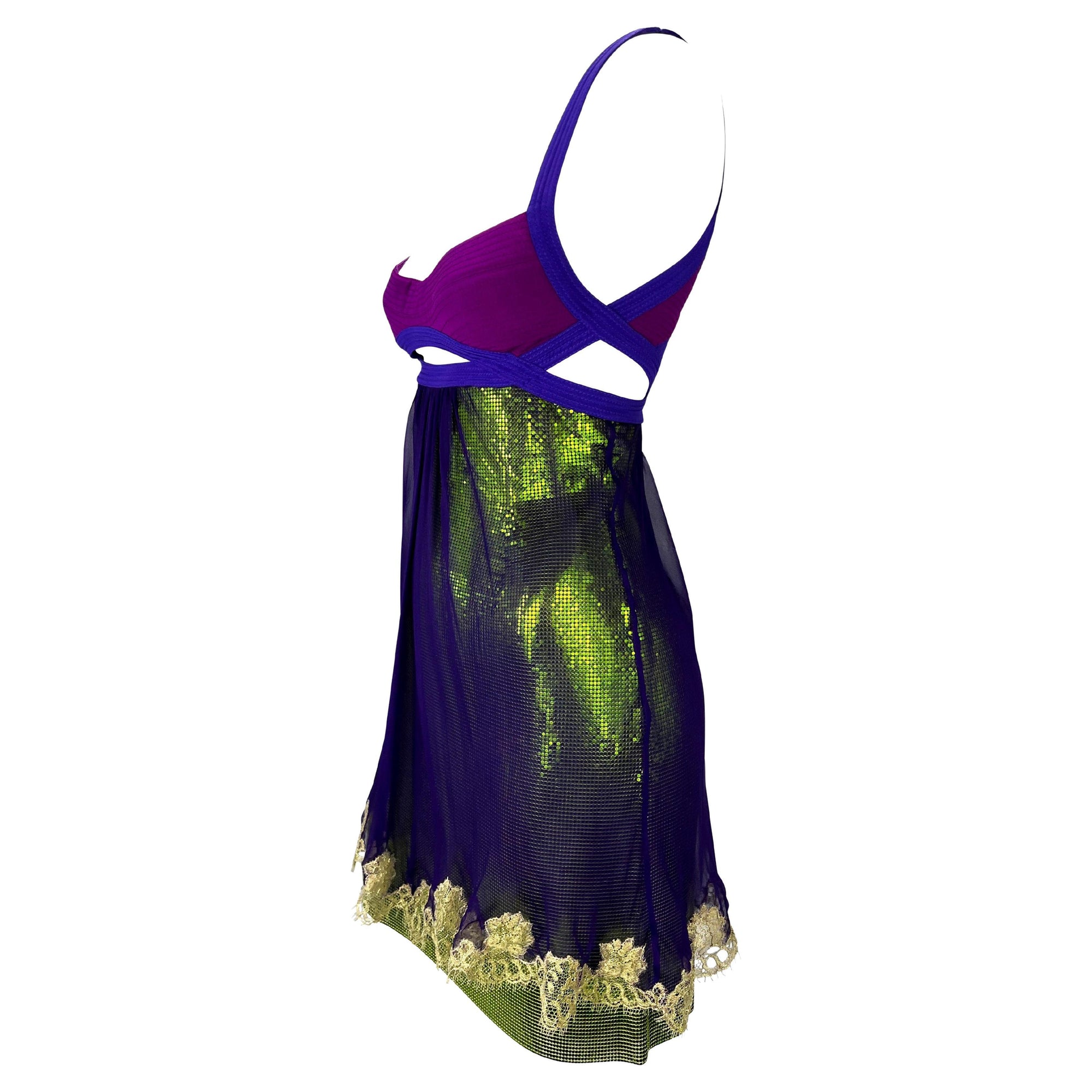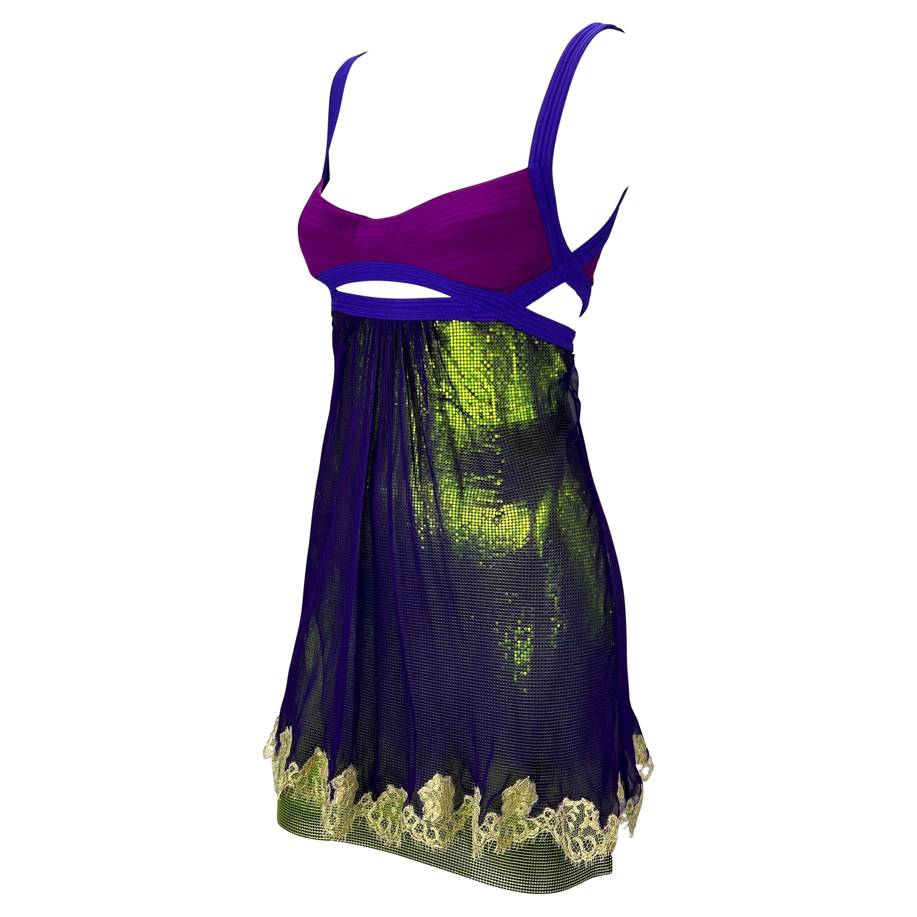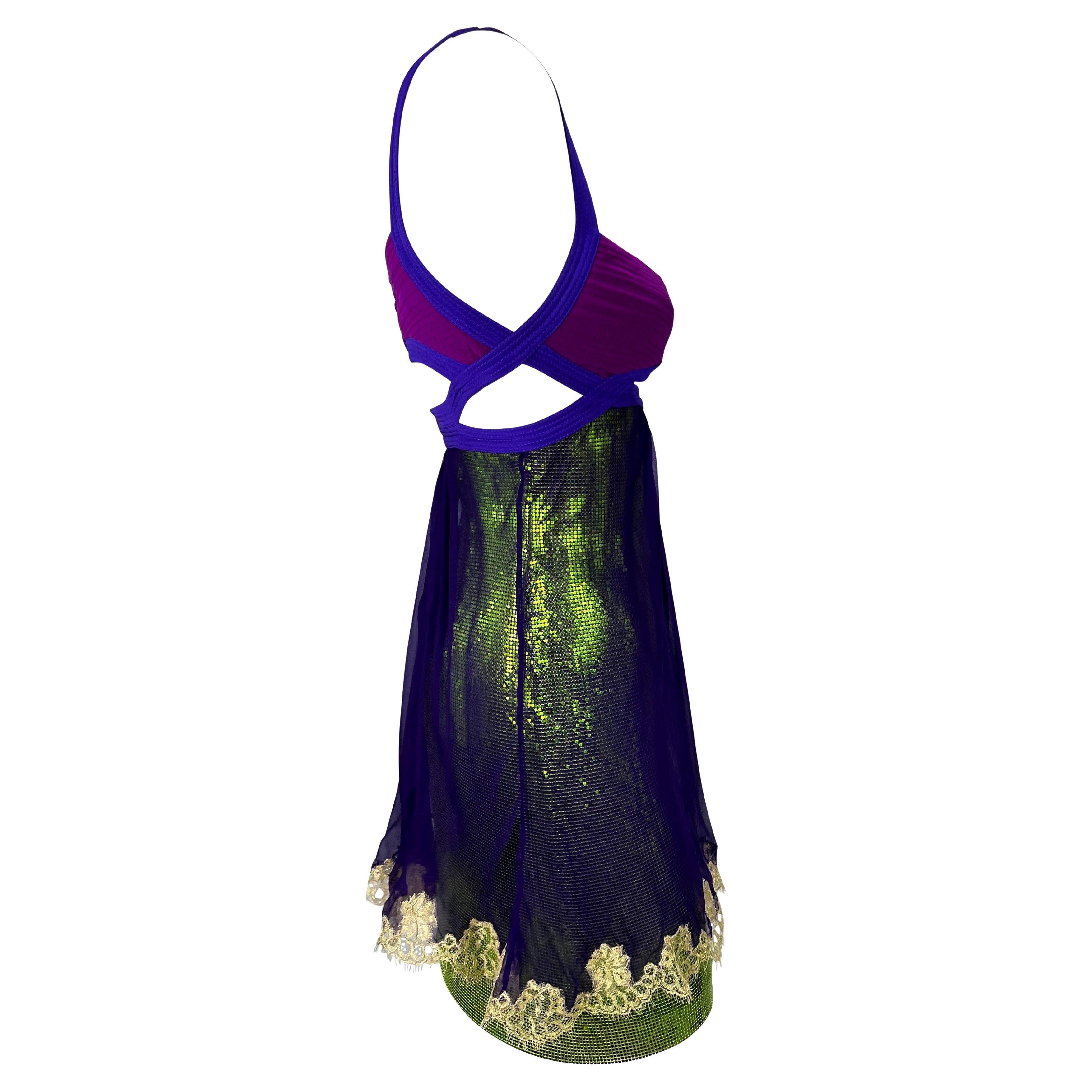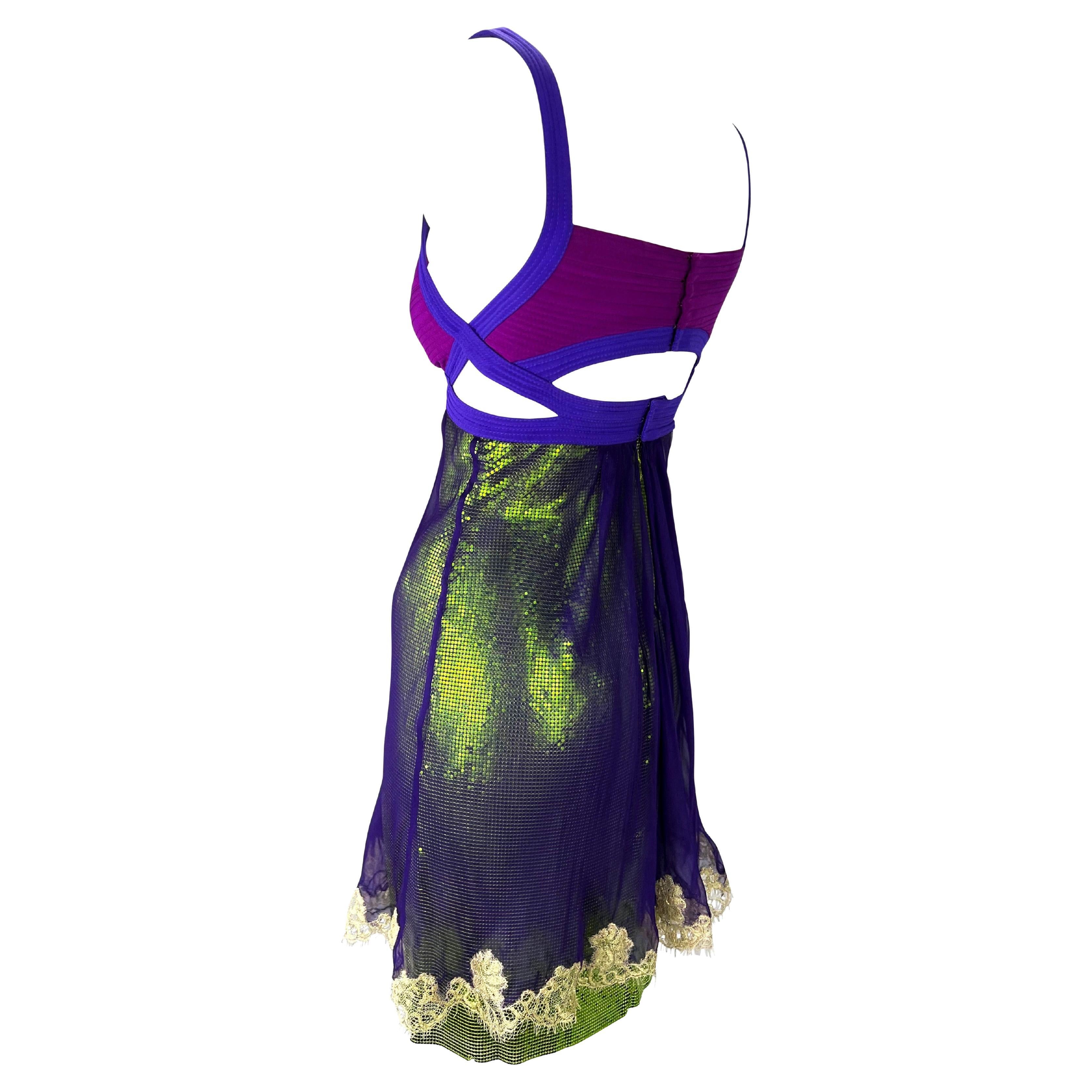 Presenting an incredible acid green and purple Oroton Gianni Versace Couture mini dress designed by Donatella Versace. From the Spring/Summer 2003 collection, this dress debuted as Look 55, modeled by Nicola Breytenbach. This ultra-sexy dress was also worn by Eve to the 2003 MTV Movie Awards and by Paris Hilton to the 2009 Grammy Awards. This dress features a bandeau bust with an angular neckline and openings between the bust and the dress's skirt. The skirt is a vibrant green Oroton chainmail skirt with a sheer silk and lace overlay. An incredible Versace Y2K masterpiece, this dress is the perfect sexy throwback.