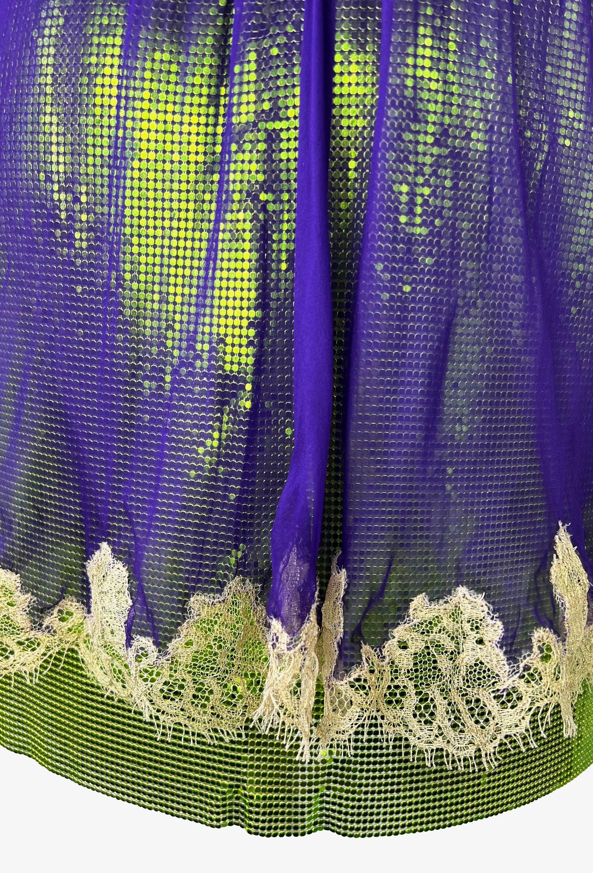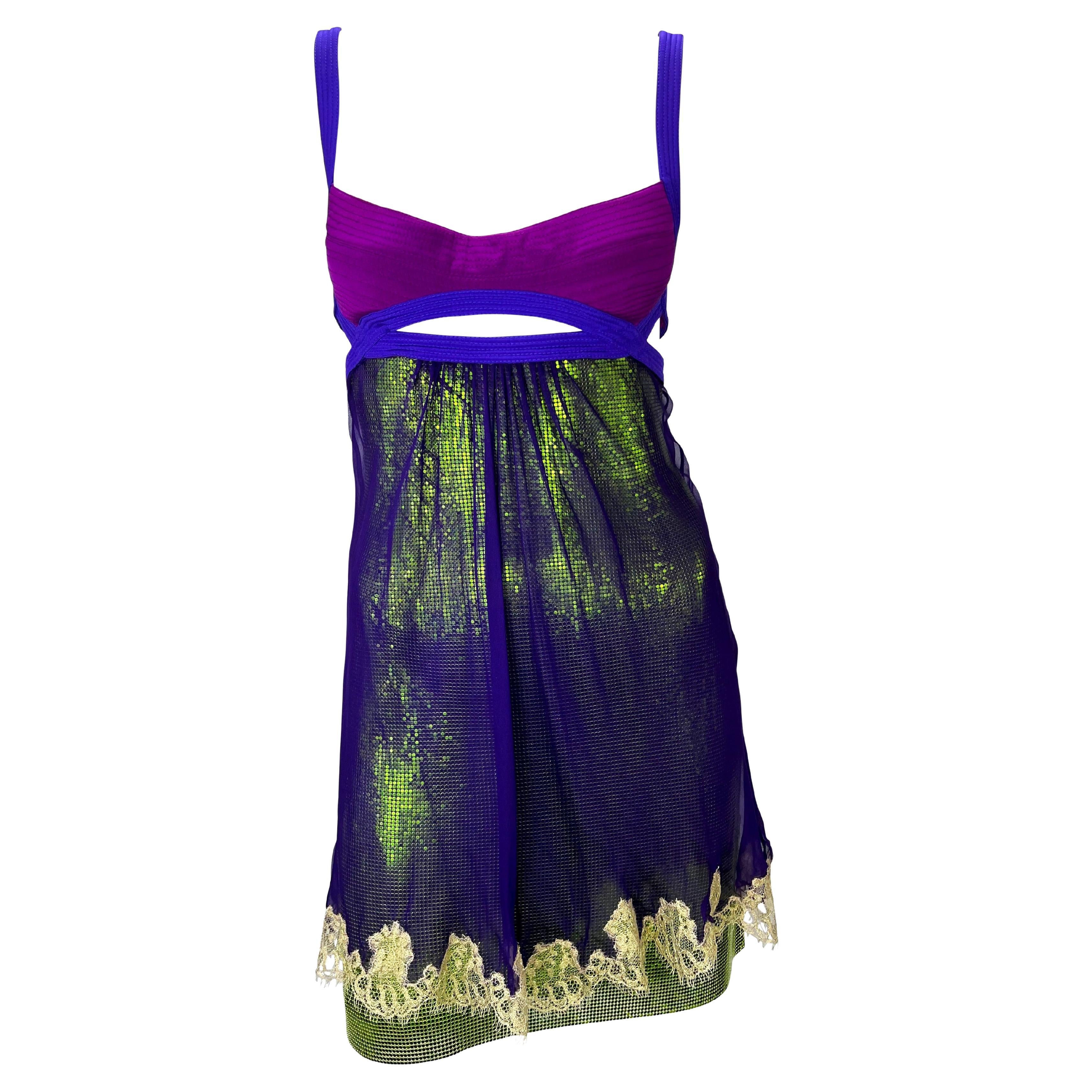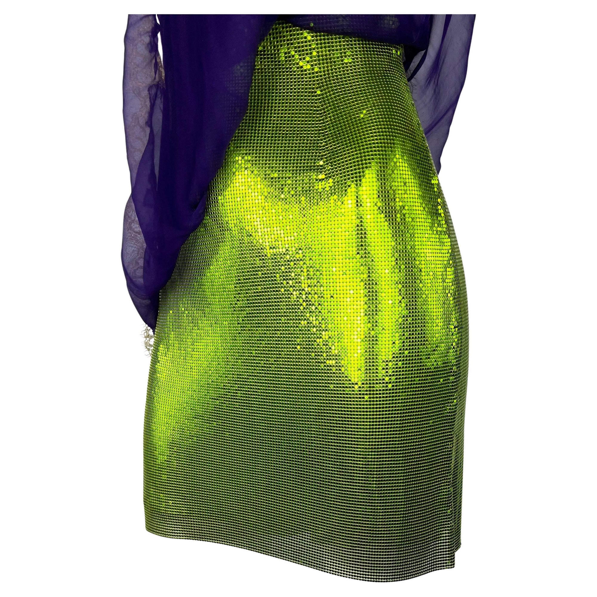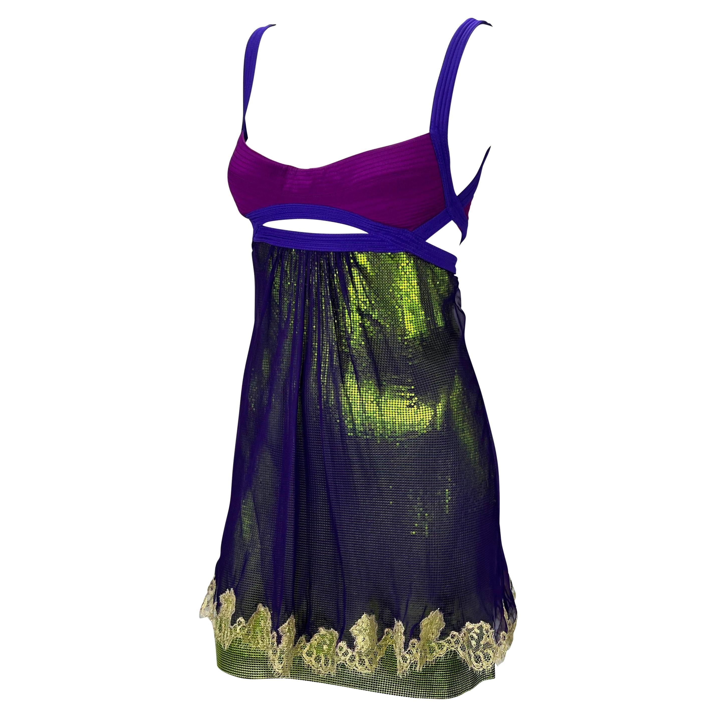 Presenting an incredible acid green and purple Oroton Gianni Versace Couture mini dress designed by Donatella Versace. From the Spring/Summer 2003 collection, this dress debuted as Look 55, modeled by Nicola Breytenbach. This ultra-sexy dress was also worn by Eve to the 2003 MTV Movie Awards and by Paris Hilton to the 2009 Grammy Awards. This dress features a bandeau bust with an angular neckline and openings between the bust and the dress's skirt. The skirt is a vibrant green Oroton chainmail skirt with a sheer silk and lace overlay. An incredible Versace Y2K masterpiece, this dress is the perfect sexy throwback.