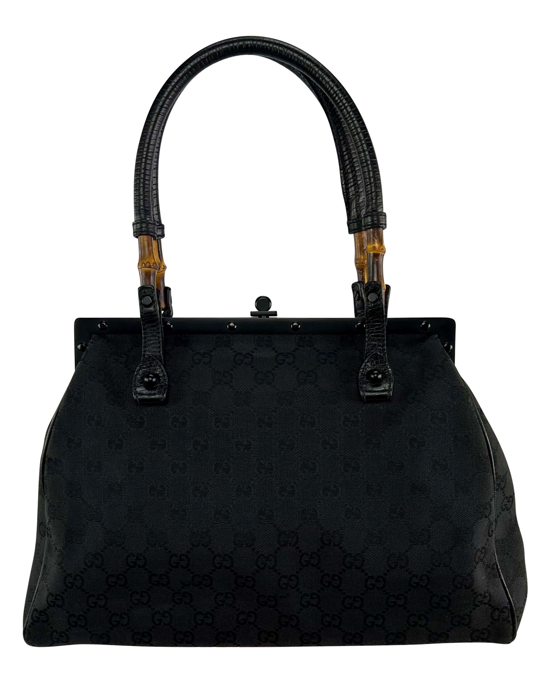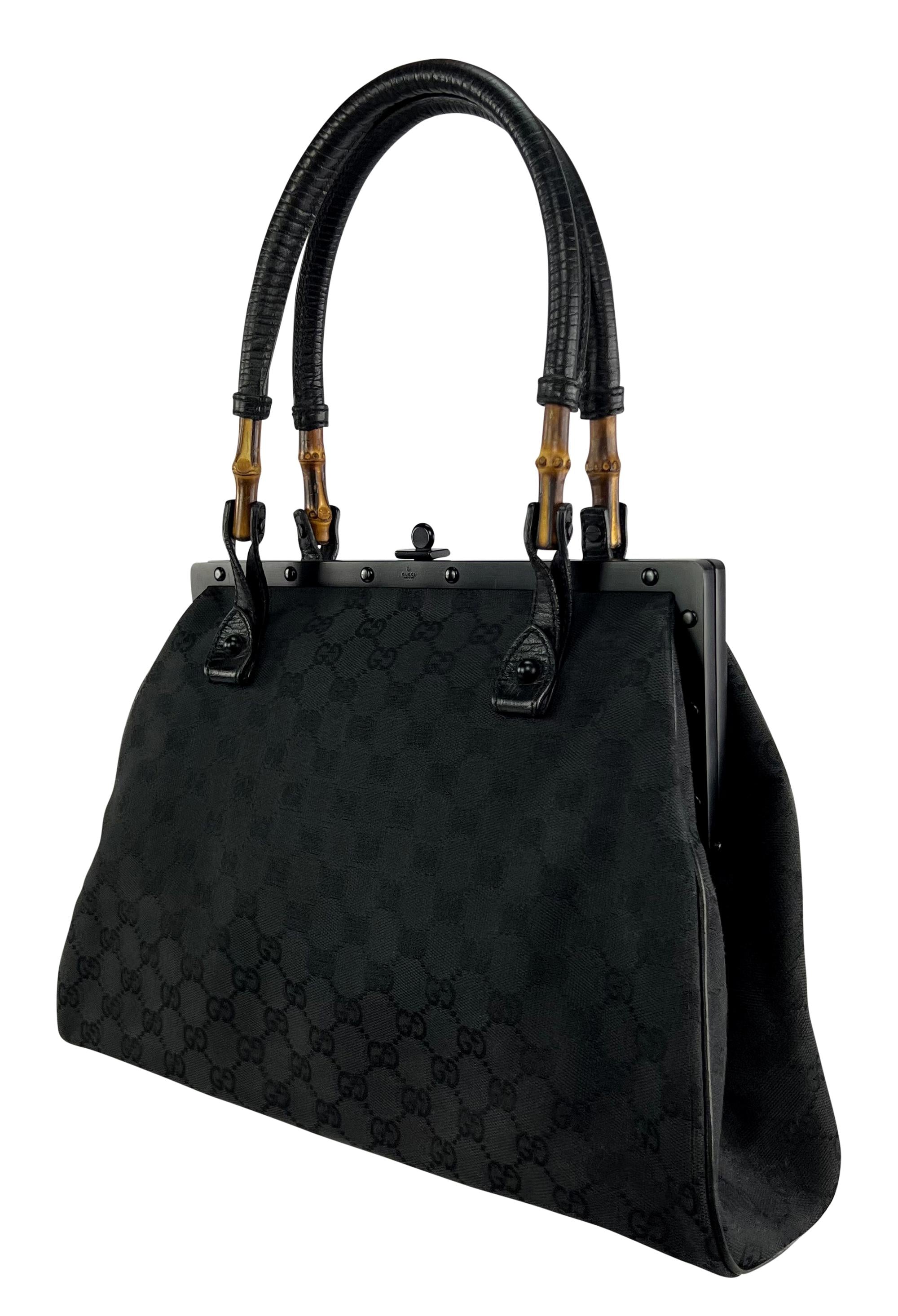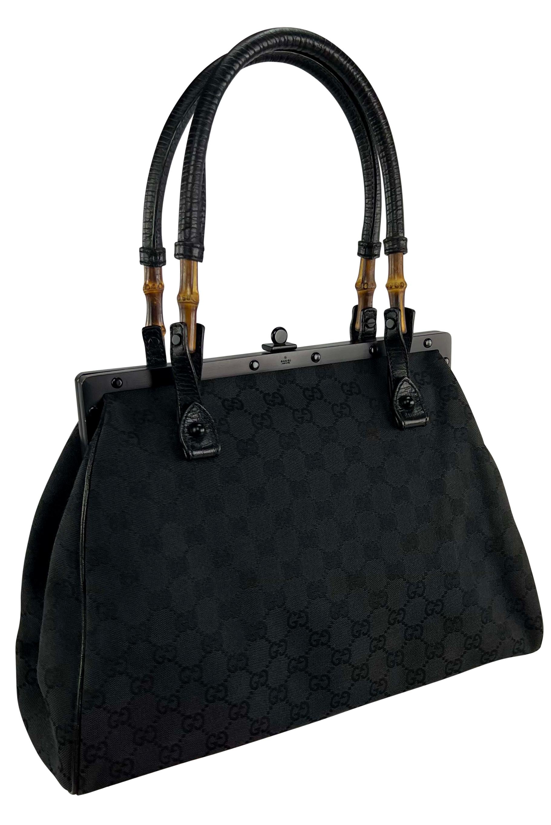 From the Spring/Summer 2003 collection, this Gucci by Tom Ford black canvas bag is covered in the brand's famous 'GG' pattern. This sleek shoulder tote features a black metal clamshell closure and is complete with bamboo accents at the leather handles.