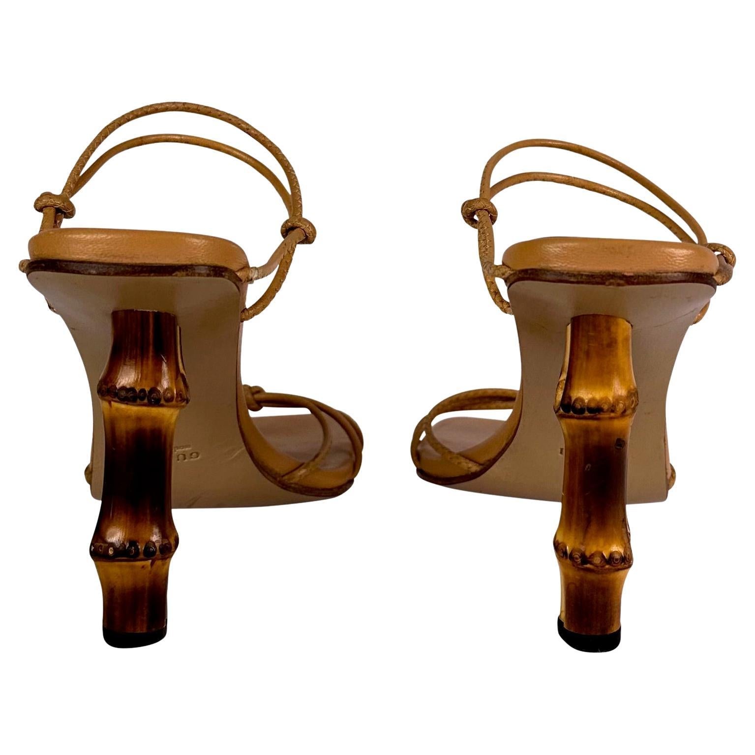 Presenting a sensual pair of leather wrapped Gucci bamboo heels, designed by Tom Ford. This stunning pair of shoes is part of Ford's Spring/Summer 2003 collection during his tenure at Gucci. These heels are made of a tan leather sole and leather tie around laces with a large piece of bamboo as the heel.