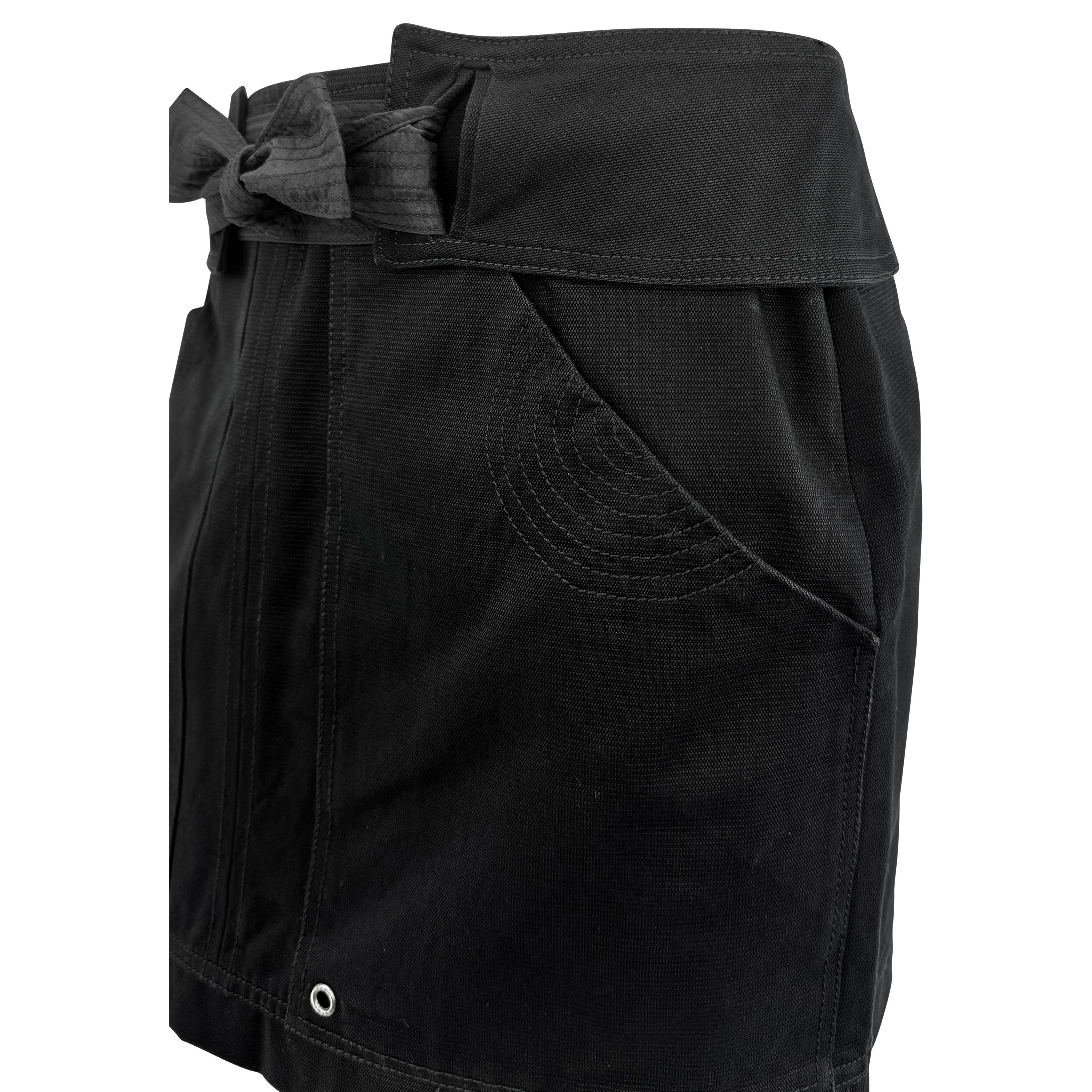 From Tom Ford’s Spring/Summer 2003 Gucci collection, this black mini skirt is crafted in structured cotton twill with tonal topstitching. The design features front pockets with an emroidered design, silver-tone grommet details at the hem, and a wide silk belt that ties in a bow at the waist. A version of this design debuted on the season's runway.