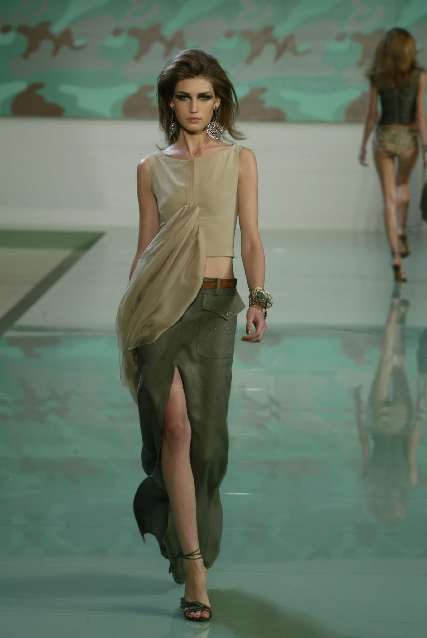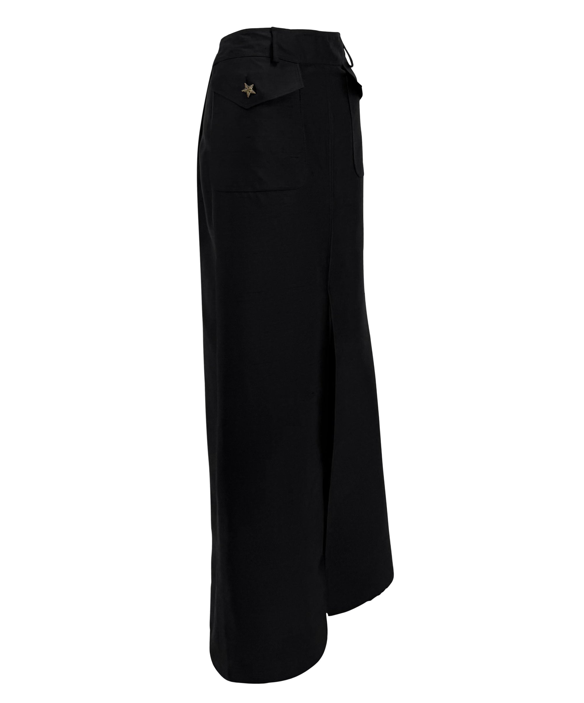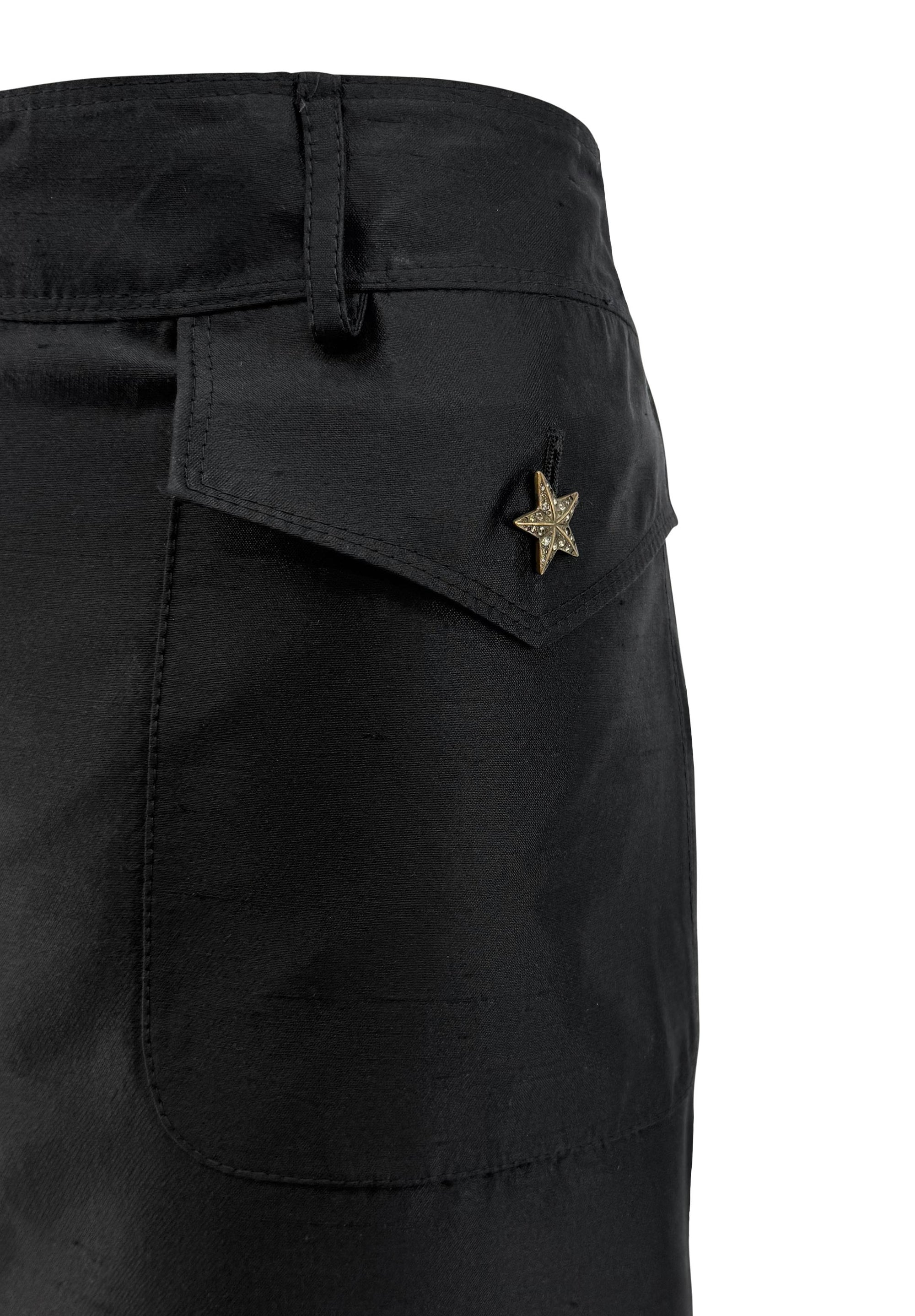 From Valentino Garavani’s Spring/Summer 2003 collection, this black raw silk maxi skirt features oversized cargo-style pockets adorned with gold-tone star buttons. The fabric has a subtle slubbed texture, cut with a dramatic center-front slit. Fully reversible, the skirt debuted on the runway in army green, modeled by Eugenia Volodina.