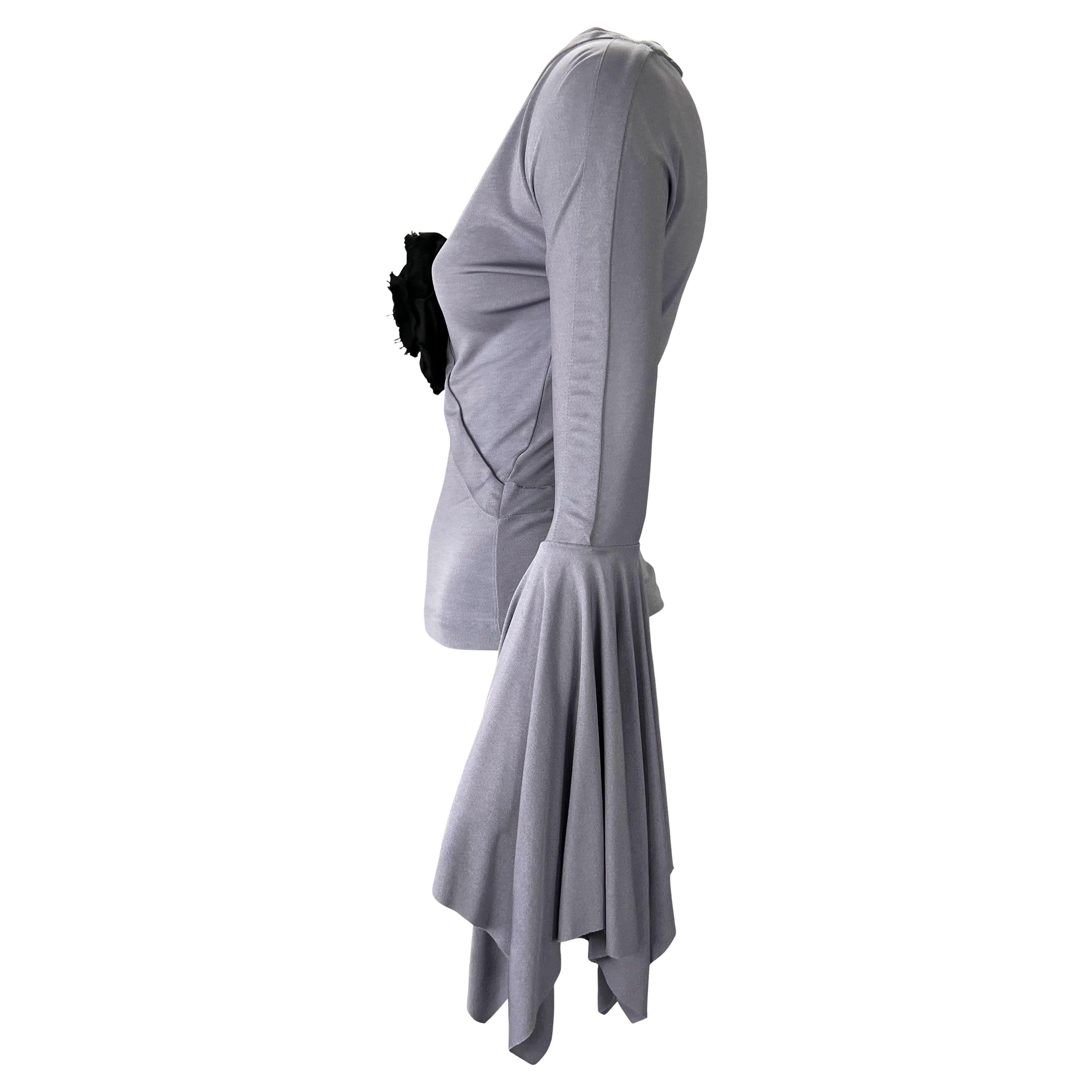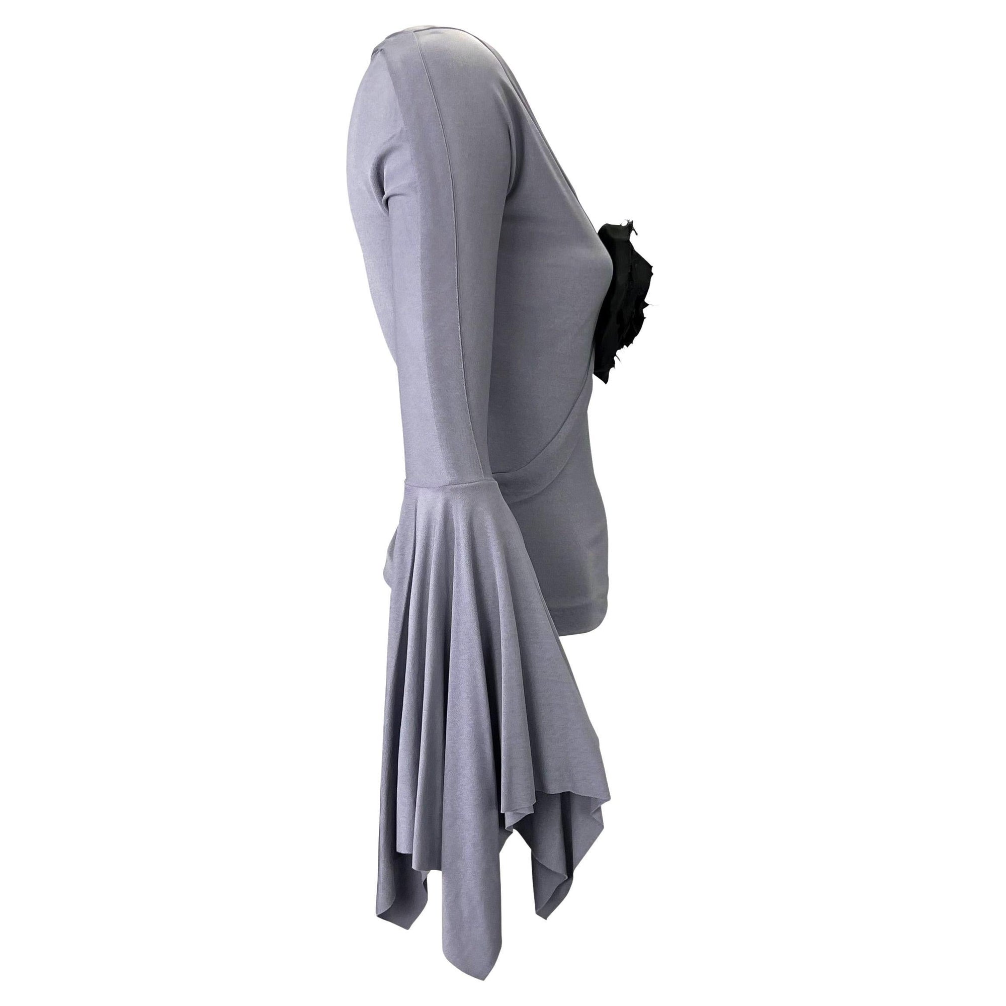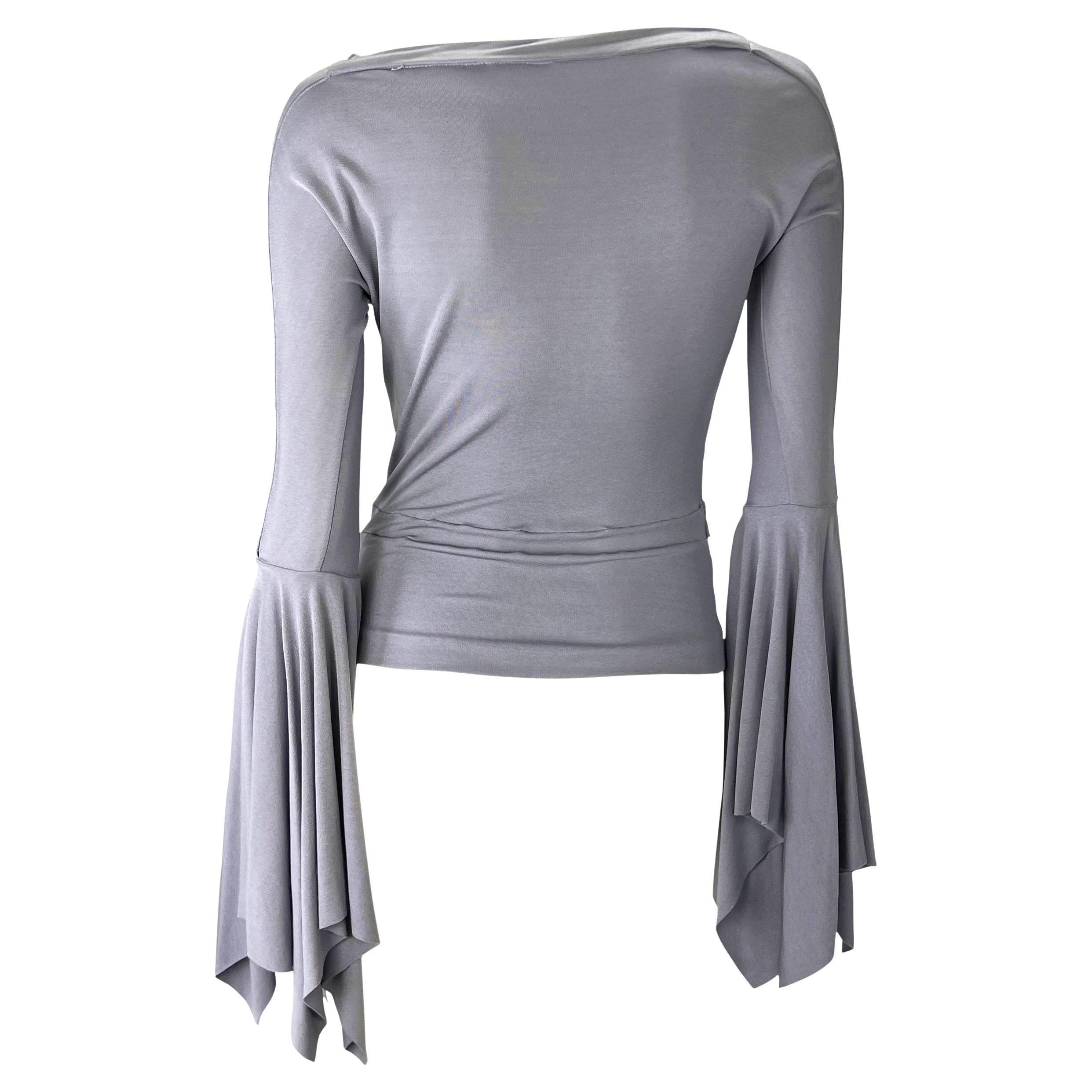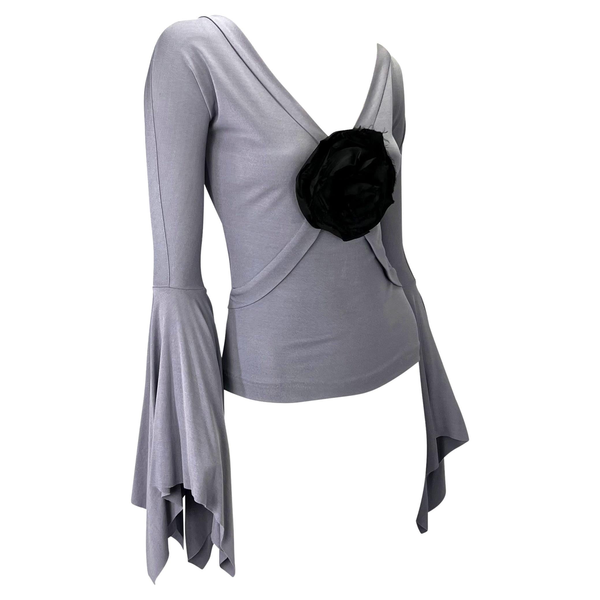 Presenting a lavender stretch blouse designed by Tom Ford for Yves Saint Laurent Rive Gauche's Spring/Summer 2003 collection. The bell sleeves and floral brooch elements were heavily featured on the season's runway, including a black dress version of this top as look number 28 on Ujjwala Raut (available for purchase on our storefront). An oversized floral brooch-like applique accents the faux-wrap style bustline.