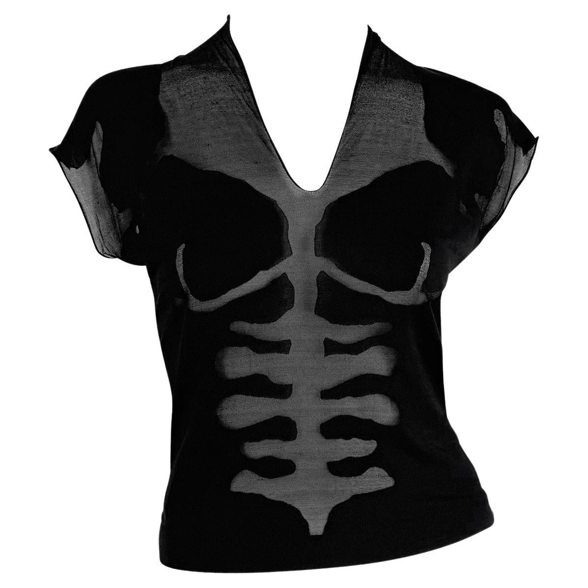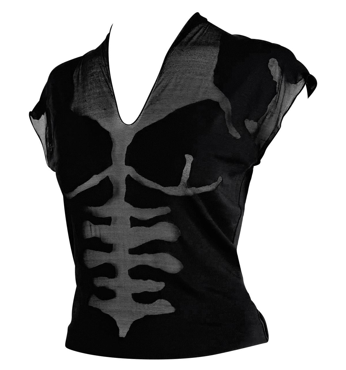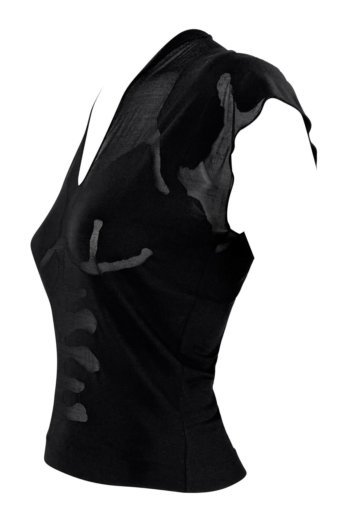 From Yves Saint Laurent by Tom Ford’s Spring/Summer 2003 collection, this sheer black tunic top features an anatomical skeletal motif across the front and back. Designed with a deep V neckline and soft cap sleeves, the top is cut from a lightweight stretch viscose that hugs the body. Similar variations of this top debuted on the season’s runway.