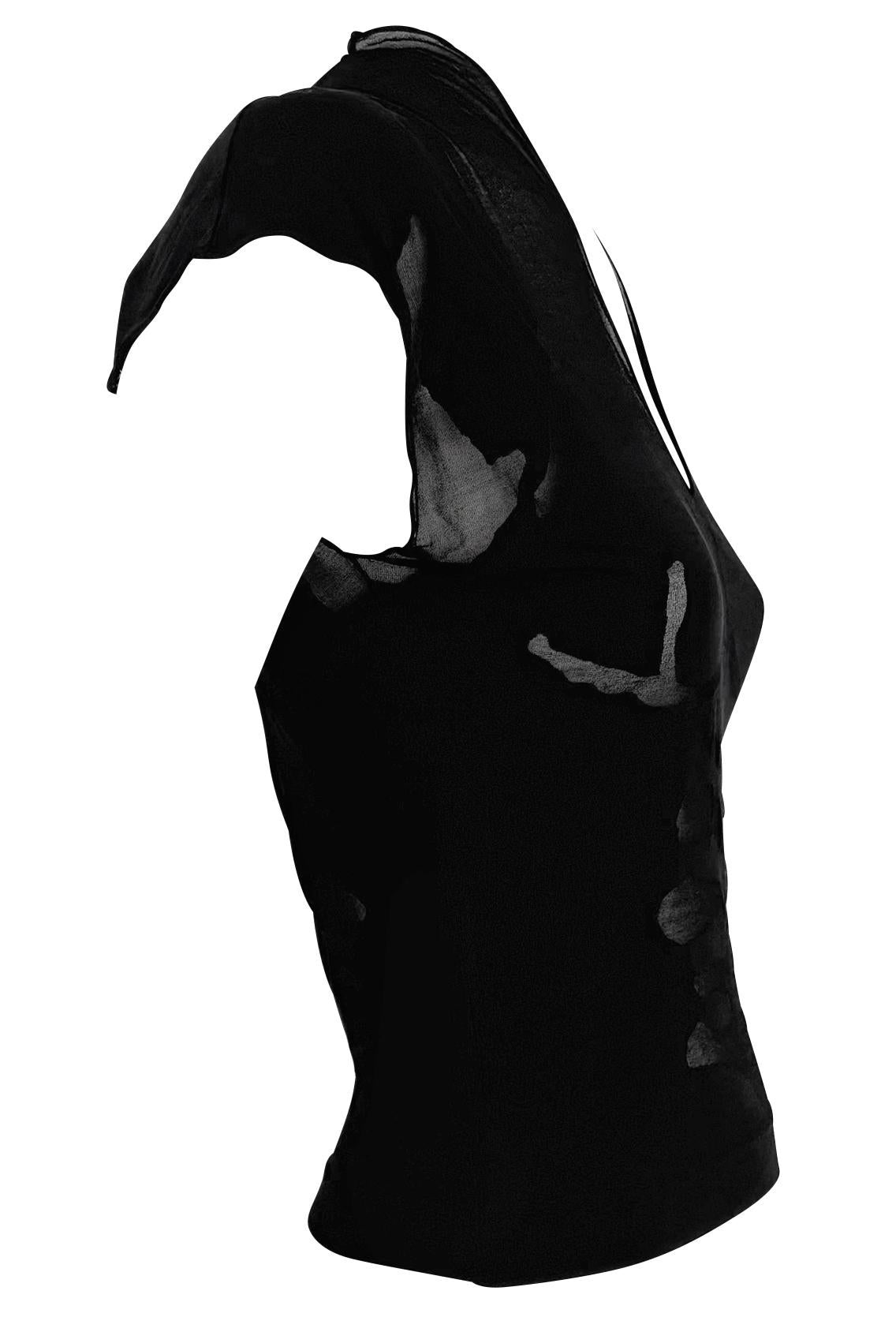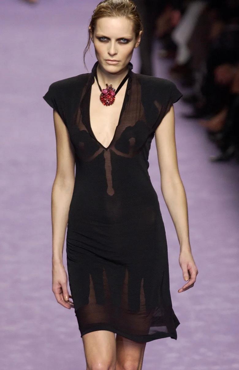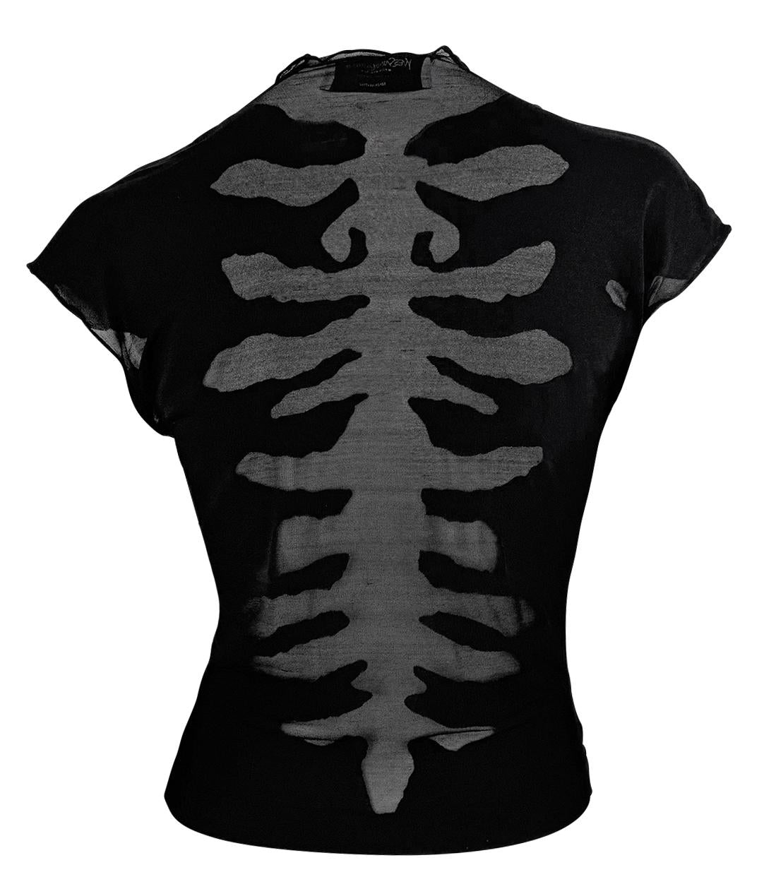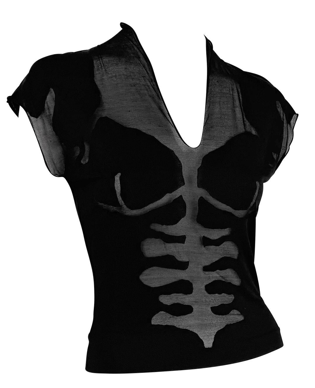 From Yves Saint Laurent by Tom Ford’s Spring/Summer 2003 collection, this sheer black tunic top features an anatomical skeletal motif across the front and back. Designed with a deep V neckline and soft cap sleeves, the top is cut from a lightweight stretch viscose that hugs the body. Similar variations of this top debuted on the season’s runway.