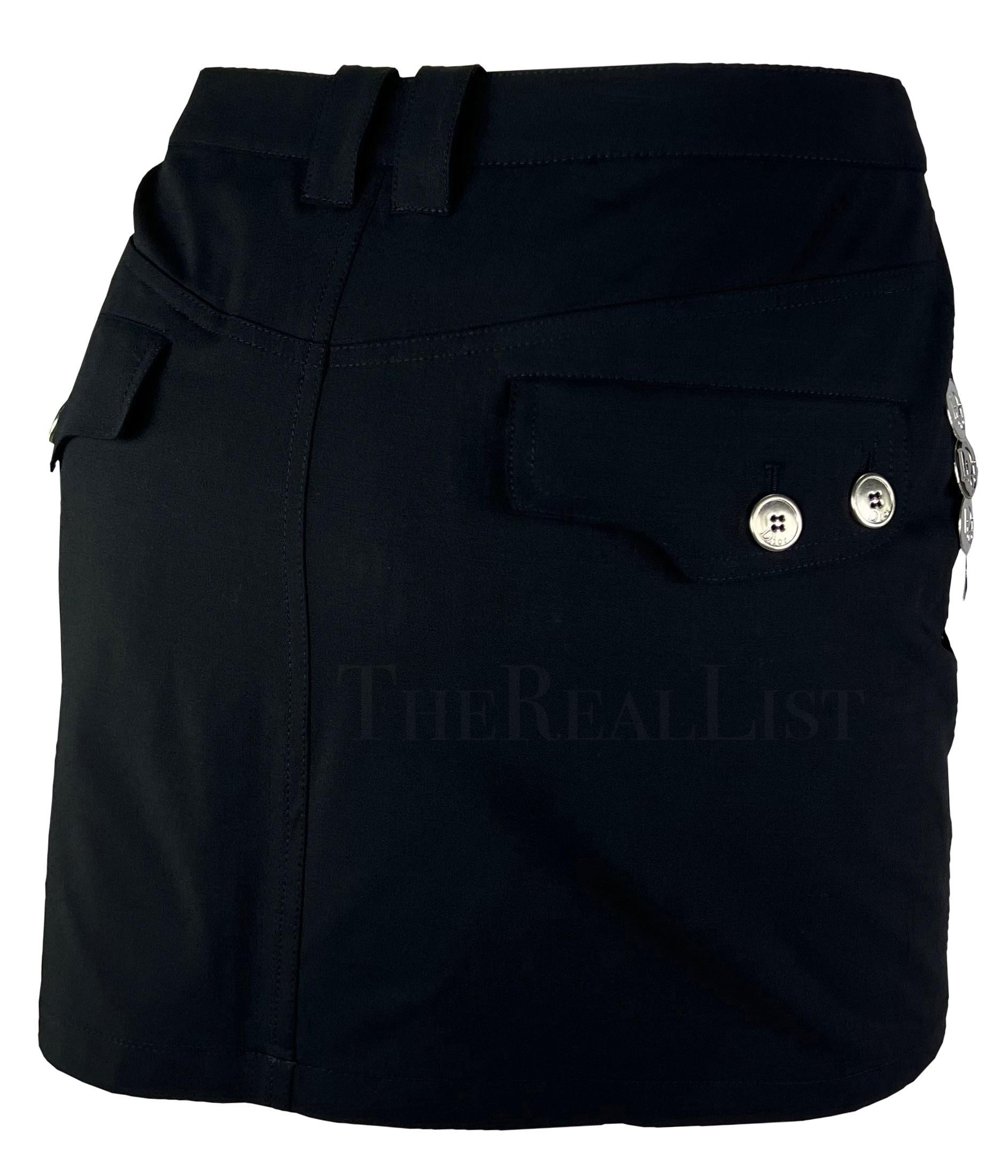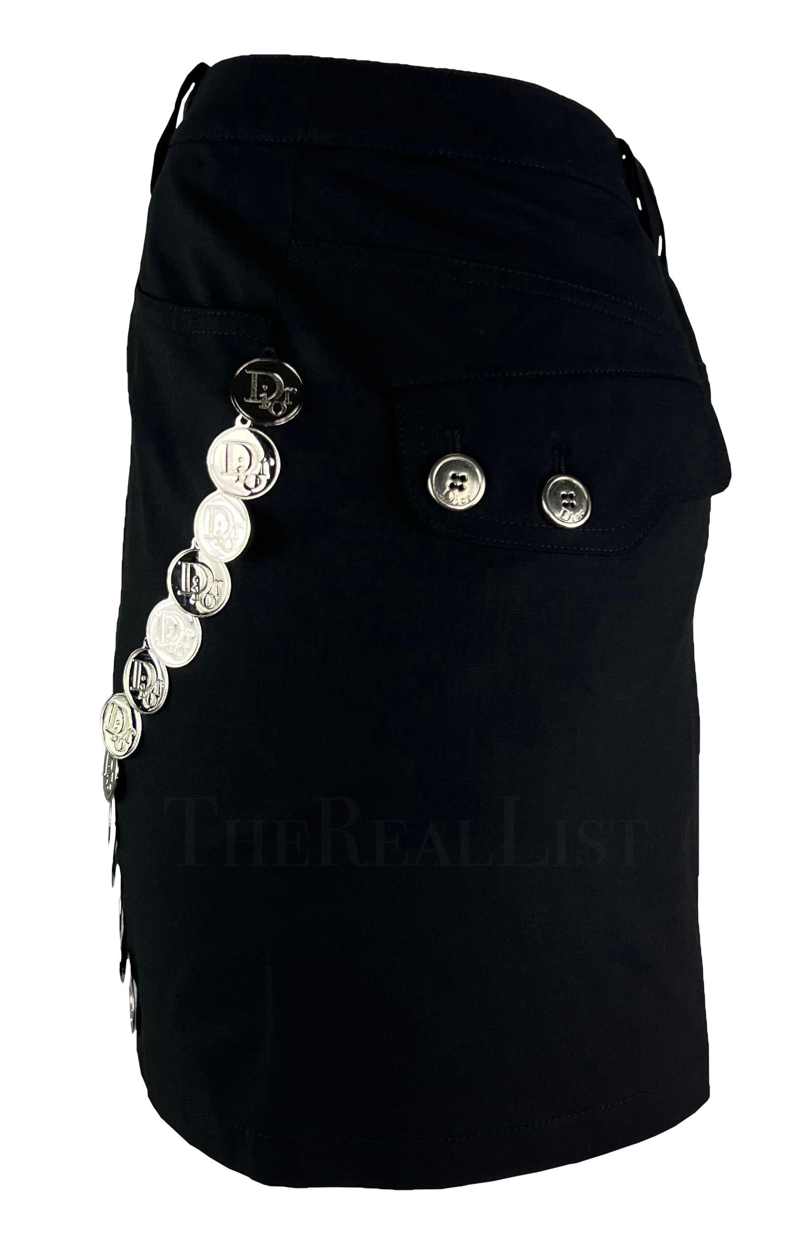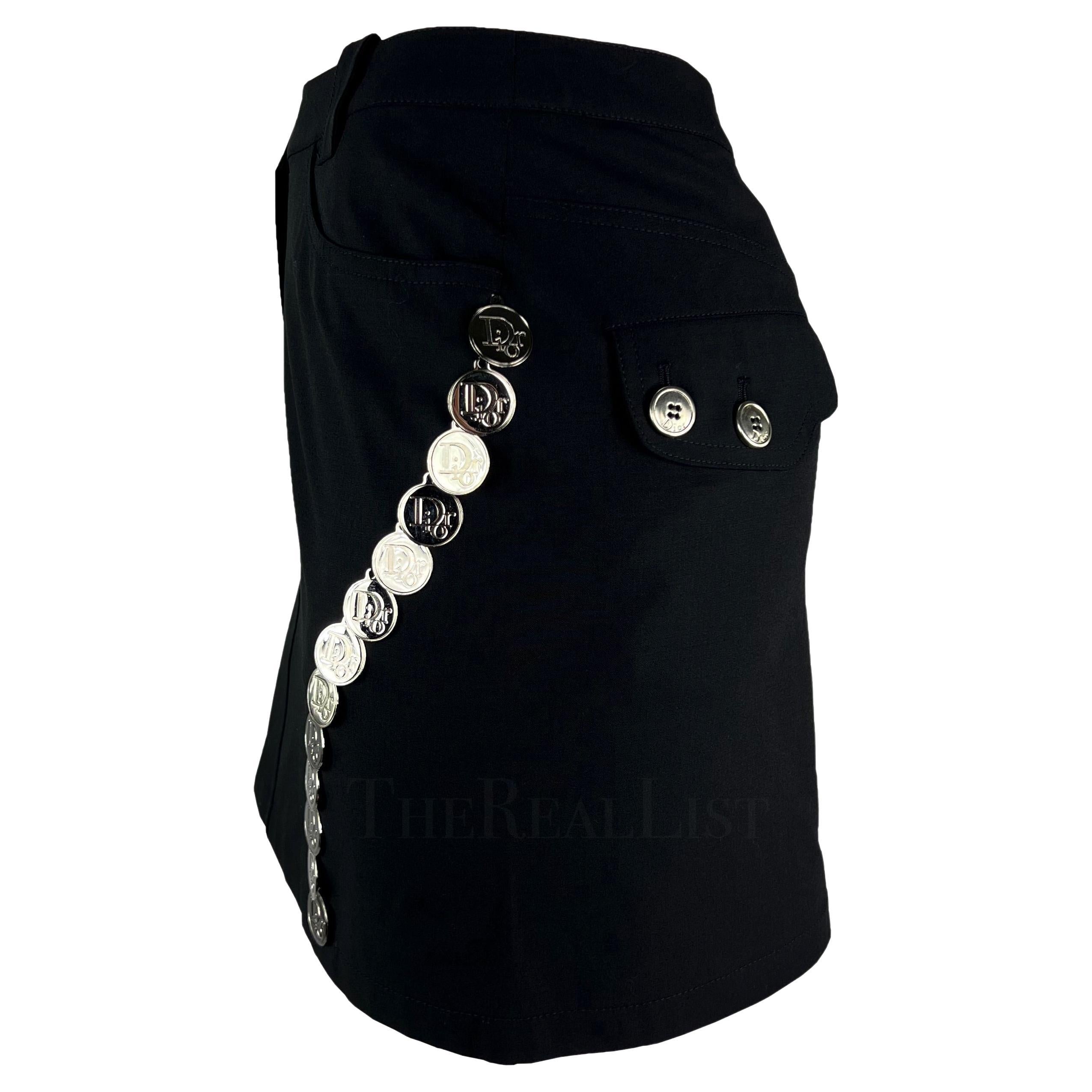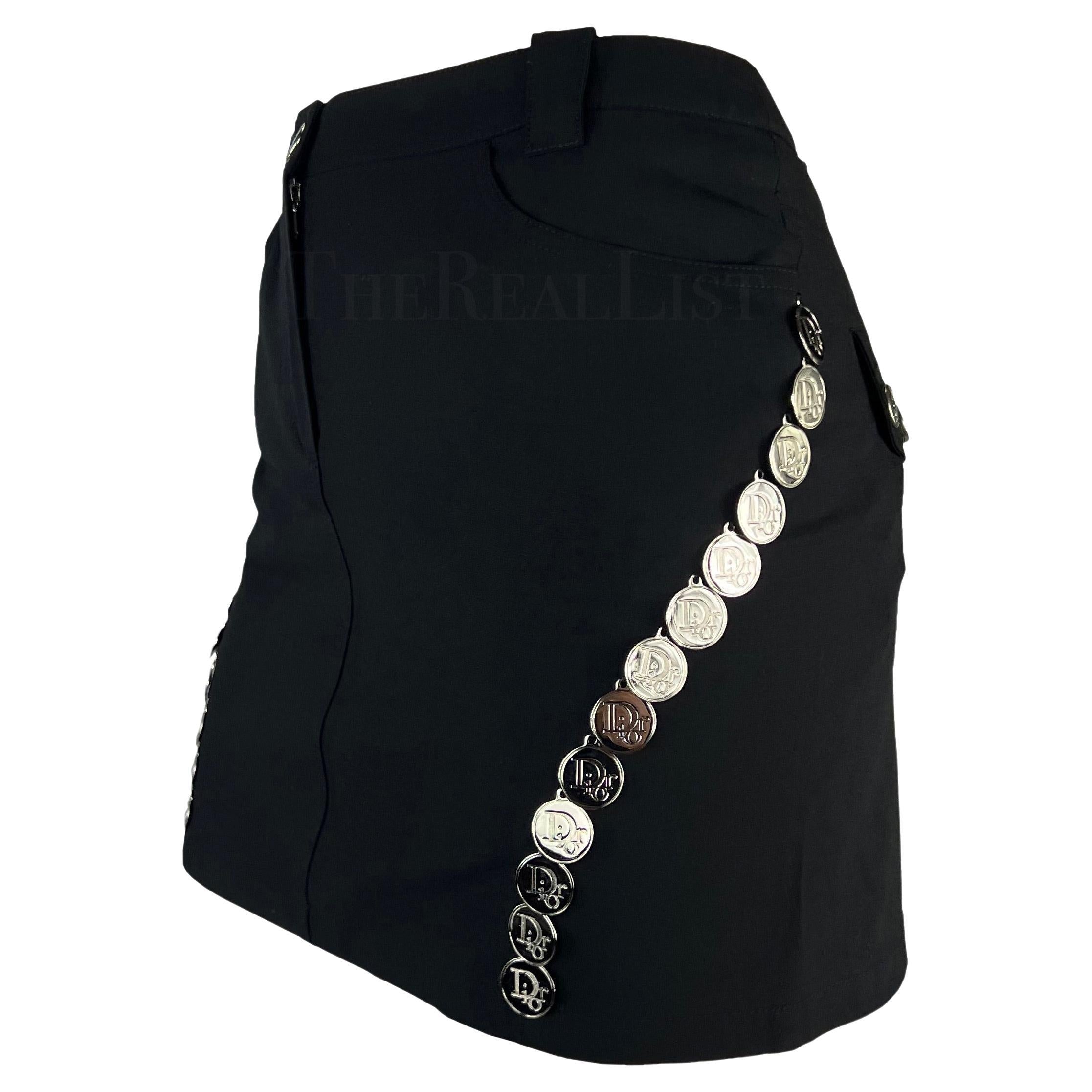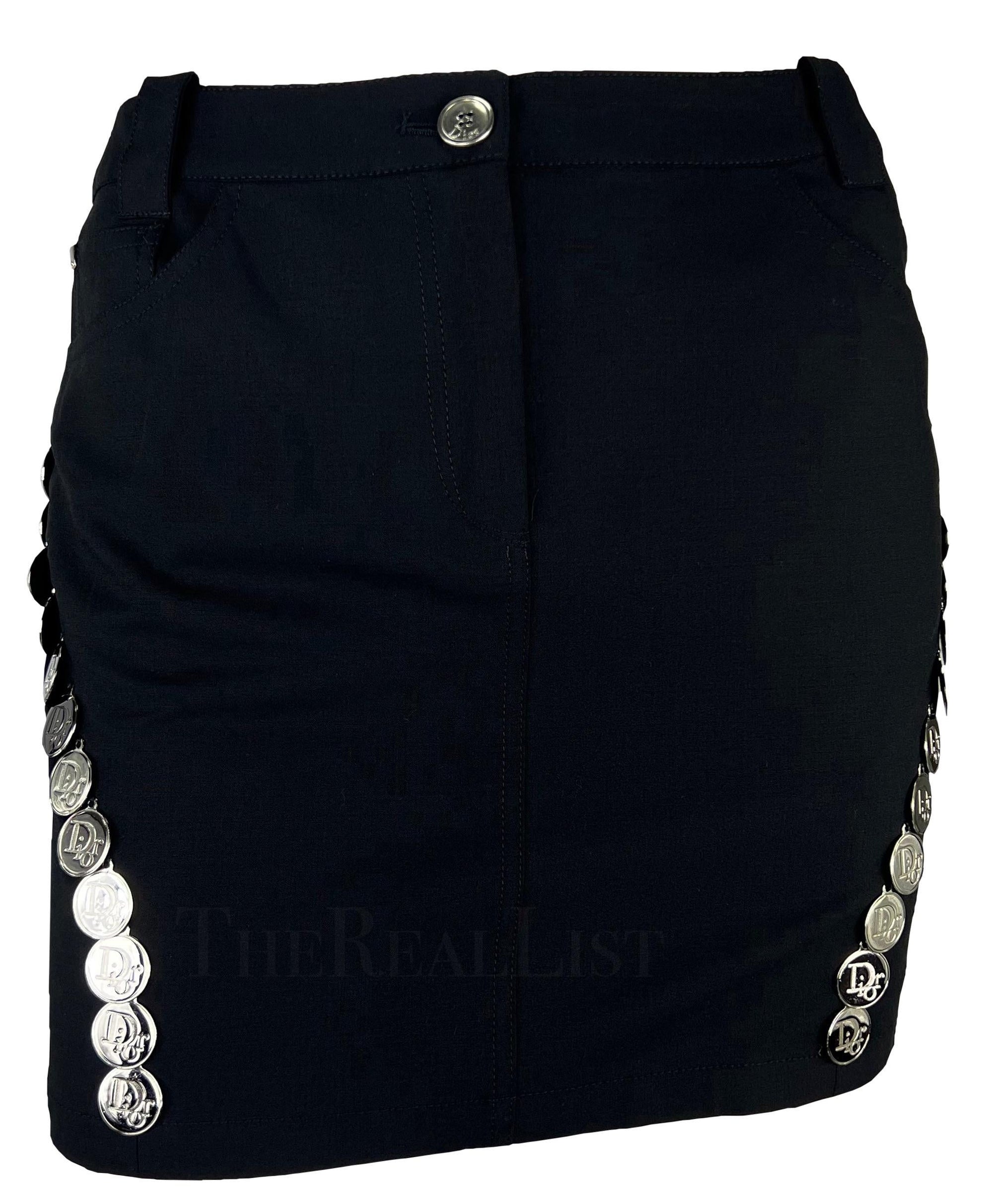 Presenting a fabulous black Christian Dior mini skirt, designed by John Galliano. From the Spring/Summer 2004 collection, this chic black skirt is elevated with silver-tone 'Dior' logo medallions that run down either side. Size - 38FR/6US Waistband to hem: 28" Waist: 31 - 32" Hips: 37 - 42" 57% Viscose, 39% wool, 4% Lycra