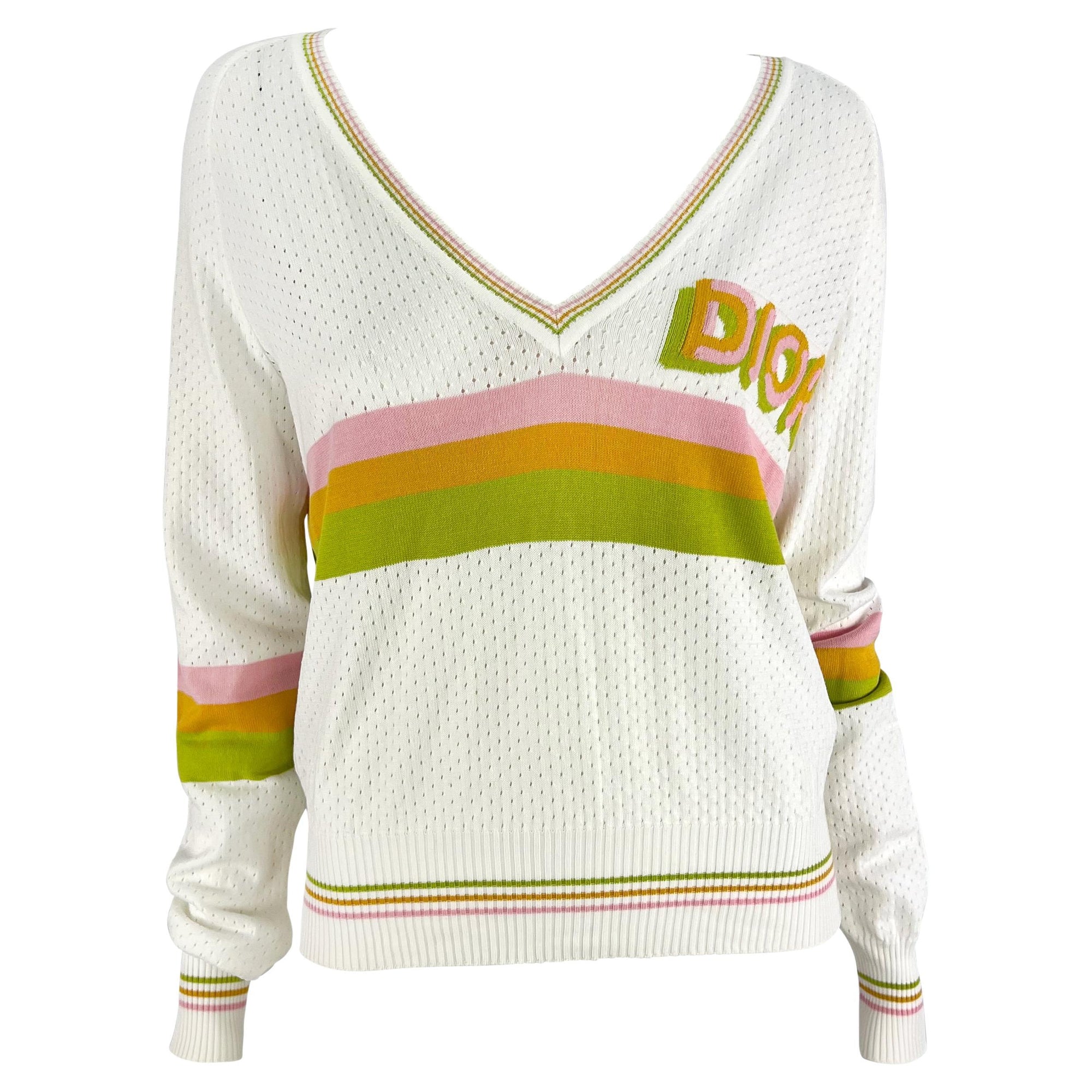 John Galliano designed this white Christian Dior sport jersey style sweater for his Spring/Summer 2004 ready to wear collection. This light weight top features perforations throughout, giving it an athletic jersey quality. The sweater features pink, orange, and green bands that wrap around the body and arms, with similar color detailing seen in the cuffs, neckline, and hem. This darling top is complete with a wide v-neckline and a large Dior logo at the front.