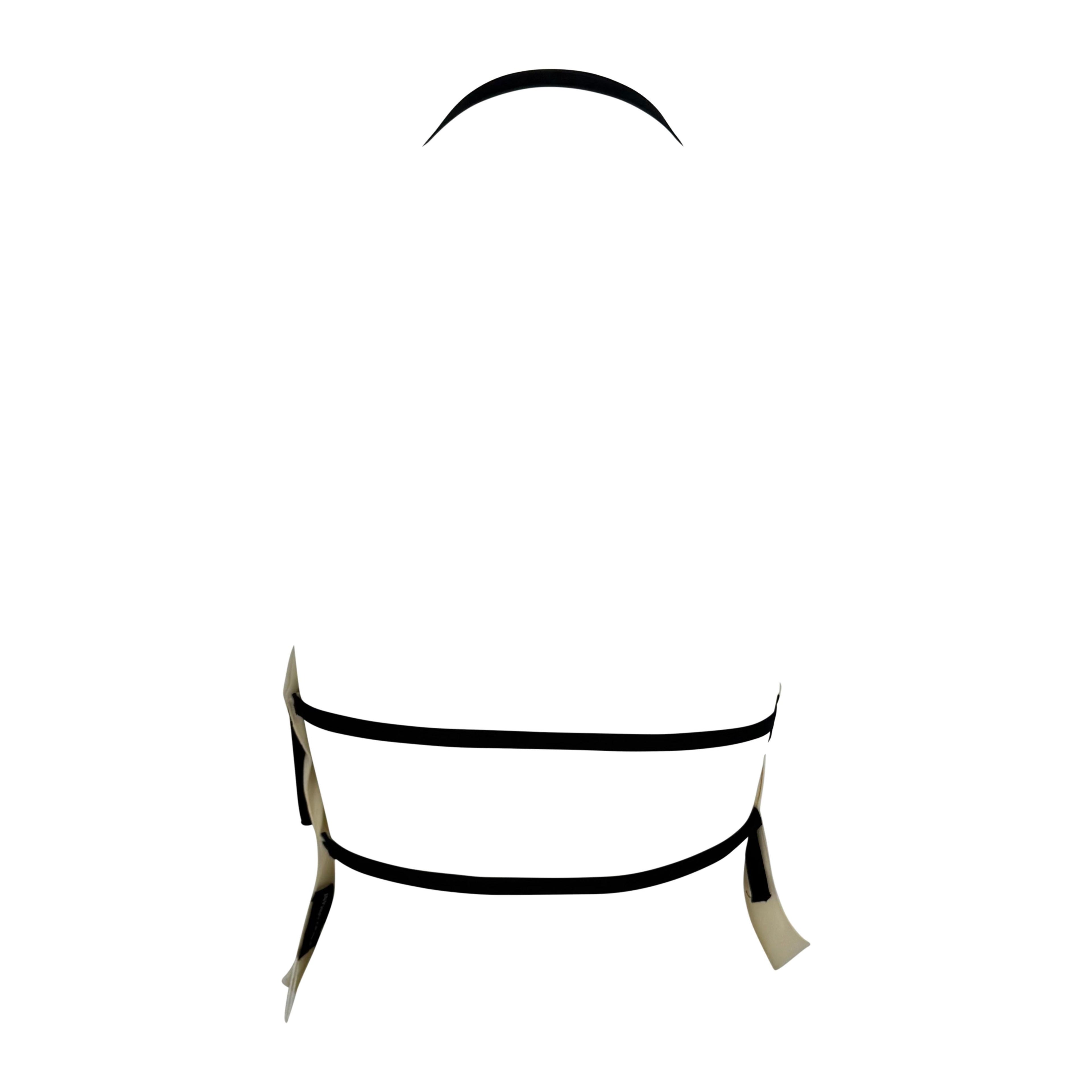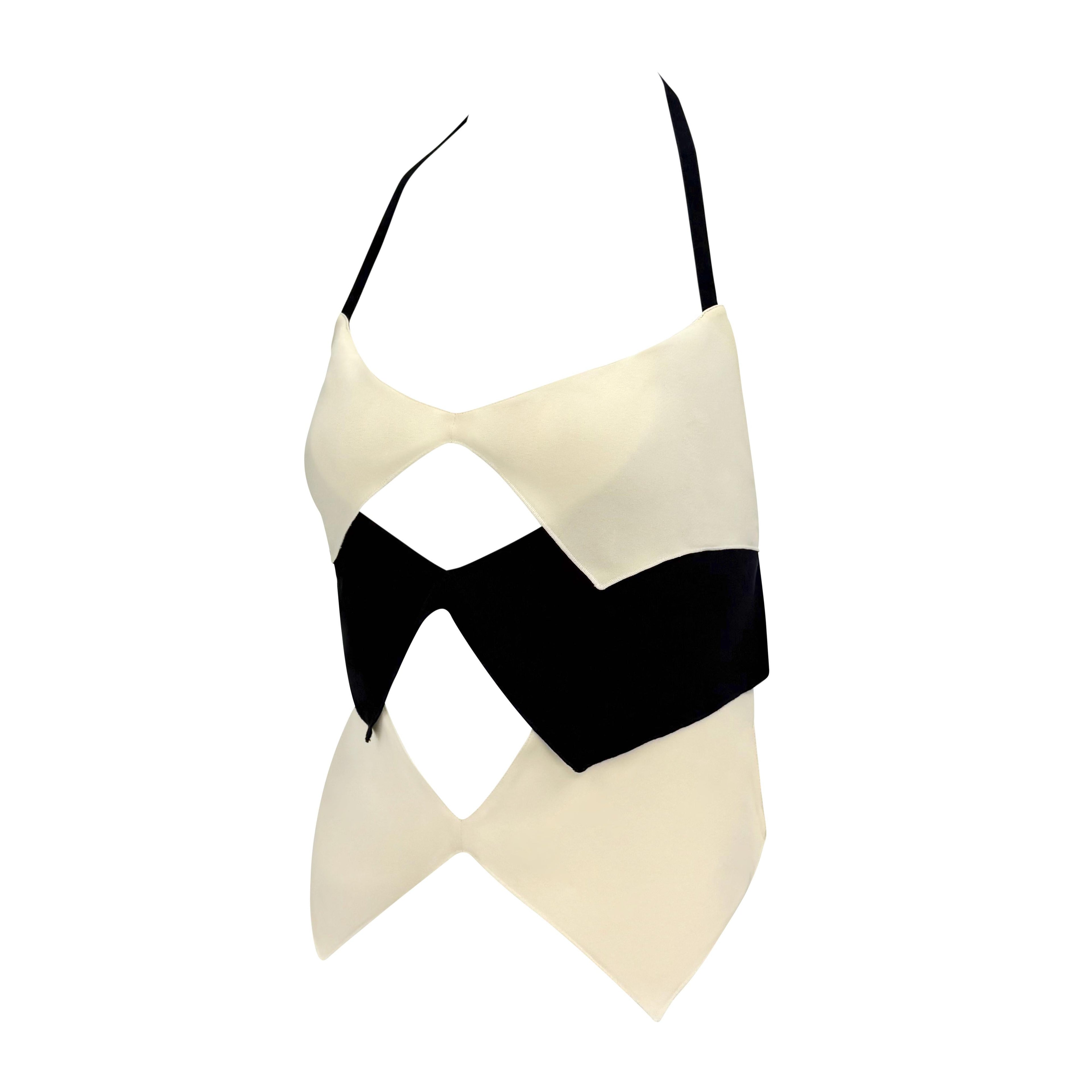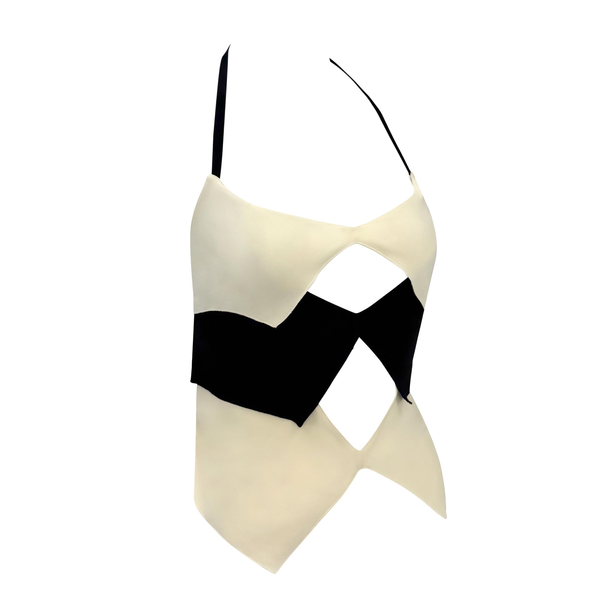 From Giorgio Armani’s Spring/Summer 2004 collection, this tiered silk top combines off-white and navy panels in a striking geometric design. The halter neckline extends into an open back with slender ties that wrap around the waist. This dramatic style debuted on the season’s runway.
