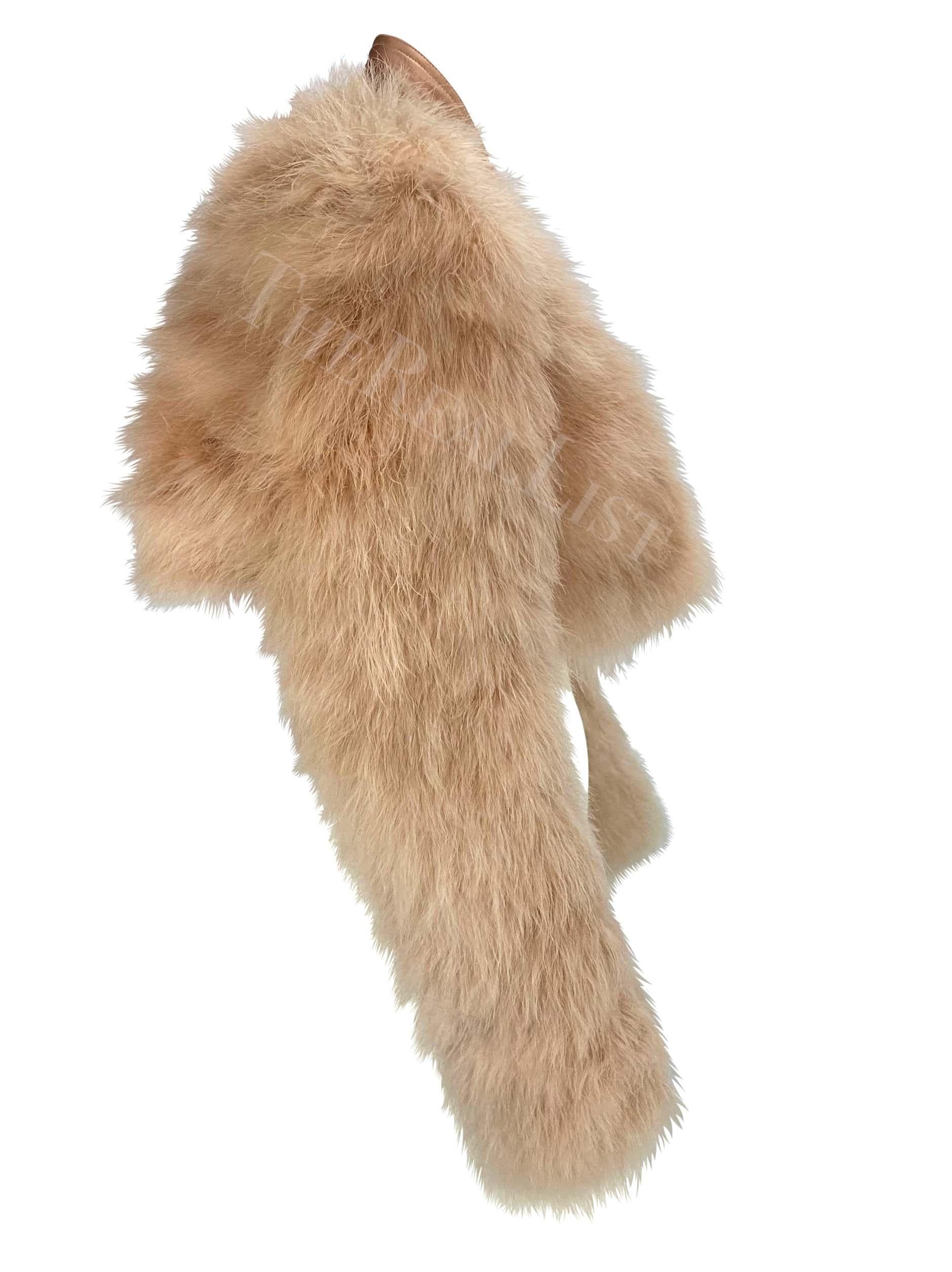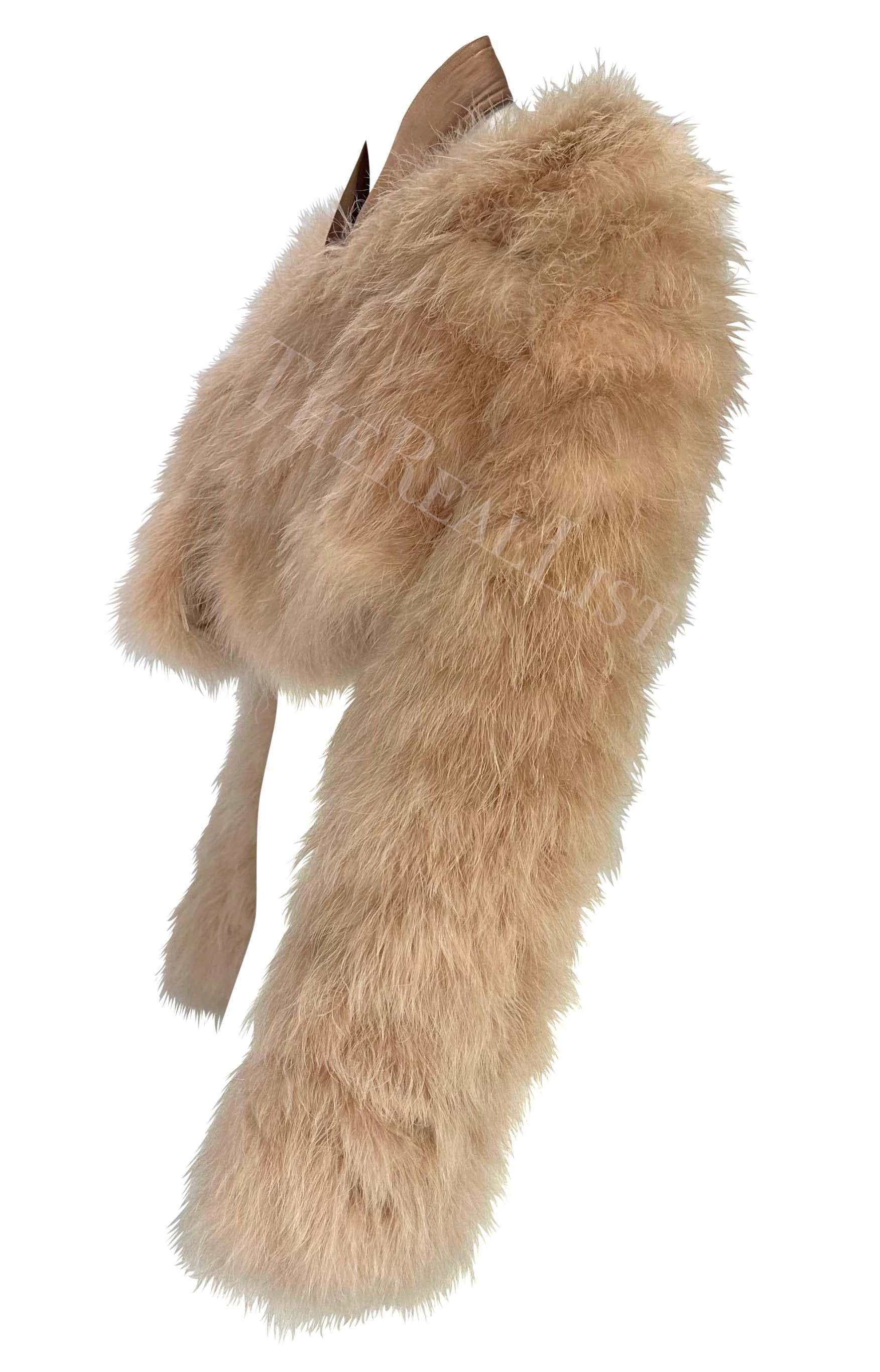 Presenting a fabulous cropped blush ostrich feather Gucci coat, designed by Tom Ford. From the Spring/Summer 2004 collection, this fabulous cropped bolero jacket debuted on the season's runway as part of look 33, modeled by Liya Kebede, and was also highlighted in the season's ad campaign. This chic marabou feather jacket was also worn in Vogue Italia's March 2004 editorial, modeled by Jennifer Connelly and captured by Nathaniel Goldberg. Featuring a satin ribbon that wraps around the neck and a wide scoop neckline. A rare and stunning piece from Ford's penultimate collection at Gucci this jacket is a must-have addition to any wardrobe.