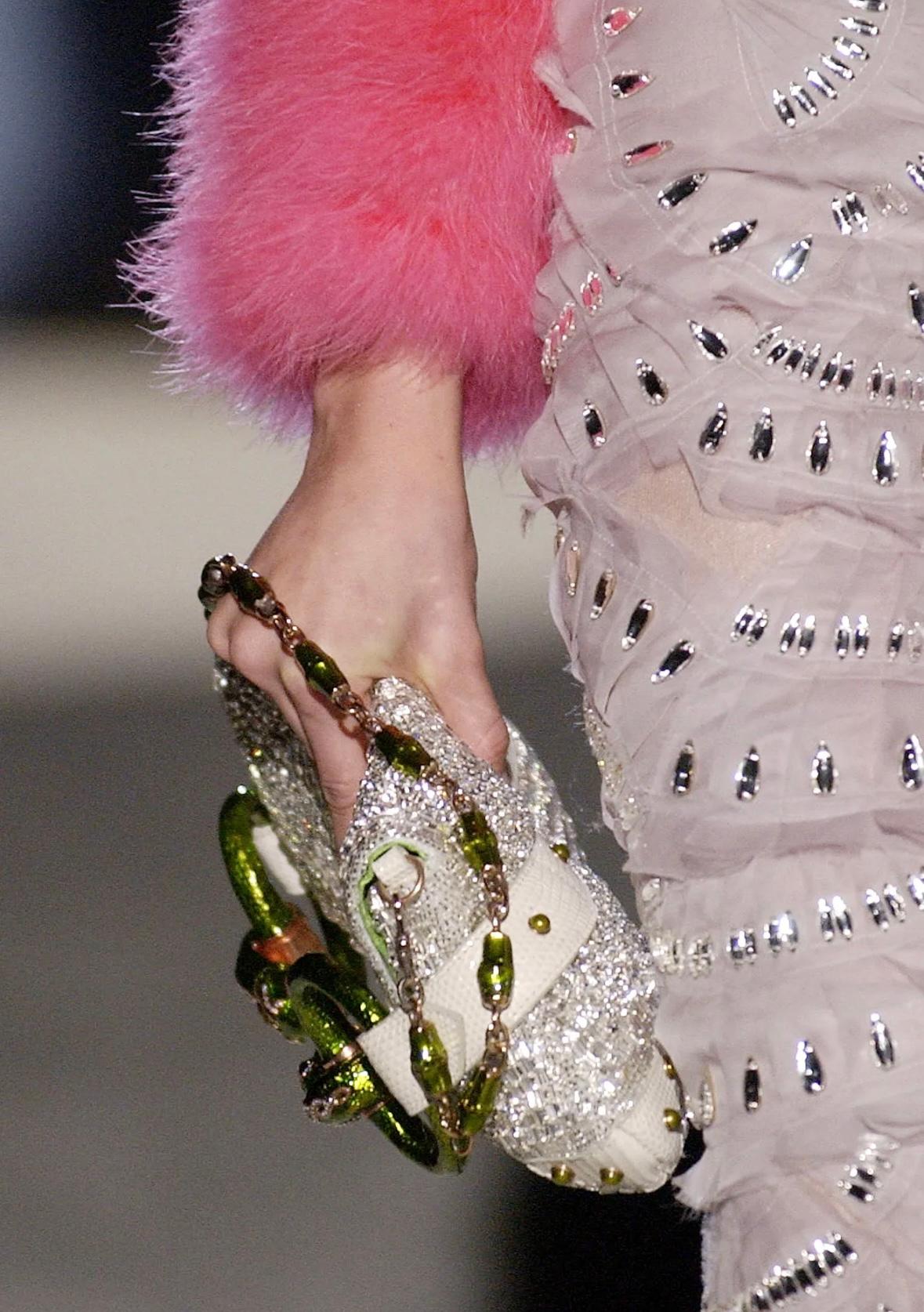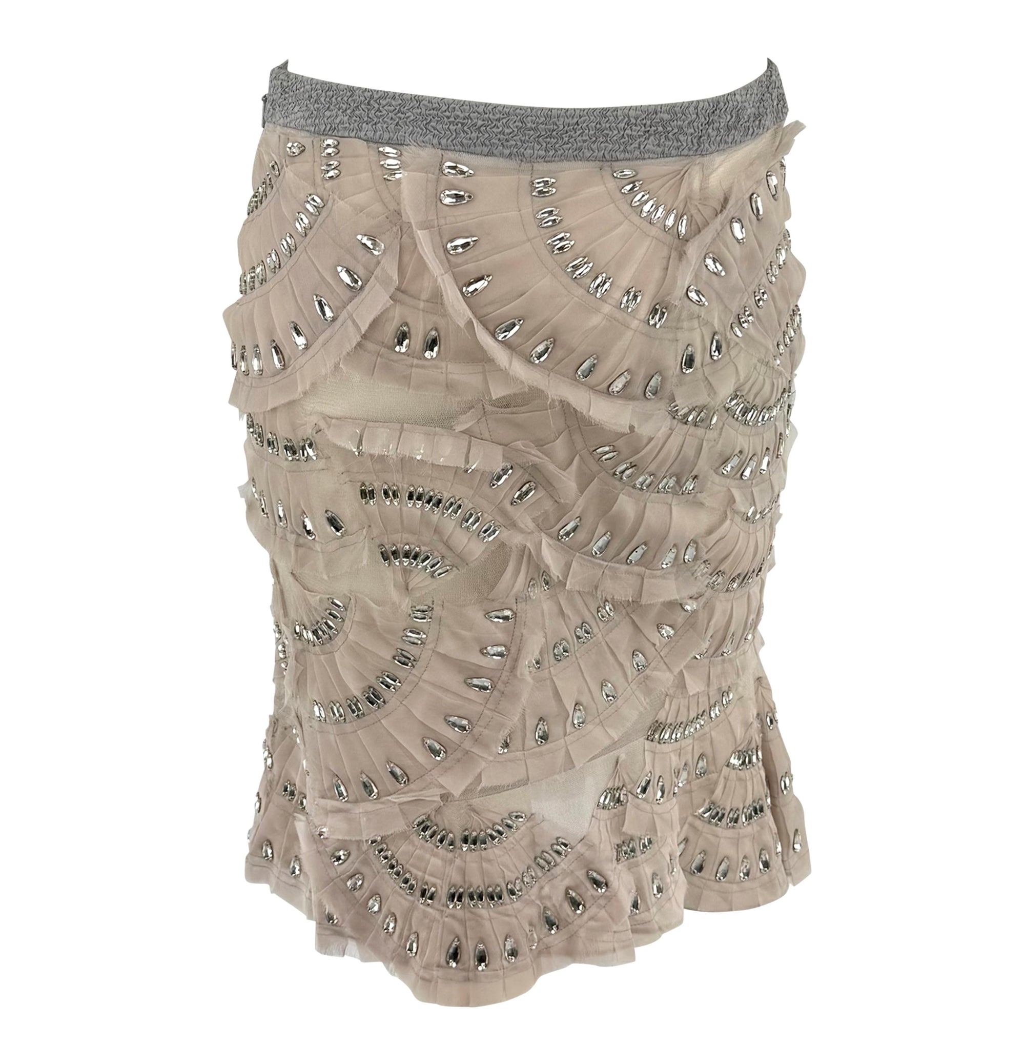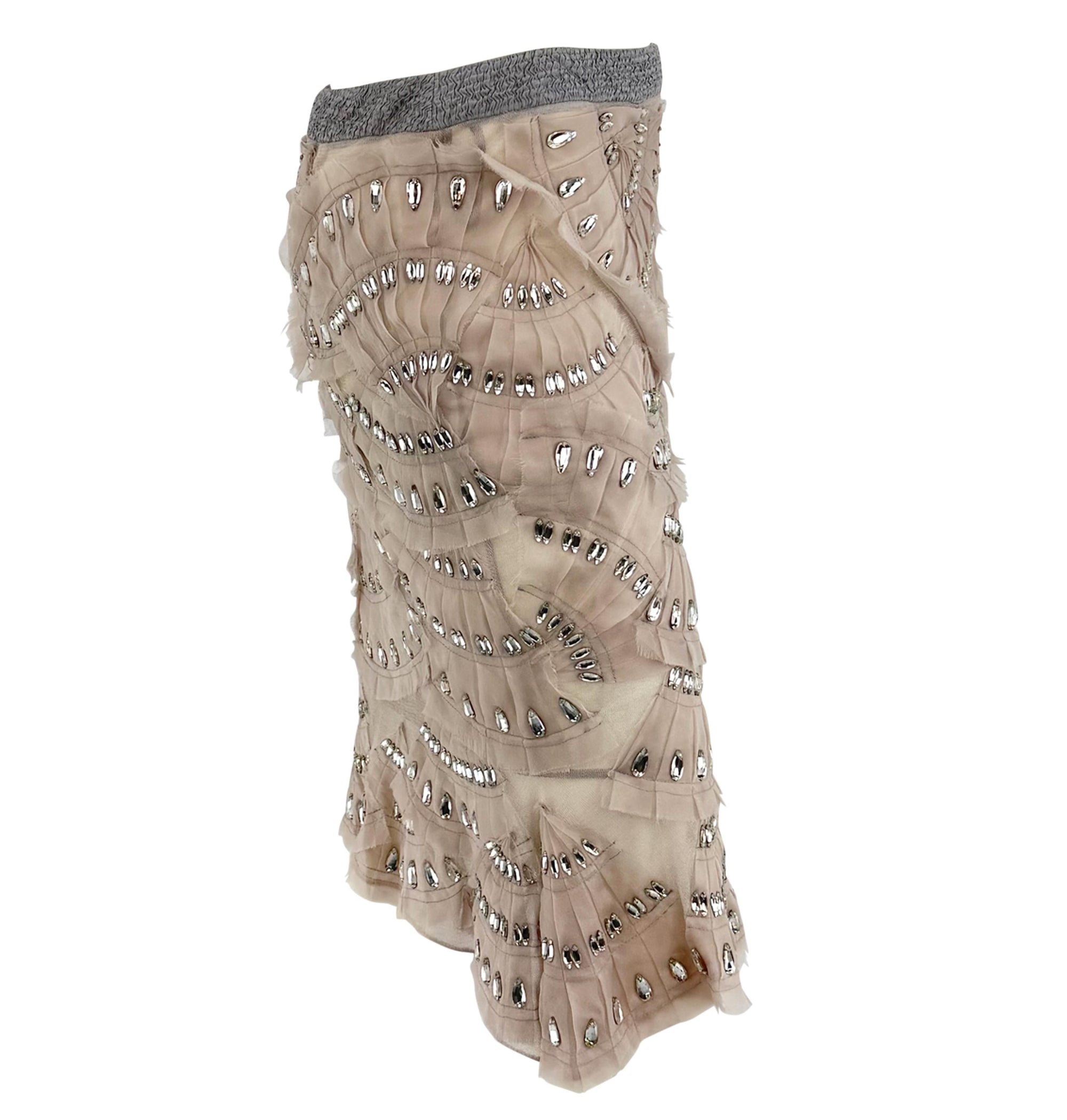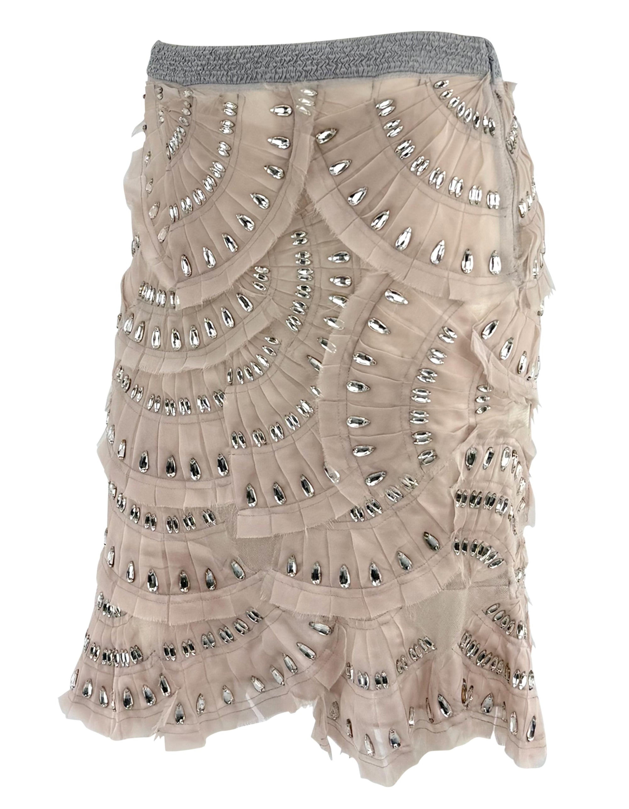 From Gucci’s Spring/Summer 2004 collection by Tom Ford, this pale pink silk skirt features sculptural fan pleating adorned with teardrop rhinestones throughout. Worn as part of look 32 on the runway, modeled by Rianne Ten Haken. This piece exemplifies Ford’s high-shine sensuality.