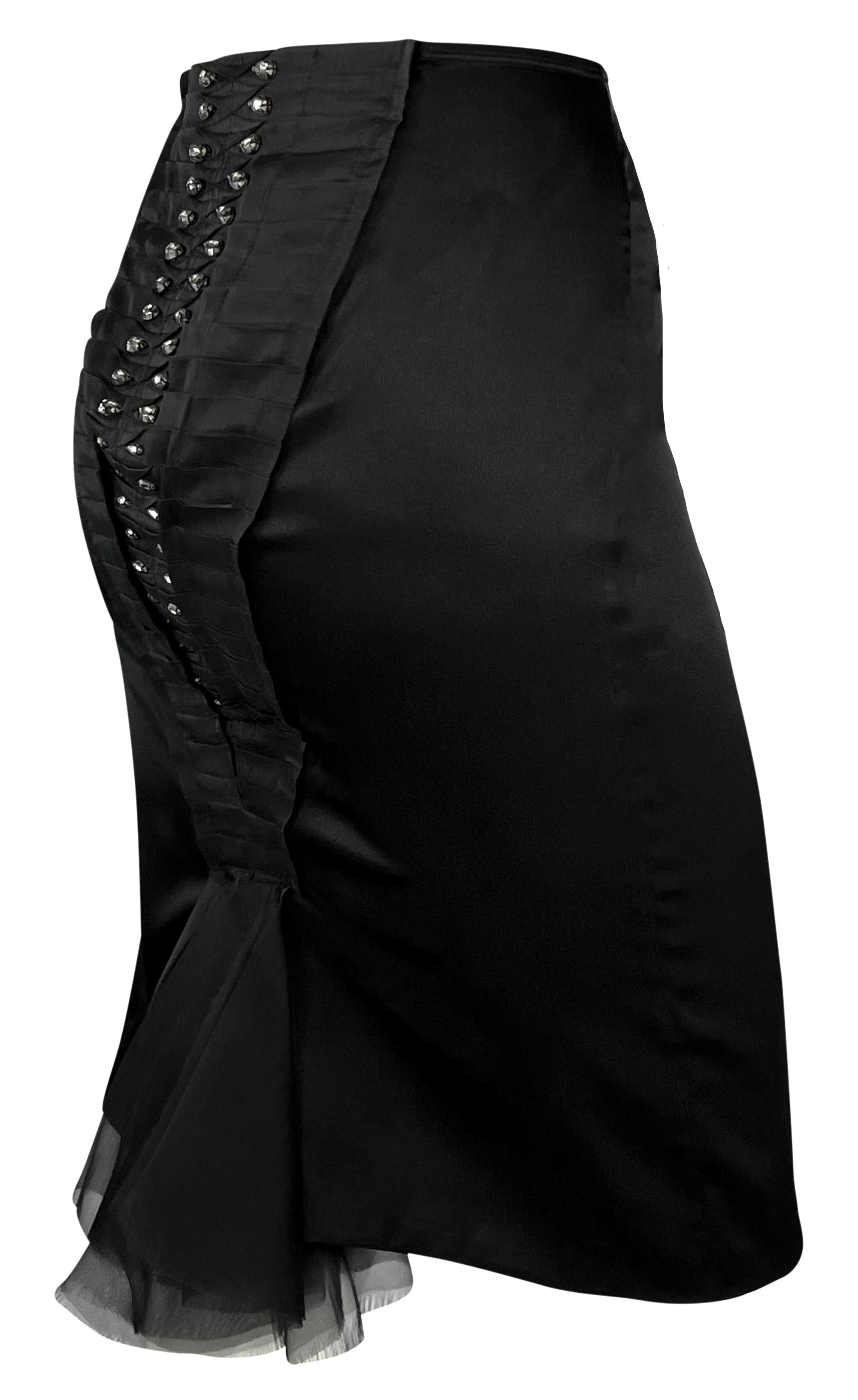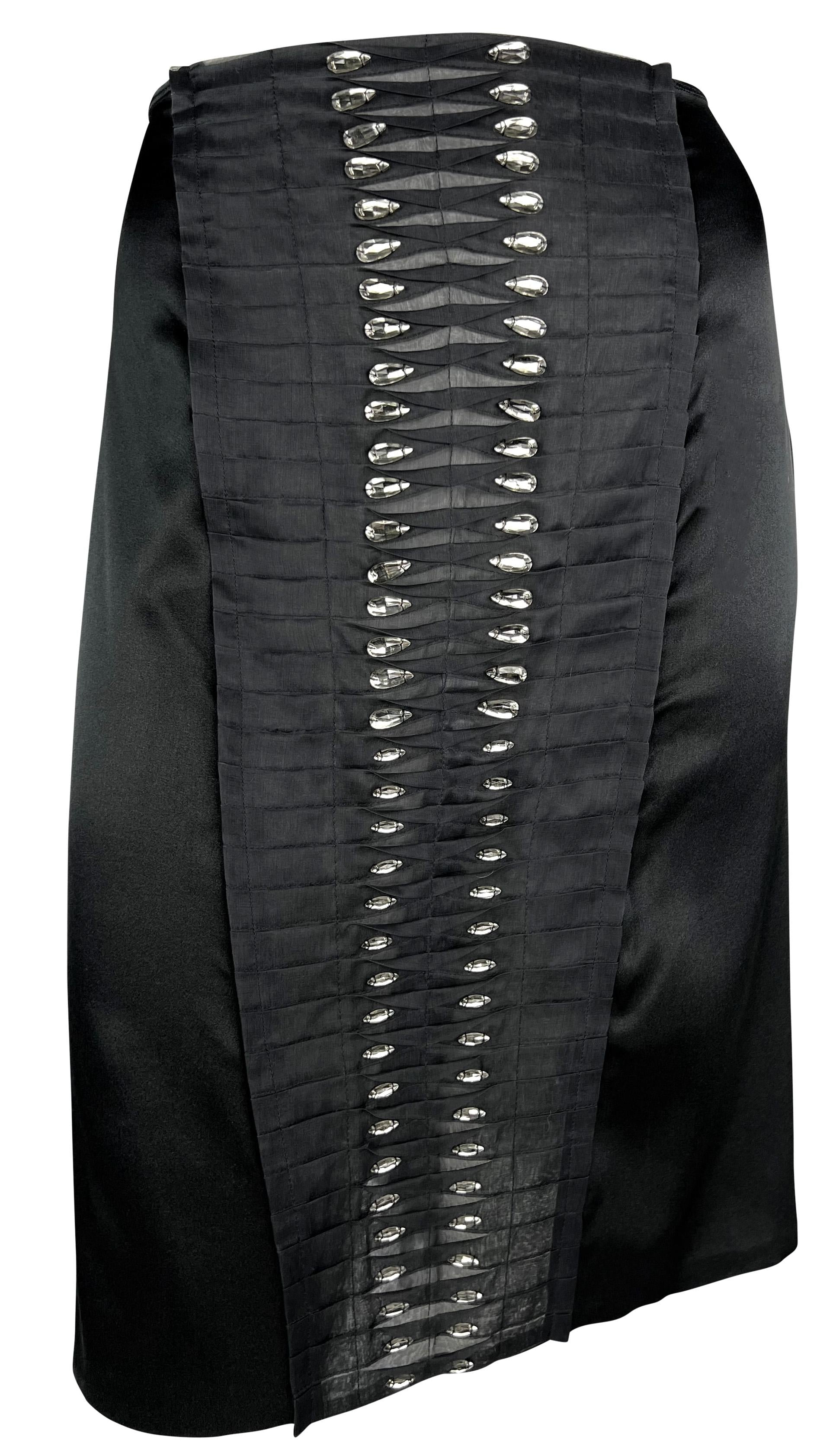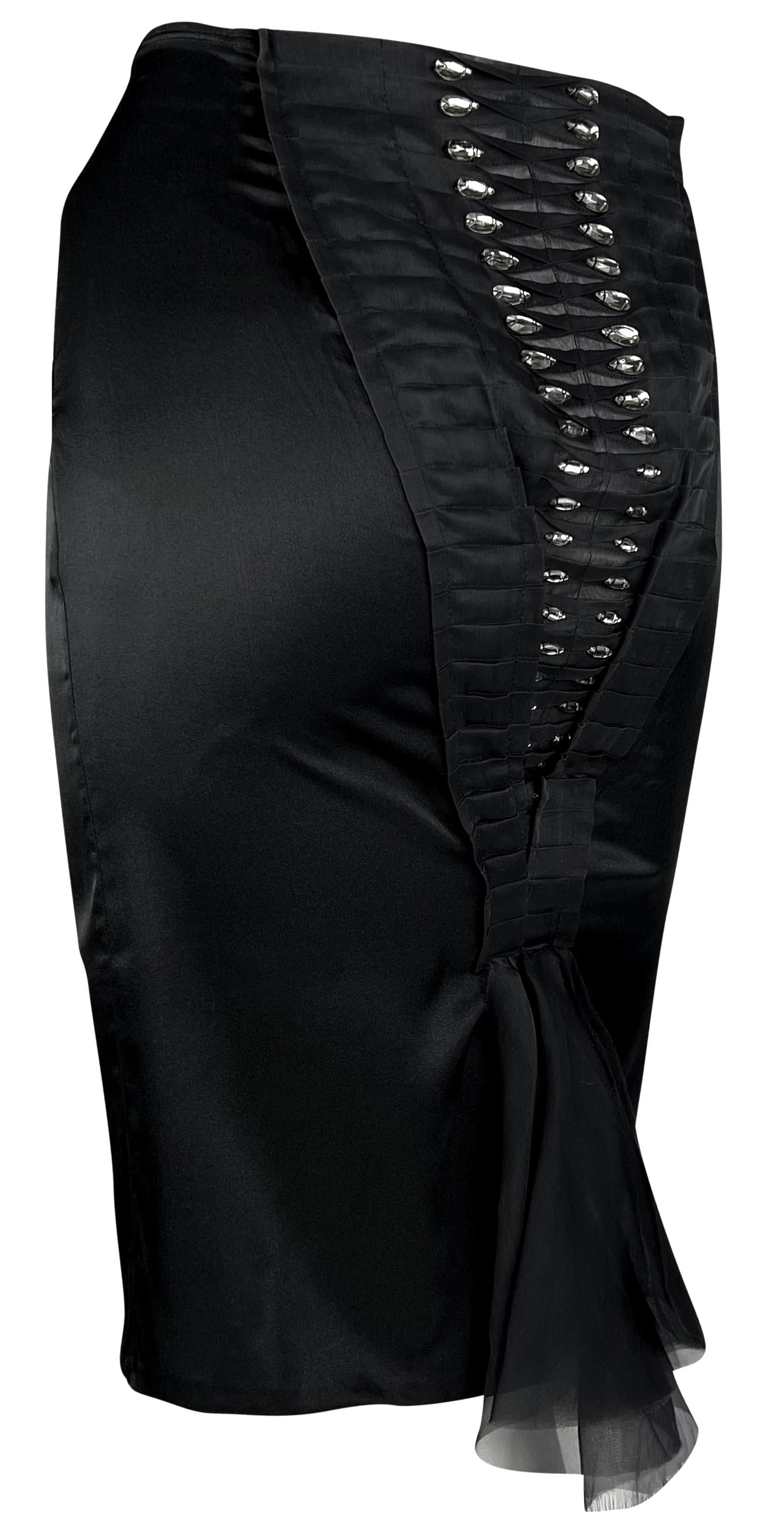 Tom Ford designed this chic black silk Gucci skirt for the Spring/Summer 2004 collection. This stylish skirt debuted on the season's runway as part of look 35, modeled by Mariacarla Boscono. The skirt is constructed of black satin stretch silk blend and features a pleated front and back accent embellished with teardrop-shaped rhinestones.
