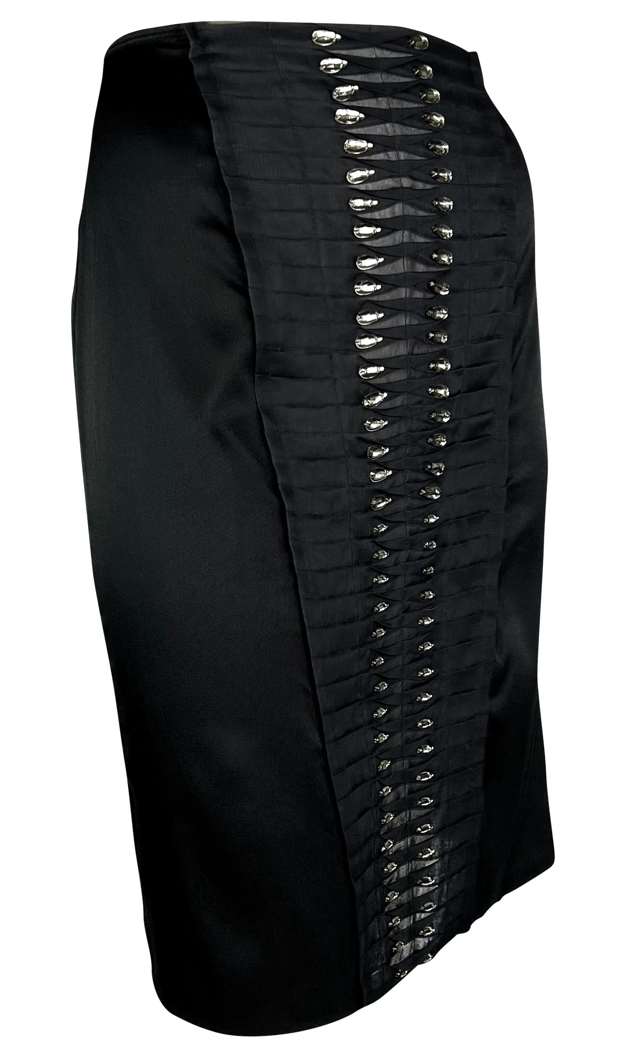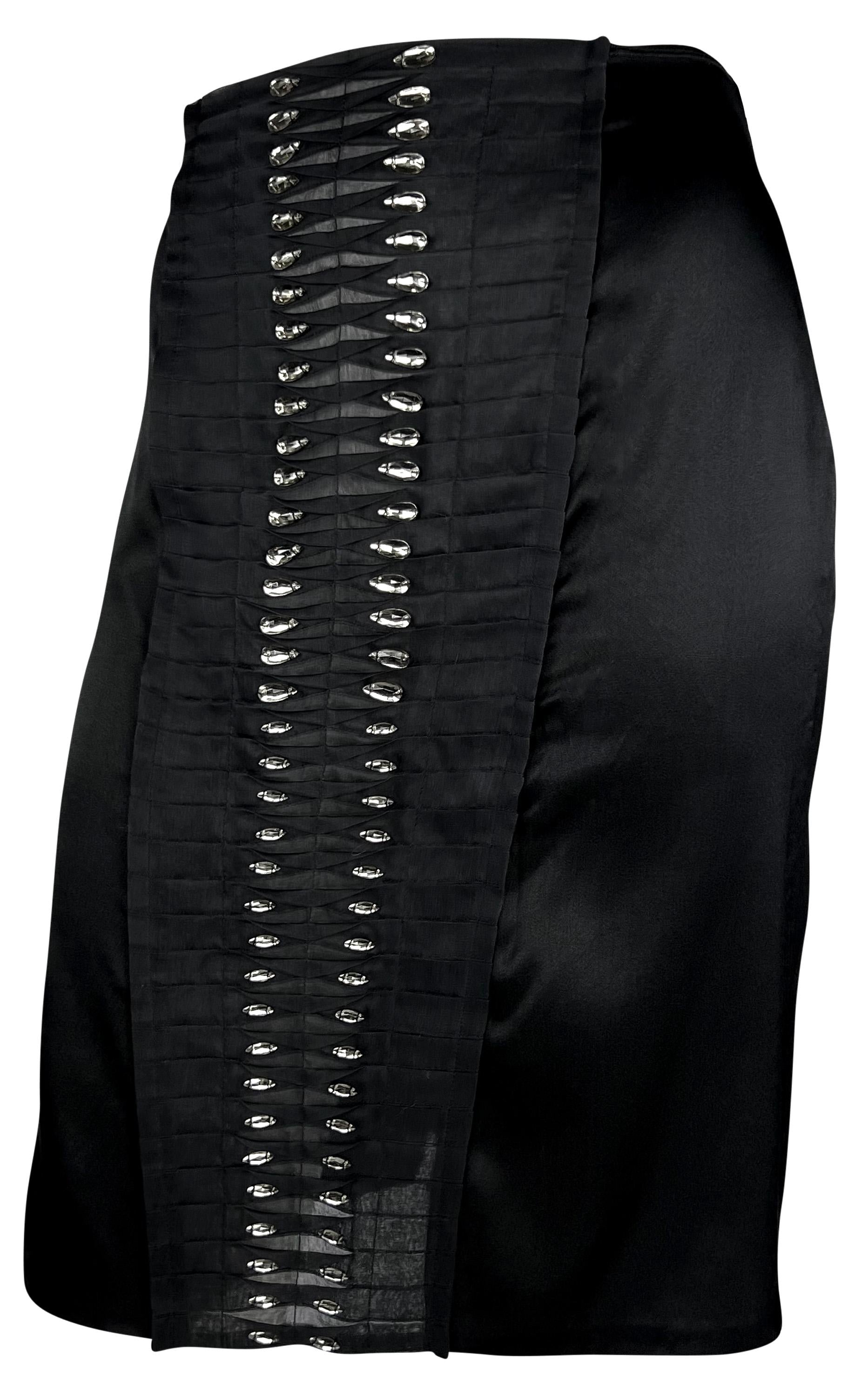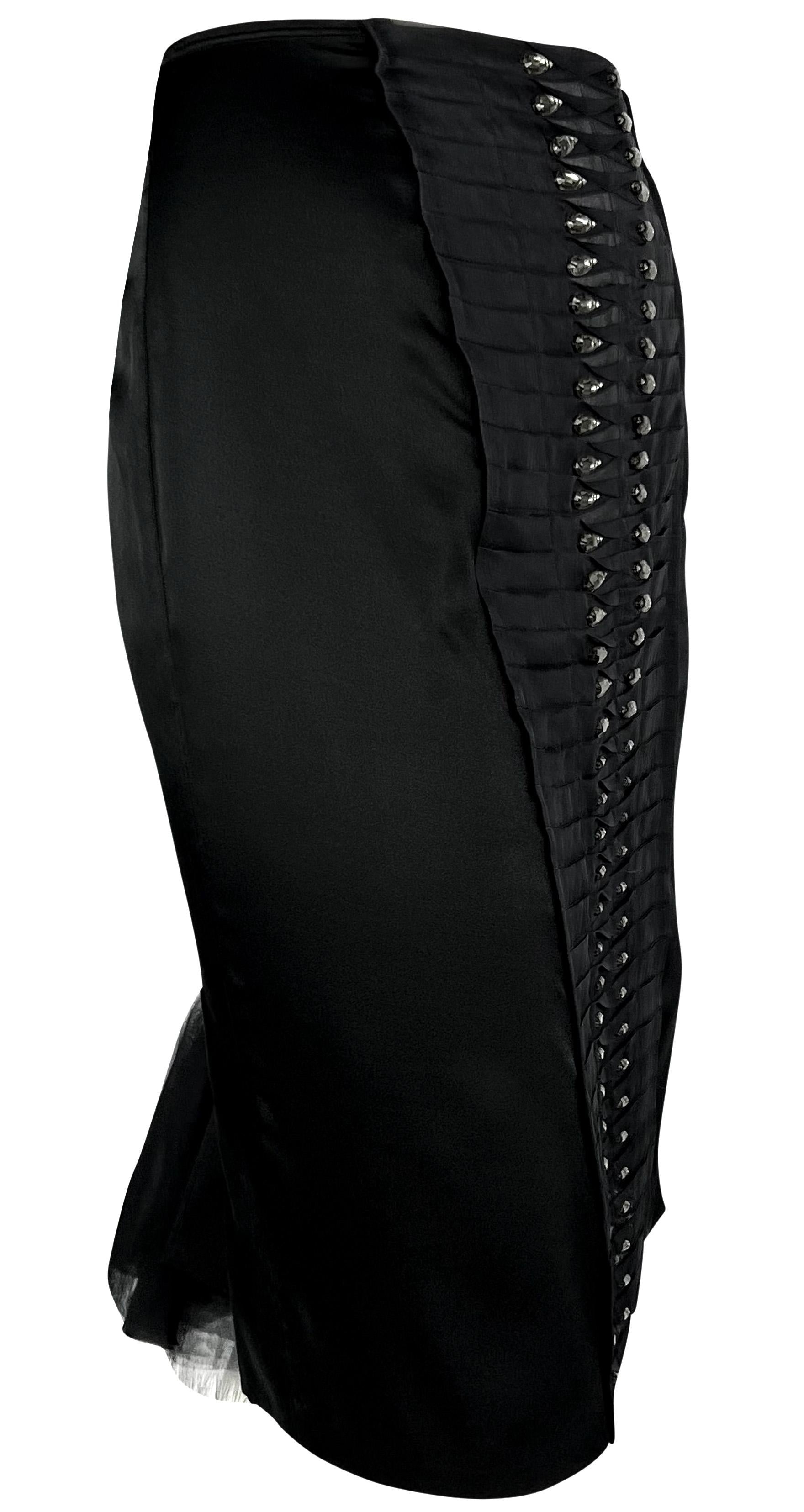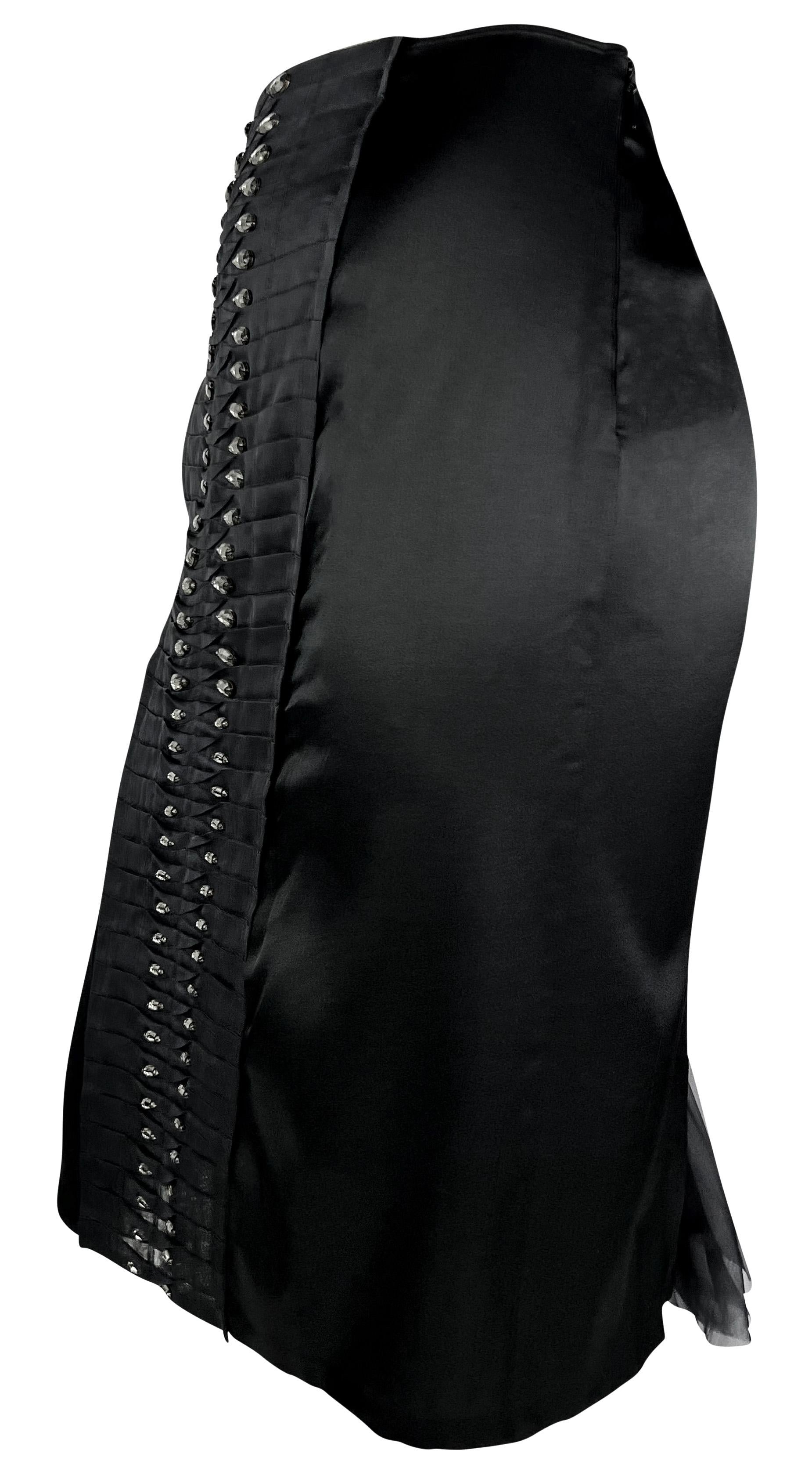 Tom Ford designed this chic black silk Gucci skirt for the Spring/Summer 2004 collection. This stylish skirt debuted on the season's runway as part of look 35, modeled by Mariacarla Boscono. The skirt is constructed of black satin stretch silk blend and features a pleated front and back accent embellished with teardrop-shaped rhinestones.