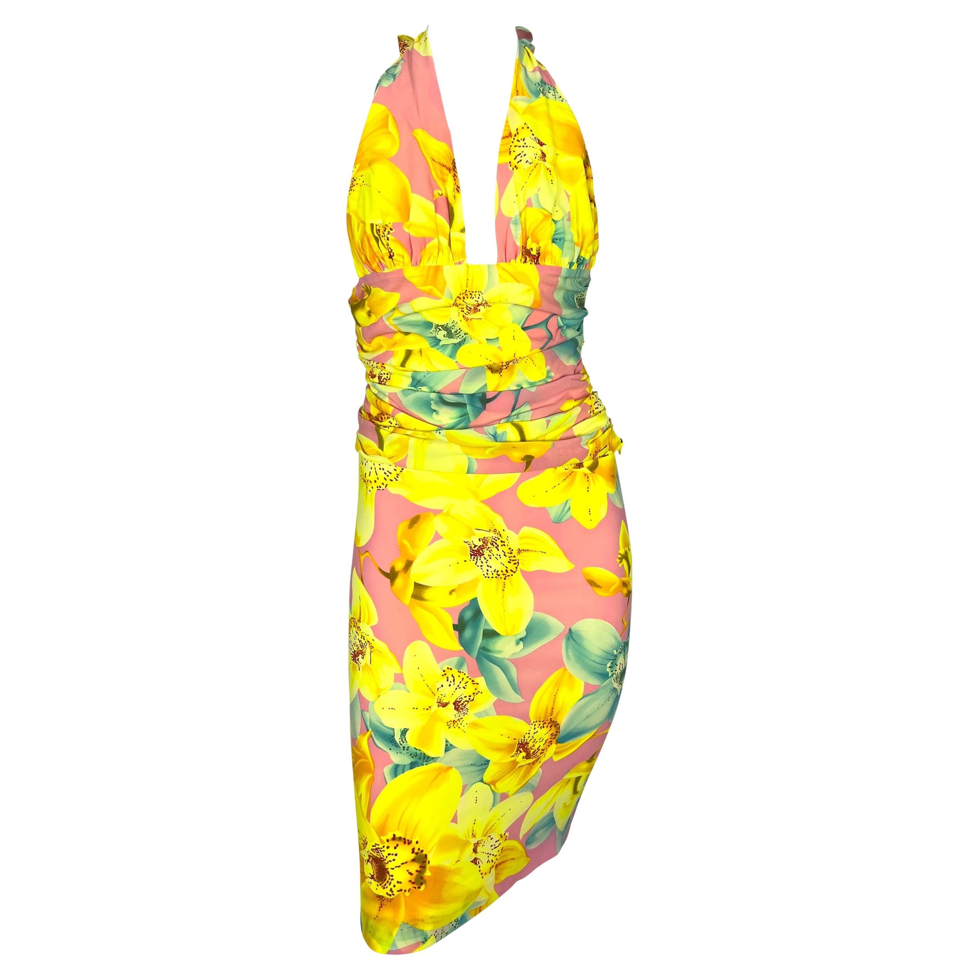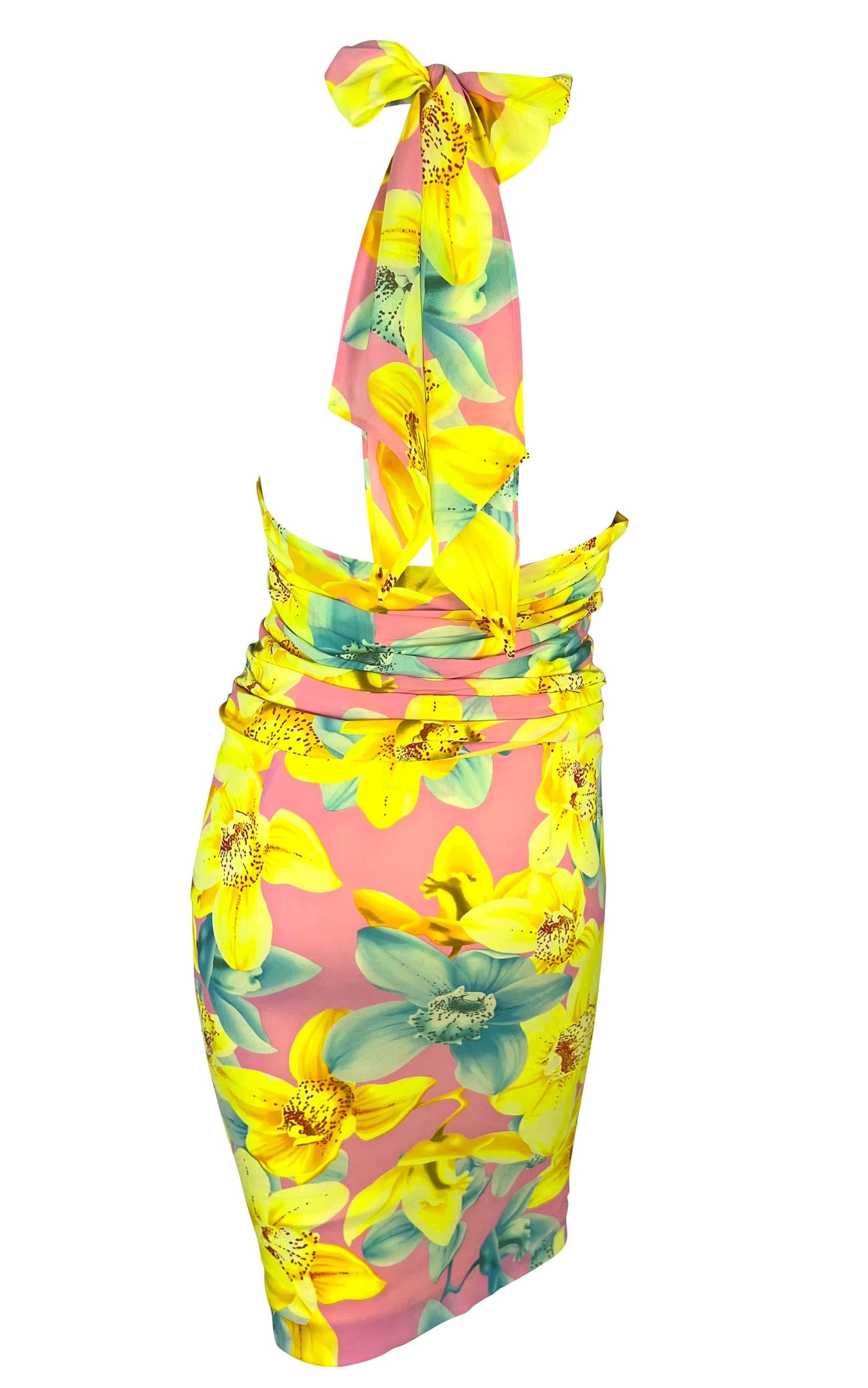 S/S 2004 Versace by Donatella Runway Neon Pink Floral Halter Top Skirt Set
