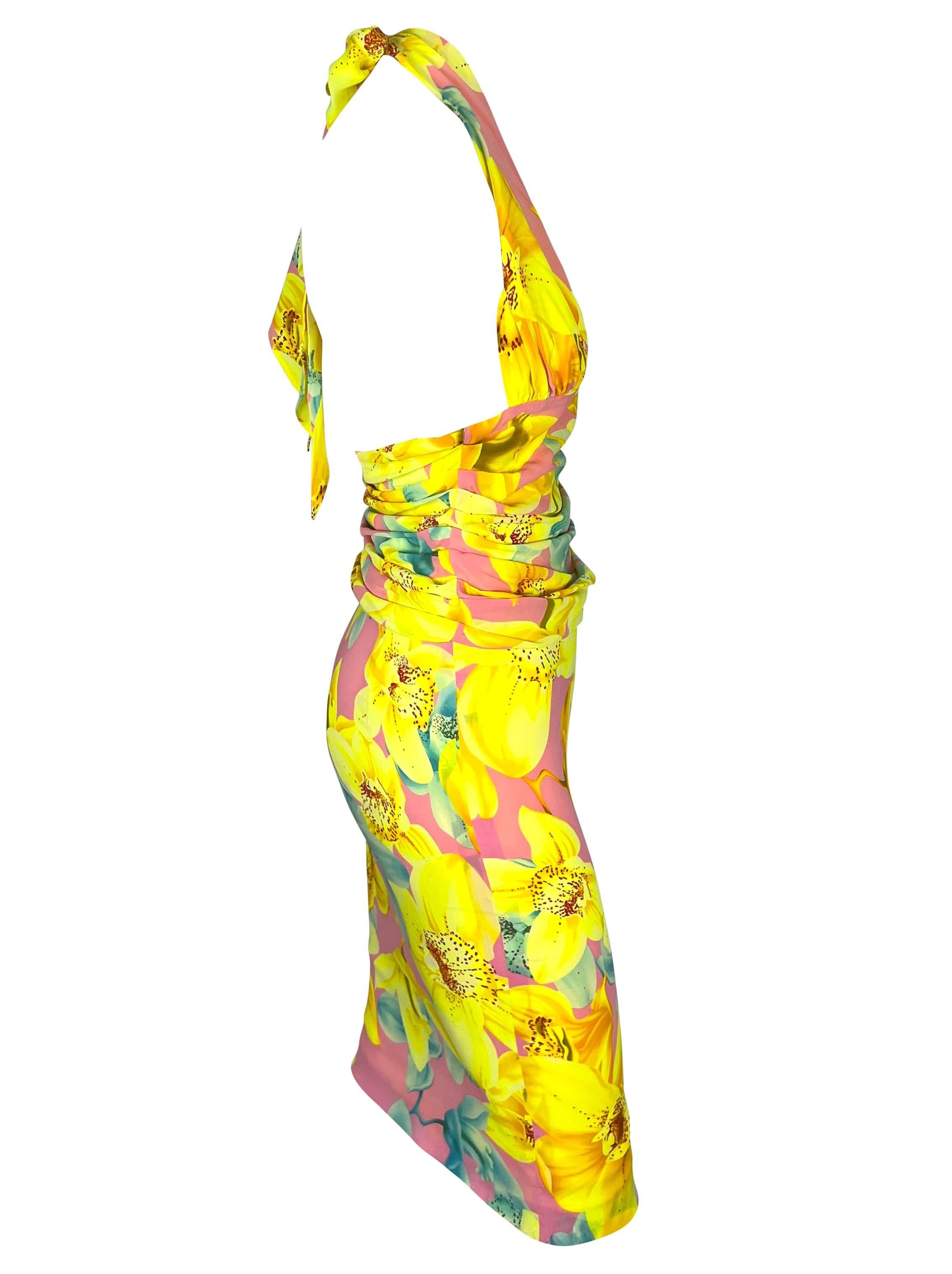 Presenting a bright floral Versace skirt set, designed by Donatella Versace. From the Spring/Summer 2004 collection, this skirt and top set debuted on the season's runway as look 3 modeled by Daria Werbowy. The top from this incredible set features a ruched waist with a square plunging neckline. The top is held up with a tie that covers the bust and connects at the nape. A beautiful Y2K runway set, this vibrant Donatella-designed ensemble is a must-have!