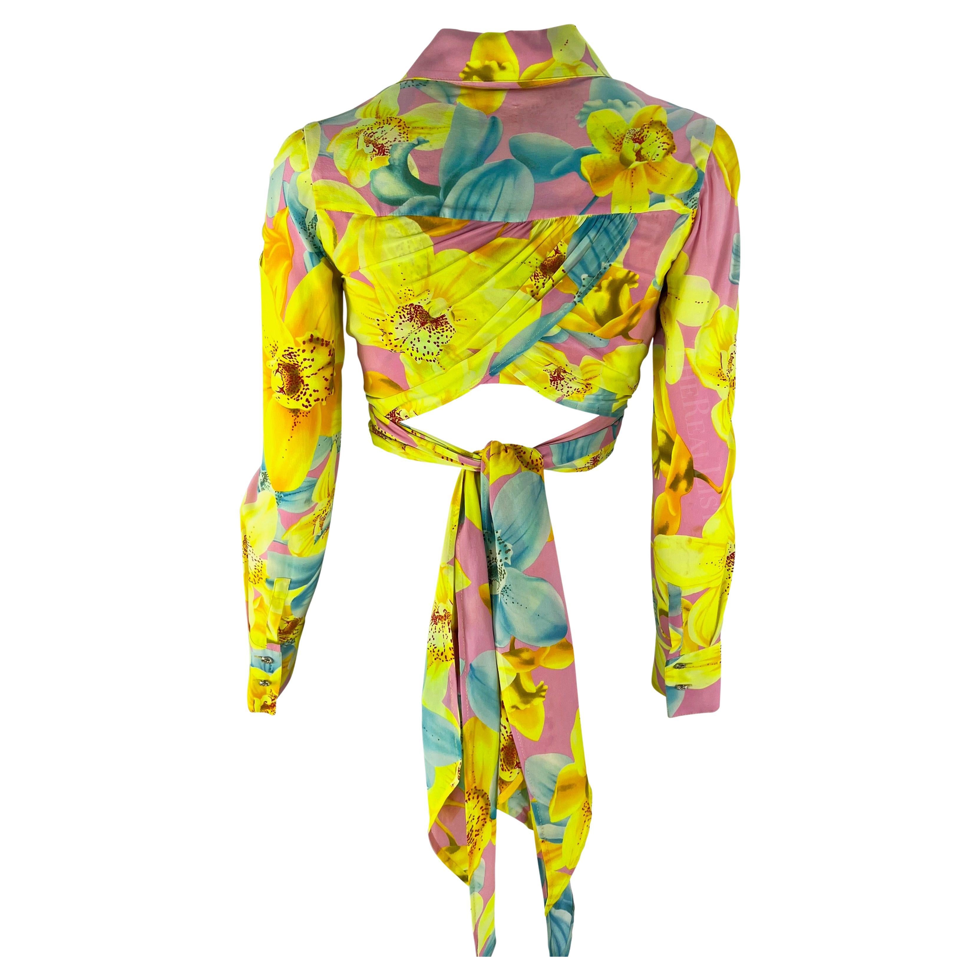 TheRealList presents an incredible floral Versace crop top designed by Donatella Versace. This top debuted from the Spring/Summer 2004 collection as part of Look 4. This long-sleeve collared crop top features button closures at the bust and is complete with chiffon tendrils that wrap around the bust and tie at the back. Perfectly girly and sexy, this sought-after Versace by Donatella runway crop top is the perfect Y2K addition to any modern wardrobe! Follow us on Instagram! @_the_reallist_