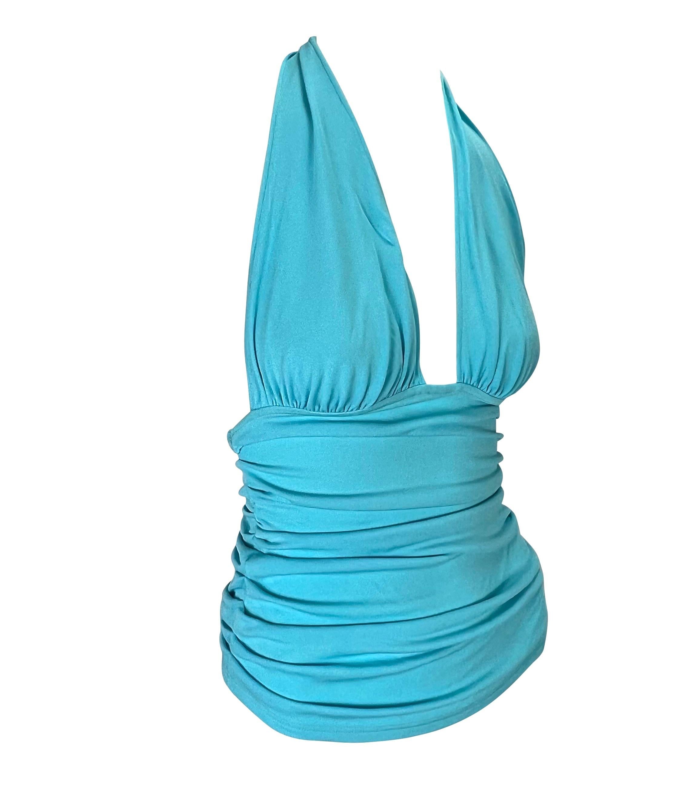 S/S 2004 Versace by Donatella Teal Blue Ruched Halter Neck Stretch Crop Top