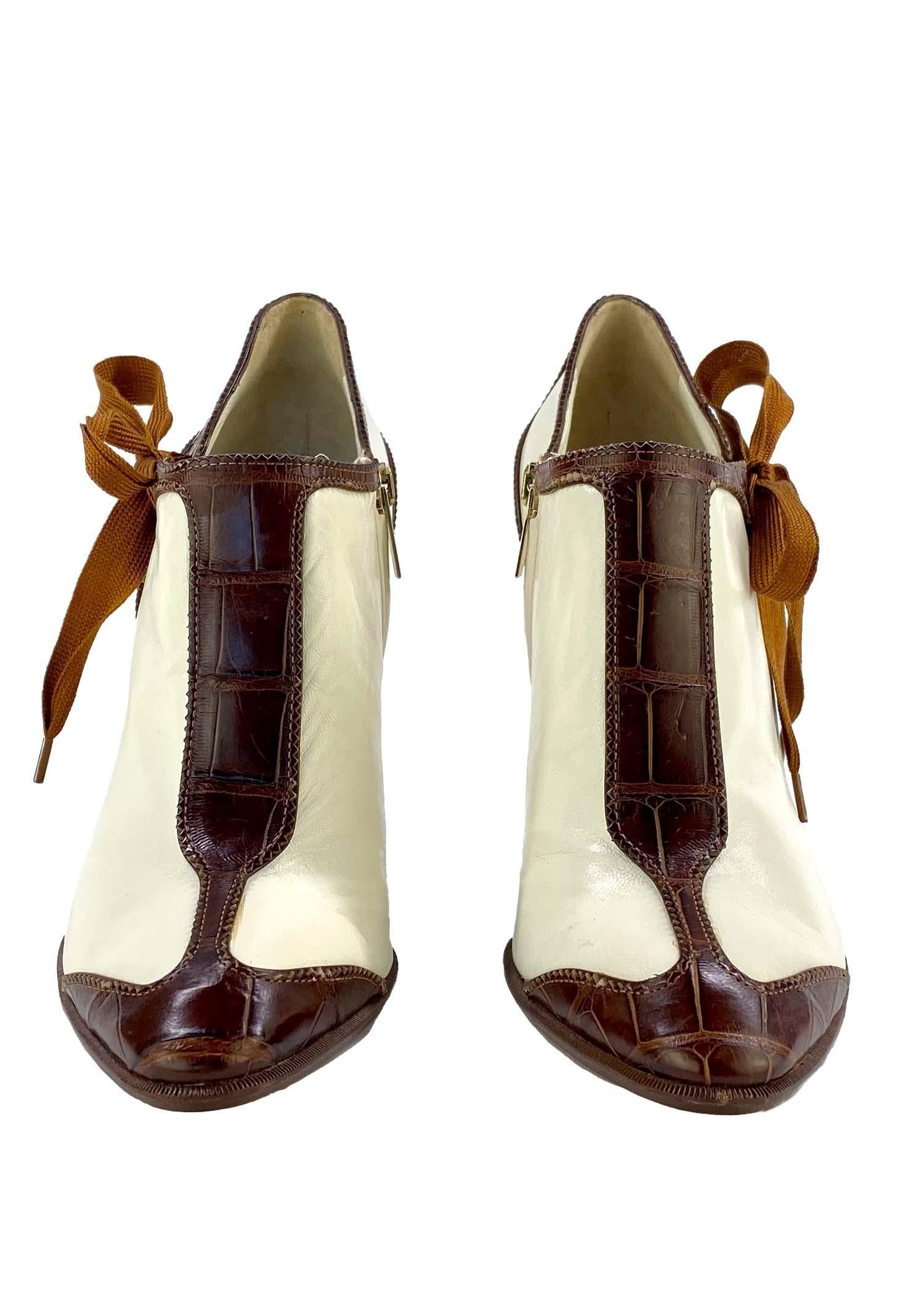 Presenting an iconic pair of Yves Saint Laurent Rive Gauche crocodile skin-lined bootie heels designed by Tom Ford. These stunning shoes first debuted on the Spring/Summer 2004 runway in look 1, modeled by Hana Soukupova, but were also present on many other runway looks. The boots are light leather and lined with saddle-brown crocodile skin. This pair of booties is complete with a lace-up on the outer side of the shoes.