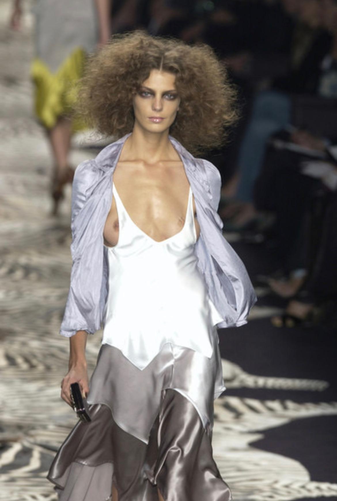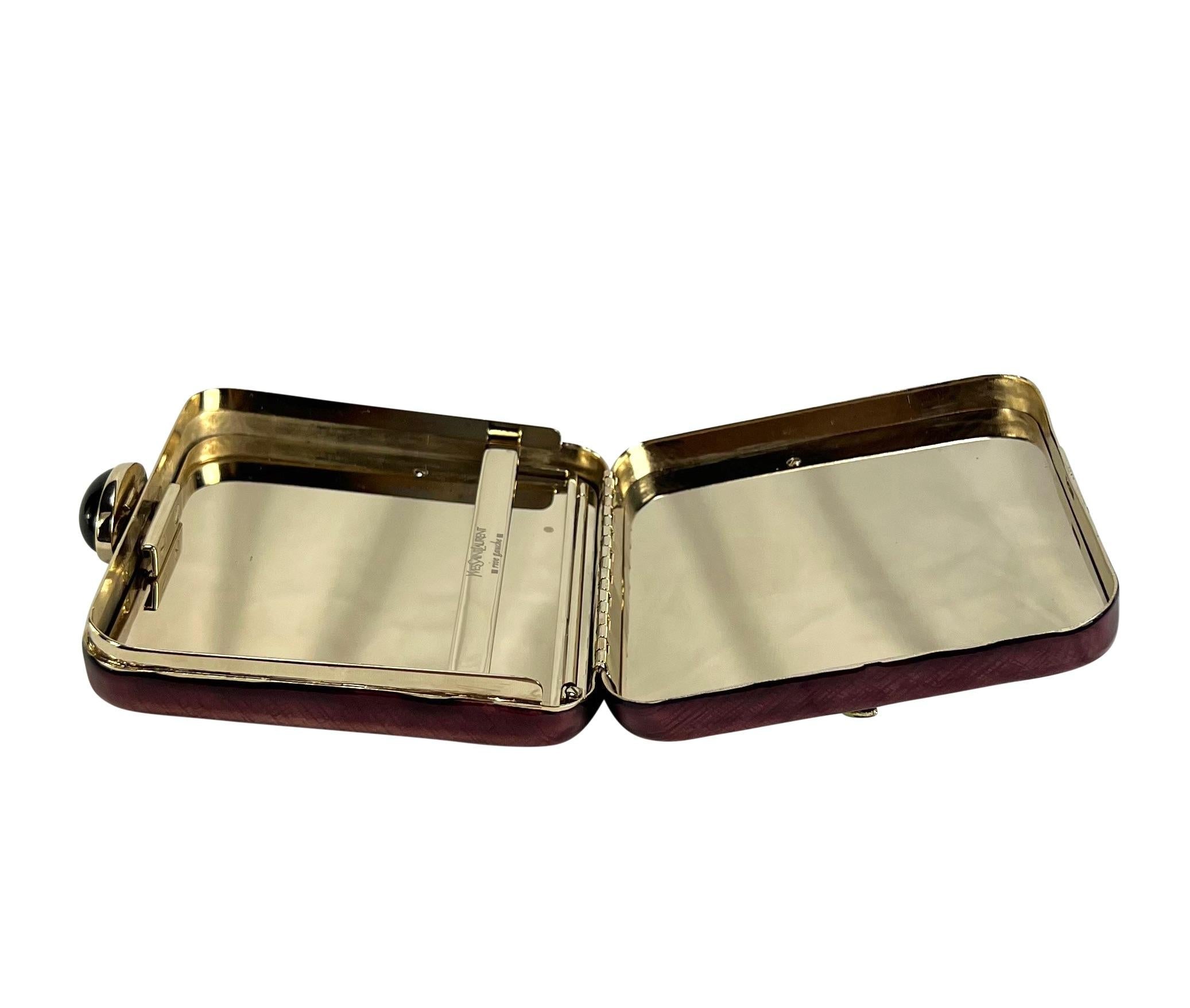 Presenting a fabulous gold-tone metal purple enamel-covered Yves Saint Laurent Rive Gauche clutch, designed by Tom Ford. From the Spring/Summer 2004 collection, this bag debuted on the season's runway as part of Look 22, modeled by Daria Werbowy, with a similar larger version of the bag worn with Look 24. The bag features a large rhinestone, gem, and enamel flower design at the front. The interior is a gold-tone mirrored metal with a small arm to secure cigarettes. Add this incredible runway YSL by Tom Ford clutch to your collection!