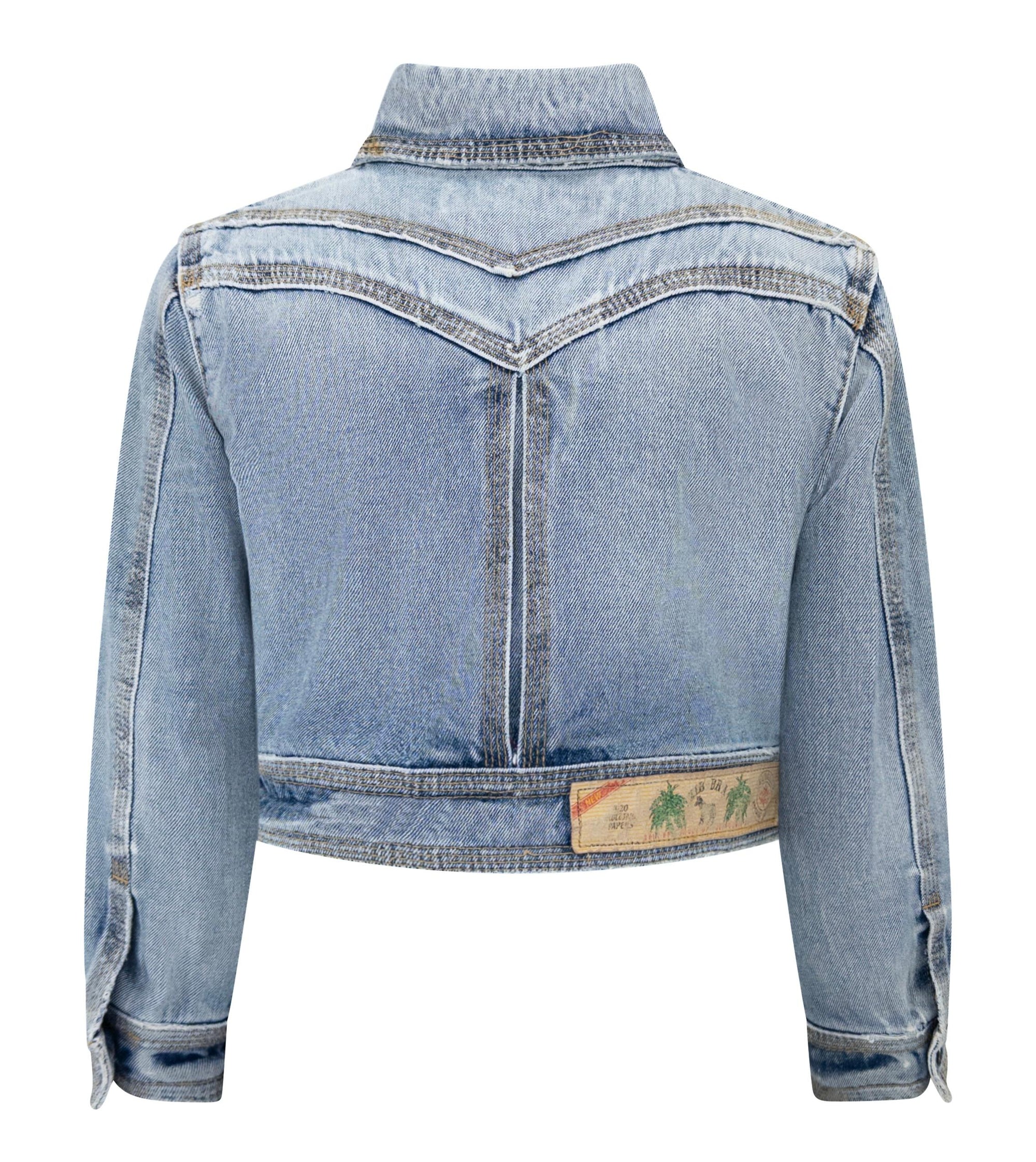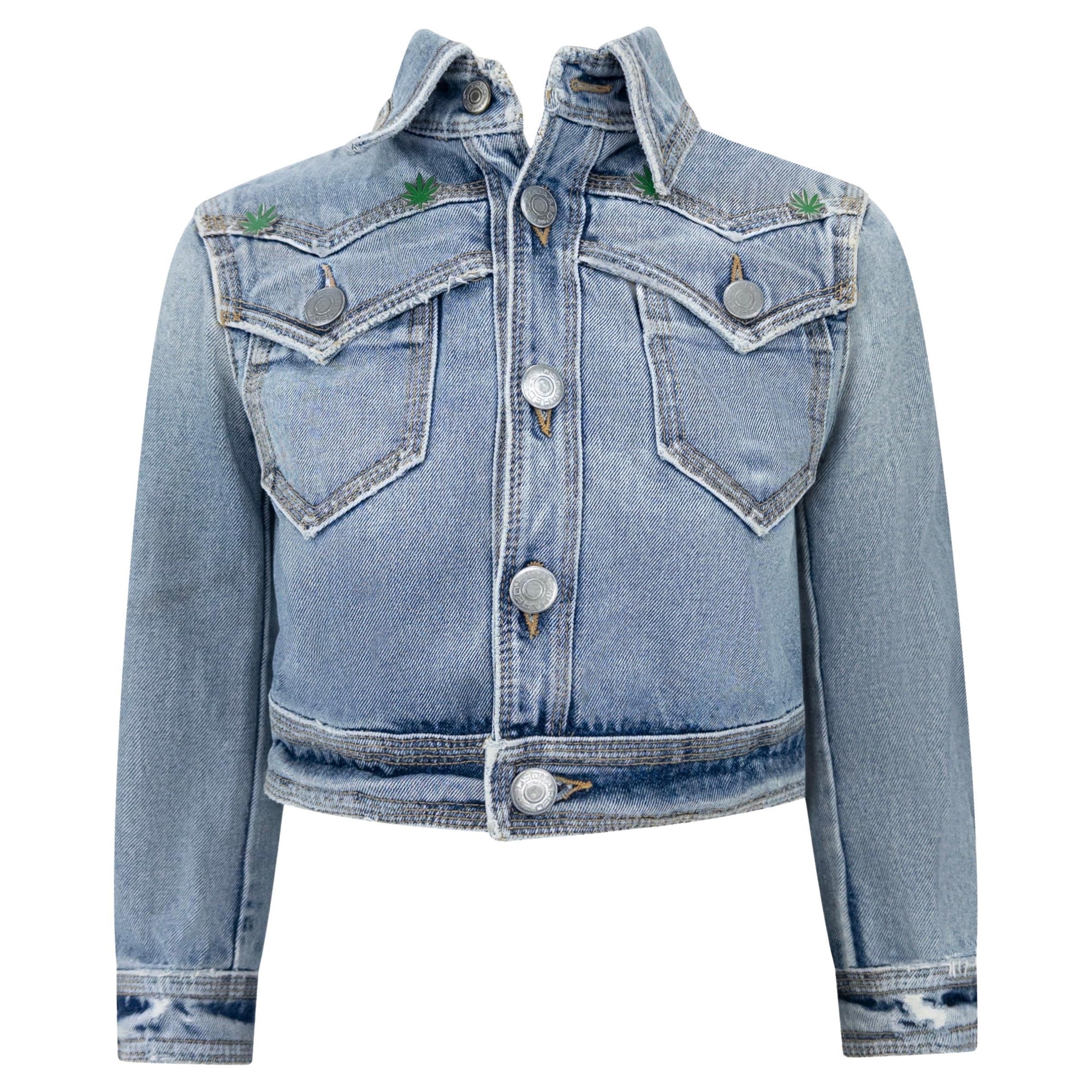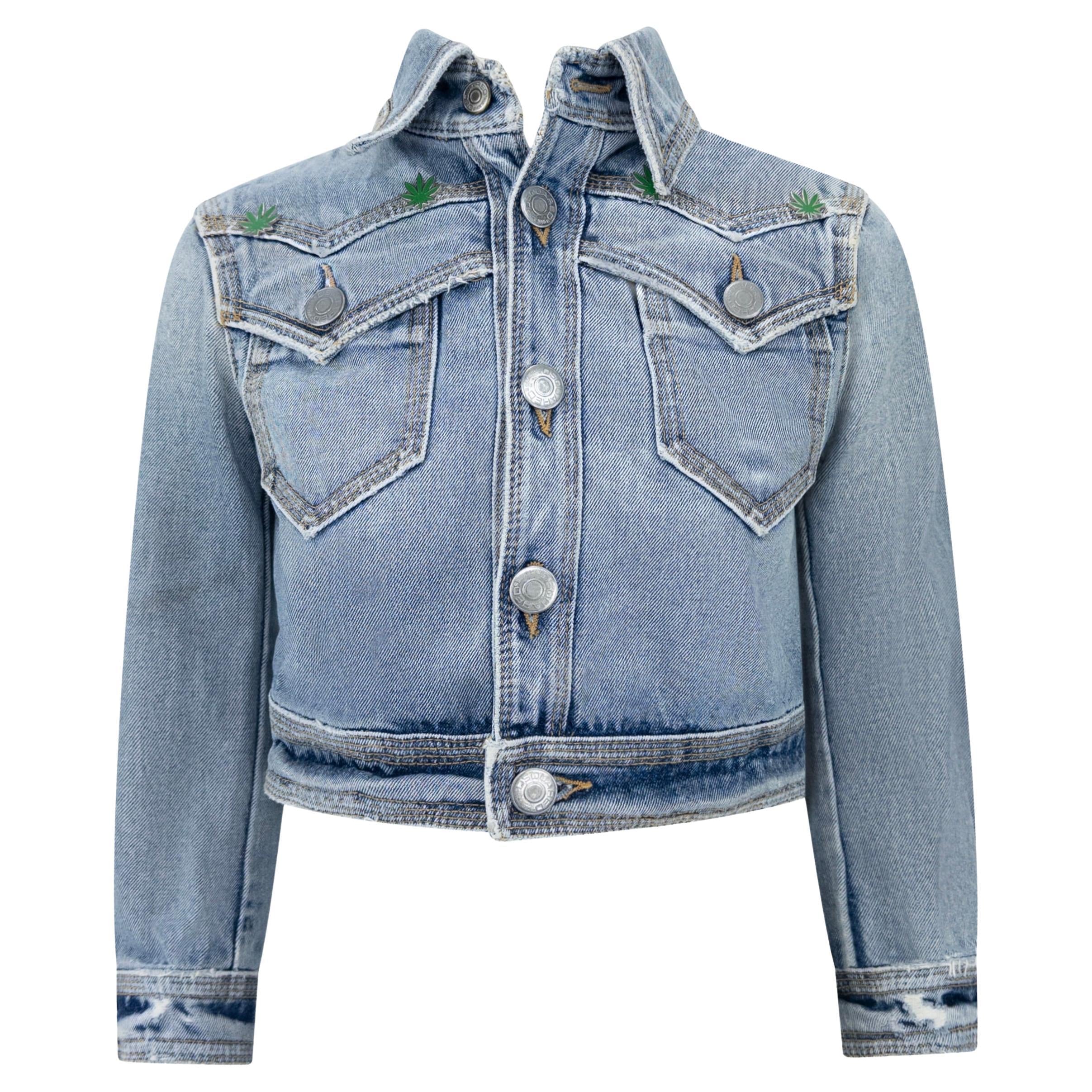 From Dsquared2’s Spring/Summer 2005 collection, this light-wash distressed denim jacket features a cropped silhouette and flap chest pockets. Green enamel marijuana leaf accents at the shoulders add a playful, rebellious touch, while the back is finished with a branded 'rolling paper' patch.