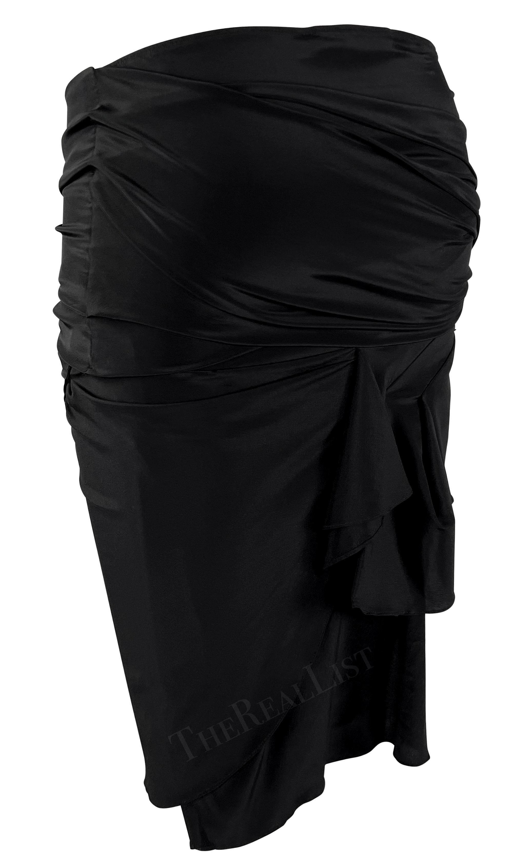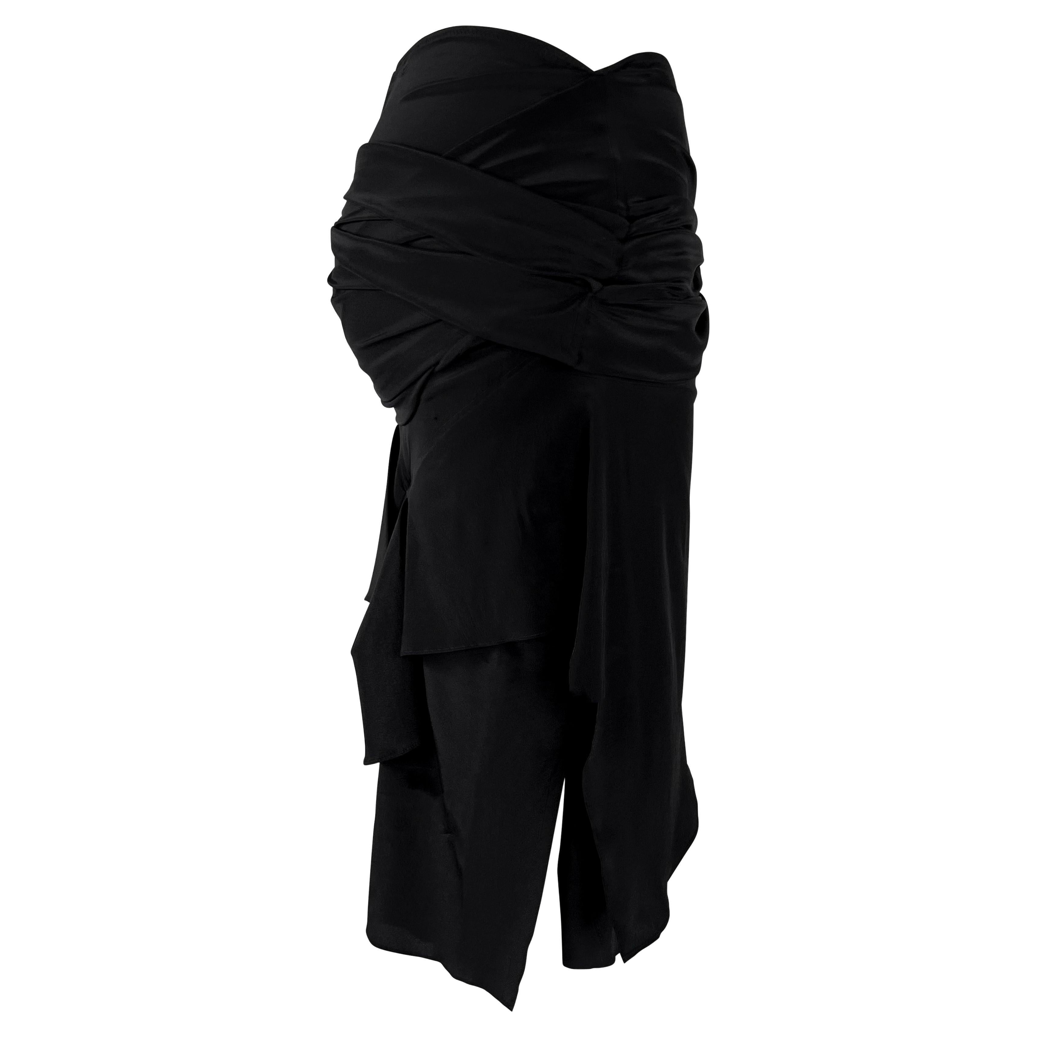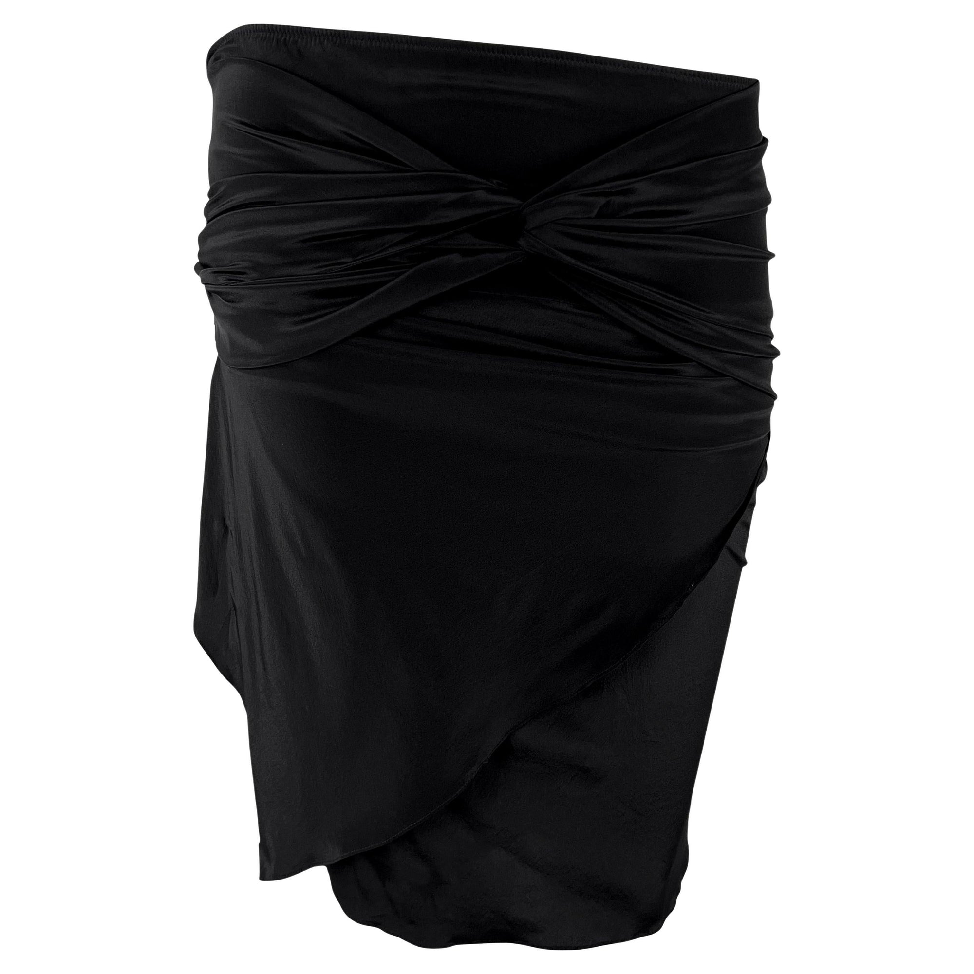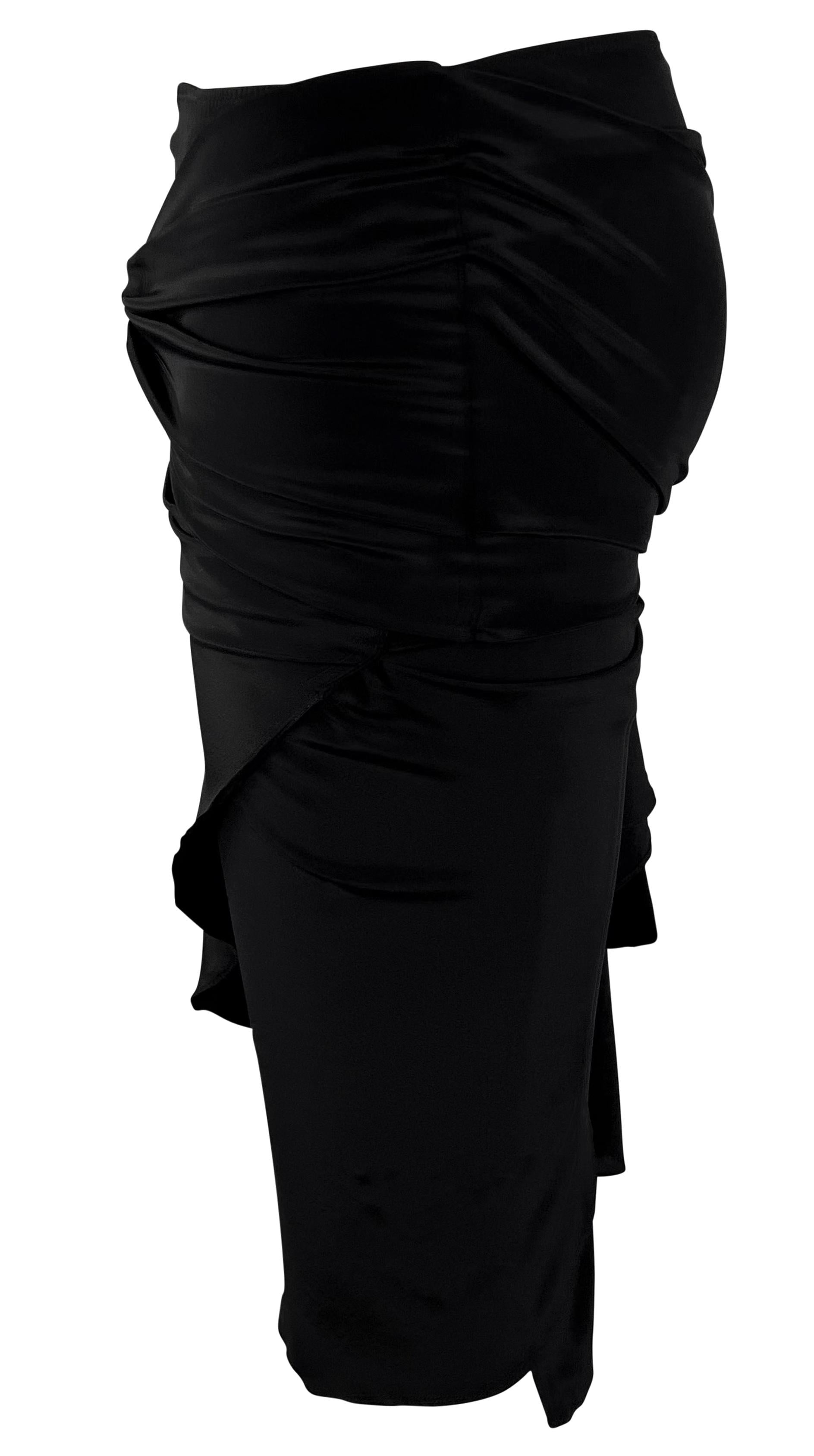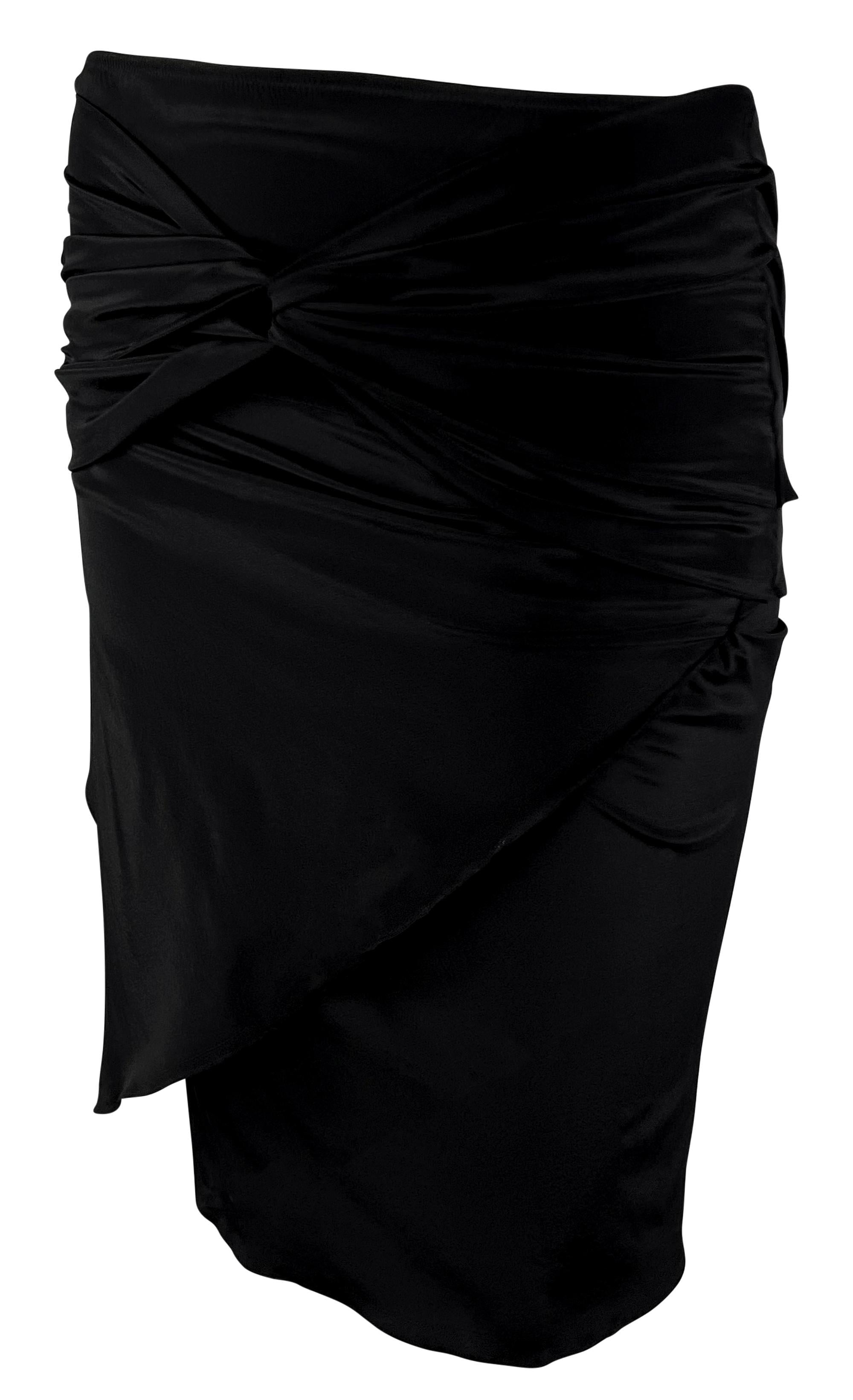 From Gucci’s Spring/Summer 2005 collection, this black stretch skirt is crafted with a sculptural bandage-style wrap construction. Designed to hug the body, it features asymmetric ruching and draped detail with a twisted knot at the front.