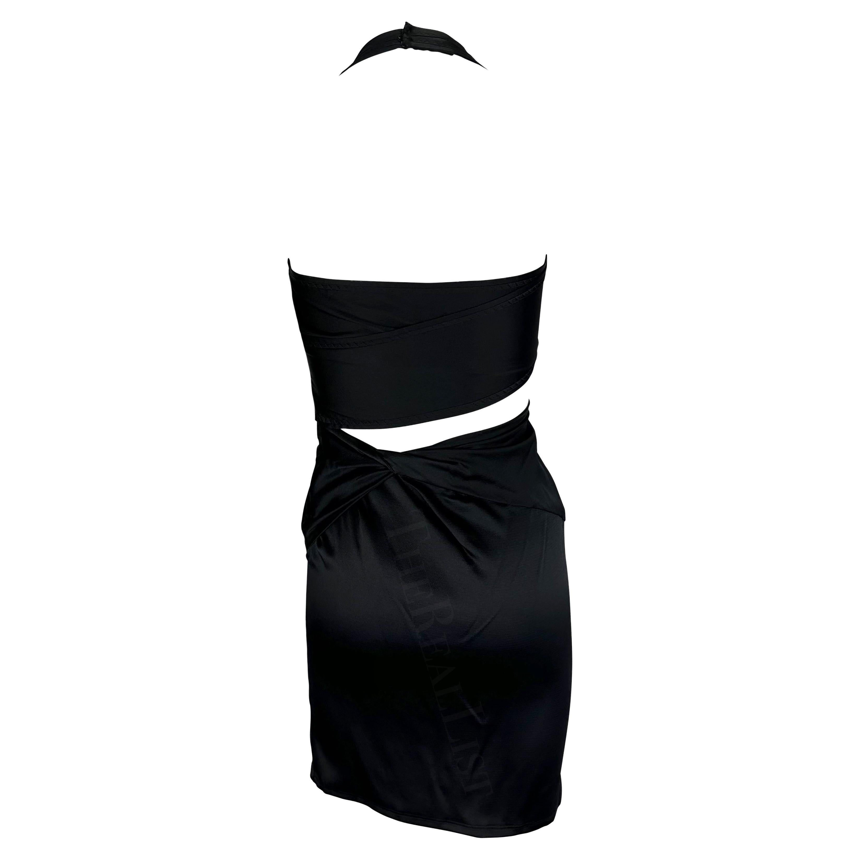 Presenting a black satin Gucci halterneck mini dress designed by Alessandra Facchinetti. From the Spring/Summer 2005 collection, this dress features gathering at the front, cutouts at the back, and a concealed zipper at the side.