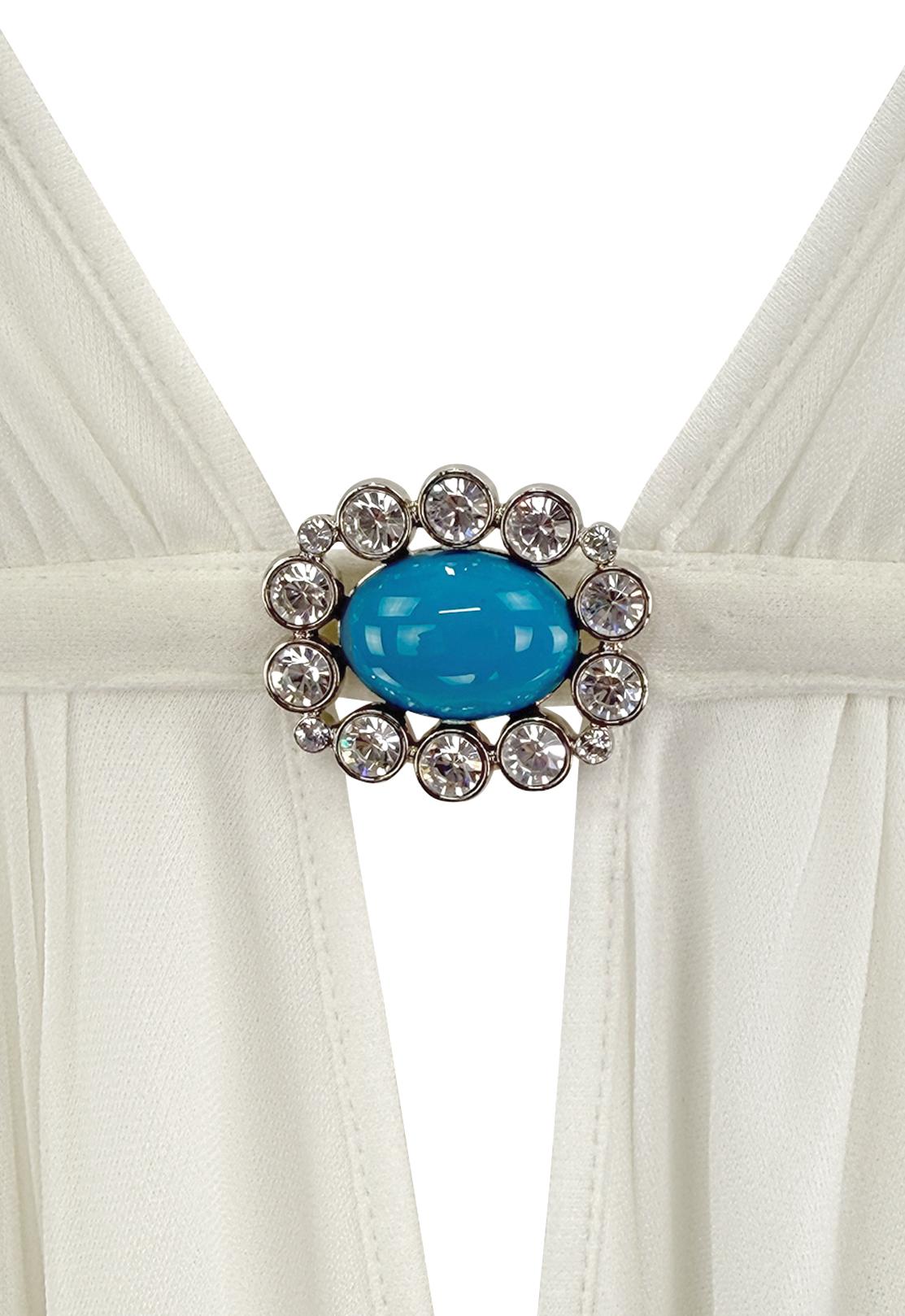From Michael Kors’ Spring/Summer 2005 collection, this white halter mini dress features a plunging neckline gathered at the bust with a turquoise brooch detail. The flared skirt and open back with crisscross ties evoke a breezy glamour.