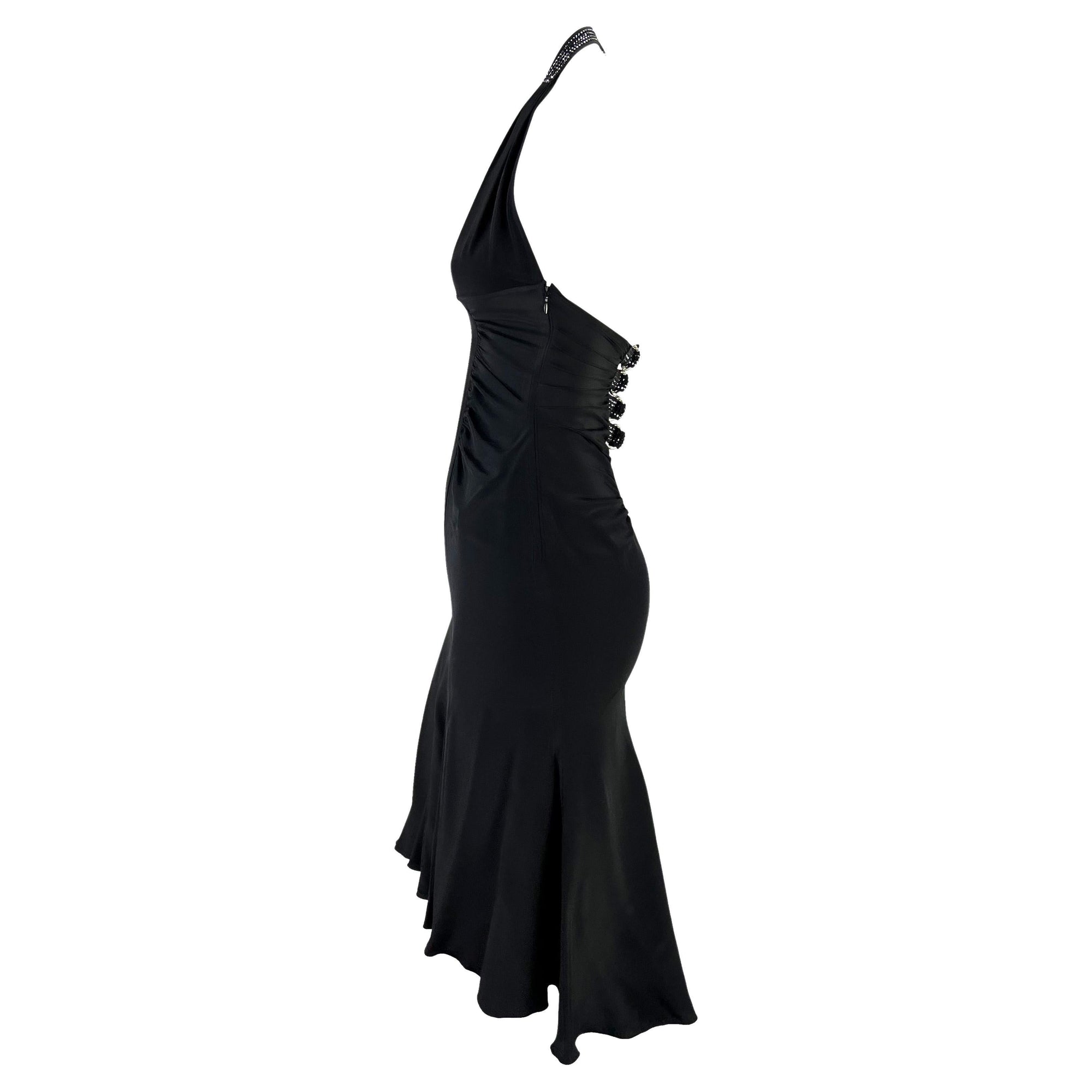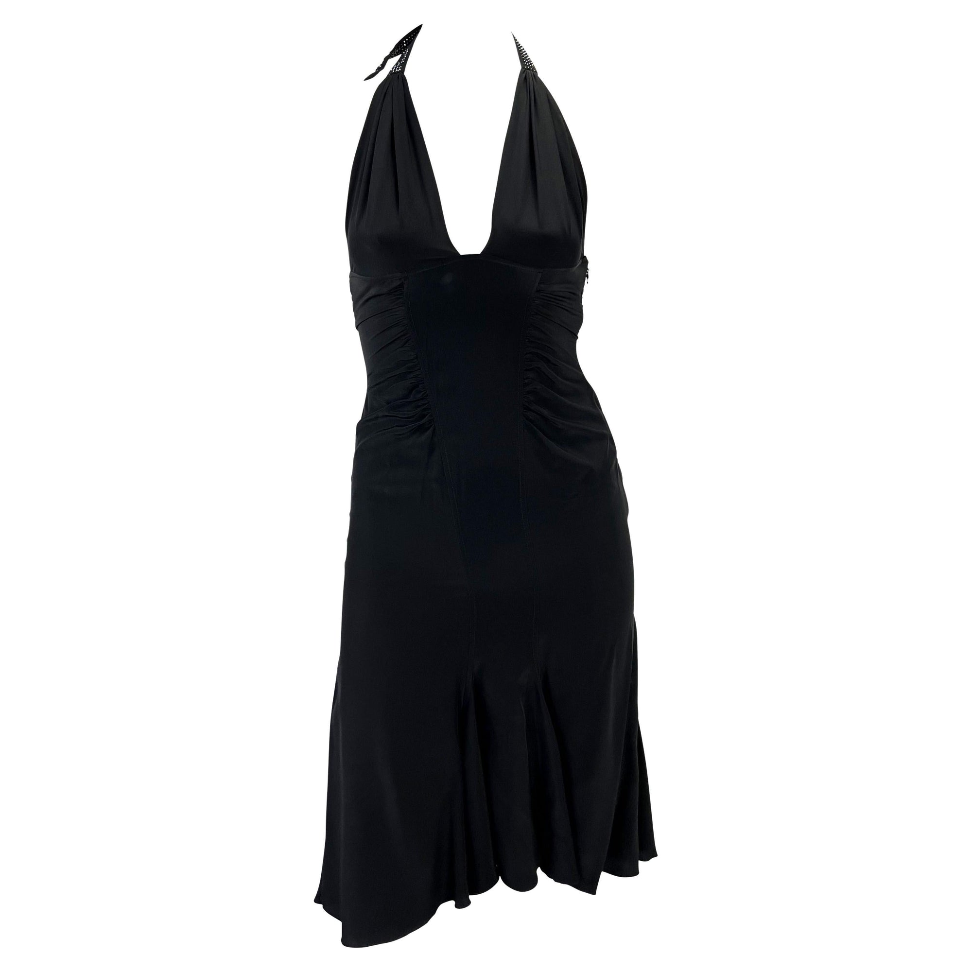 S/S 2005 Versace by Donatella Backless Rhinestone Strap Ruched Silk Black Dress