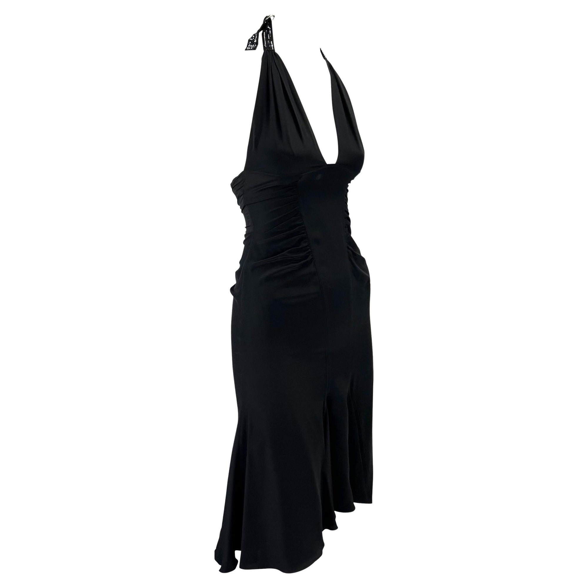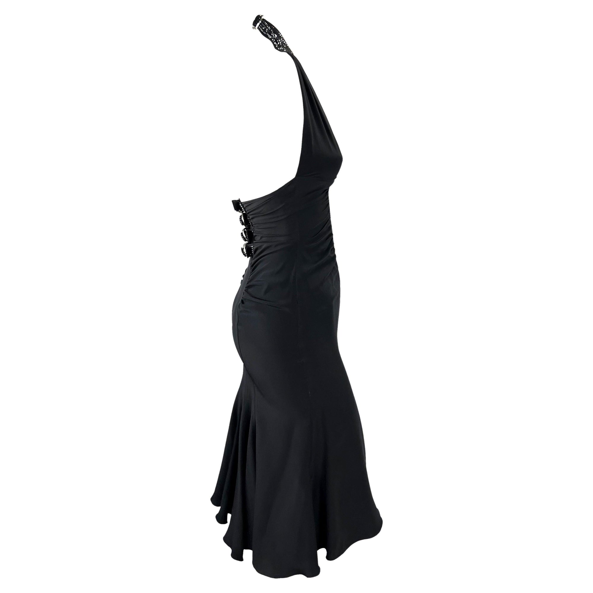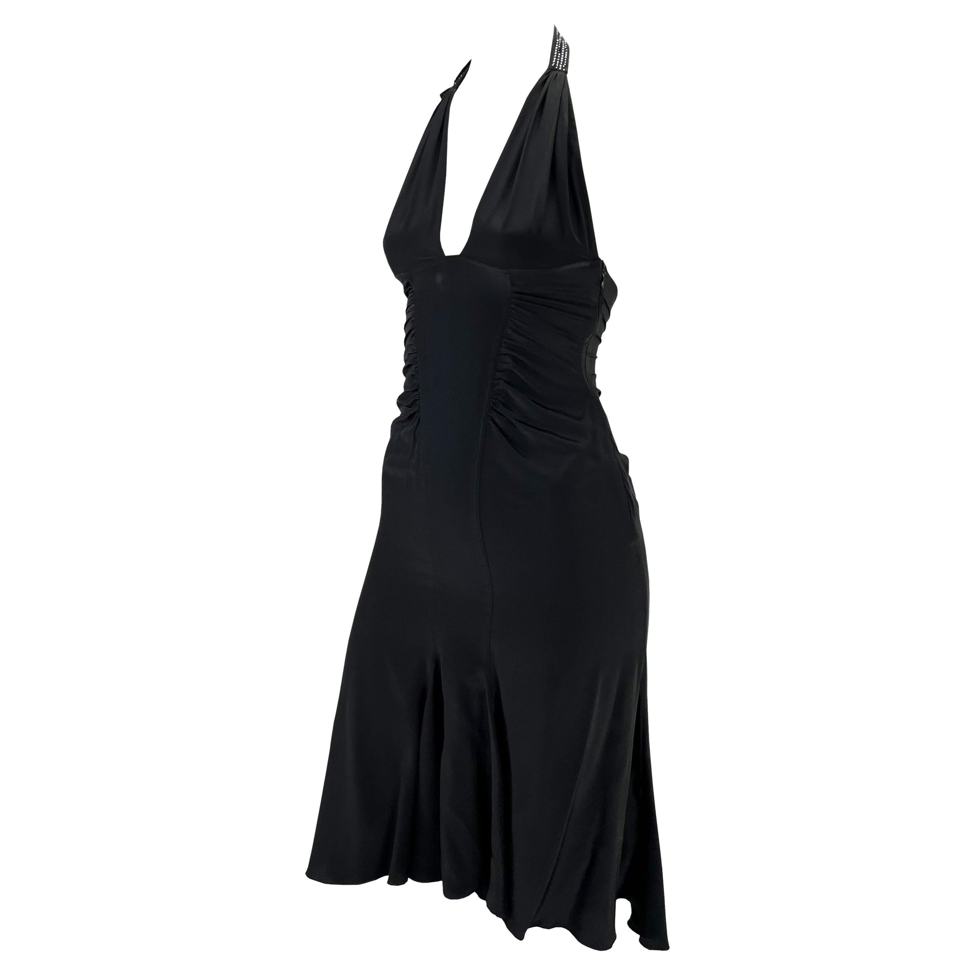 Presenting a black Versace halterneck buckle dress designed by Donatella Versace. From the Spring/Summer 2005 collection, this beautiful dress features ruching at the waist, a handkerchief-style skirt, and a semi-exposed back. This dress is complete with a ring buckle and black rhinestone straps in the back and nape. This stunning authentic Y2K piece adds the perfect amount of sex appeal and glitz to this Versace little black dress.