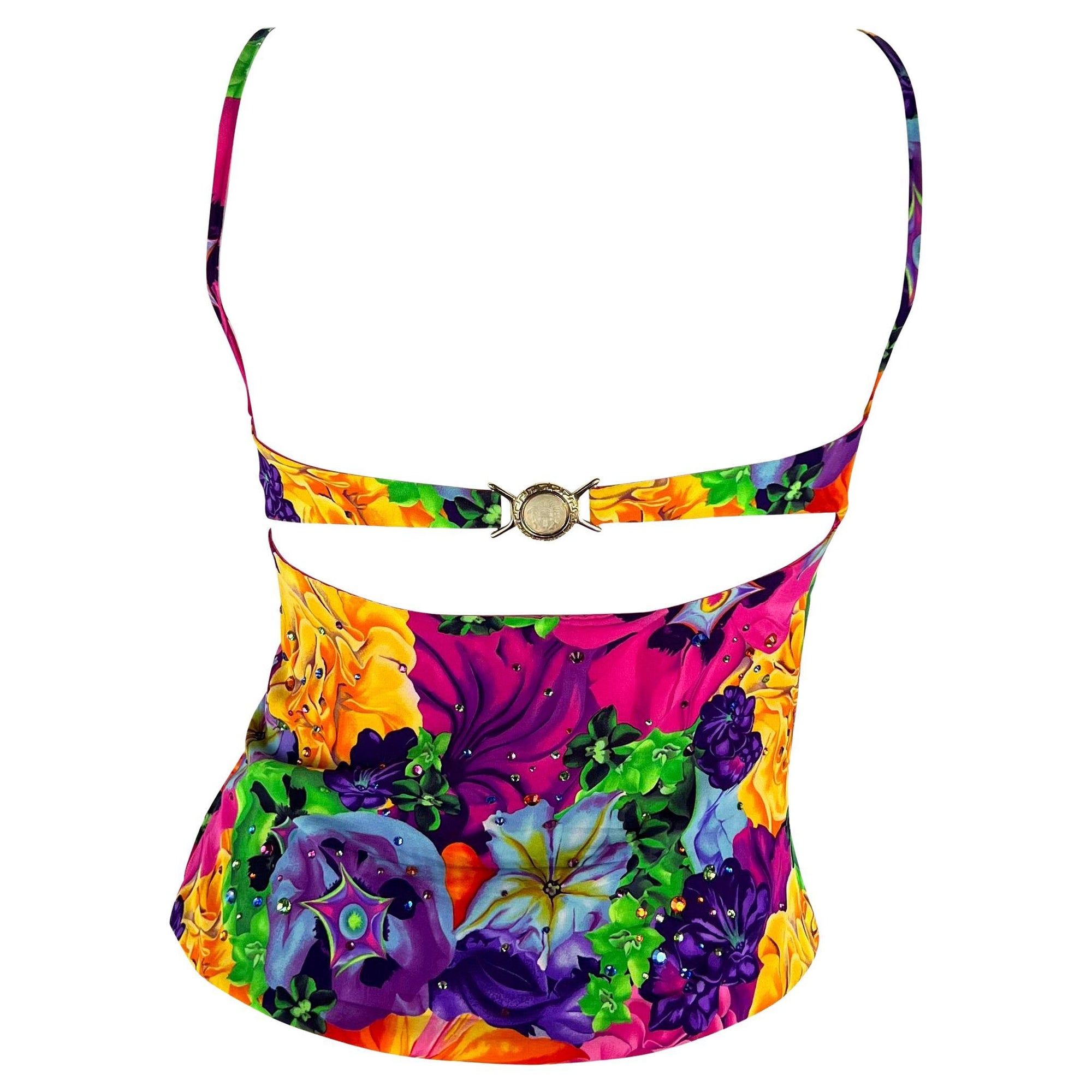 Presenting a bright floral Versace tank top designed by Donatella Versace. From the Spring/Summer 2005 collection, this vibrant top is covered in a floral print with rhinestones throughout. The top features spaghetti straps, a semi-sweetheart neckline, a Versace Medusa closure, and a cutout at the back. Oh, so Y2K. This top was designed by one of the early 2000s fashion pioneers and perfectly meets current trends.