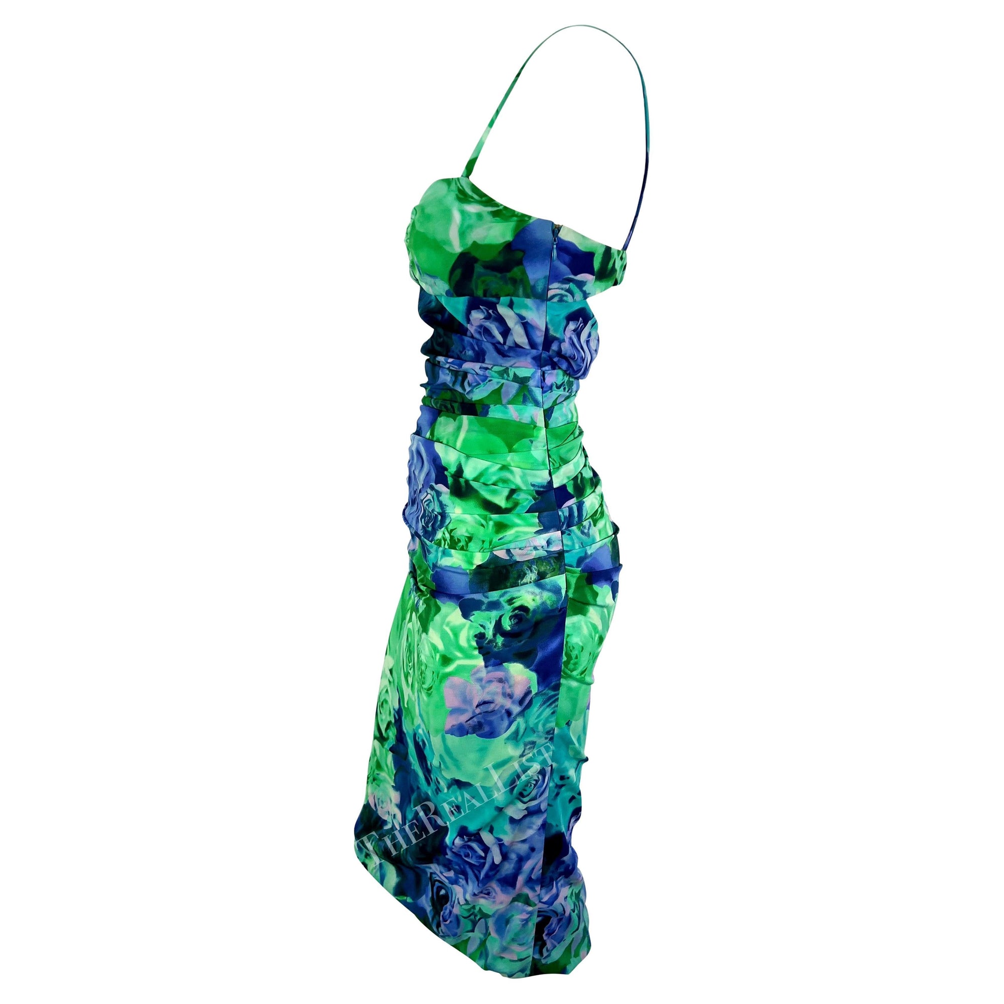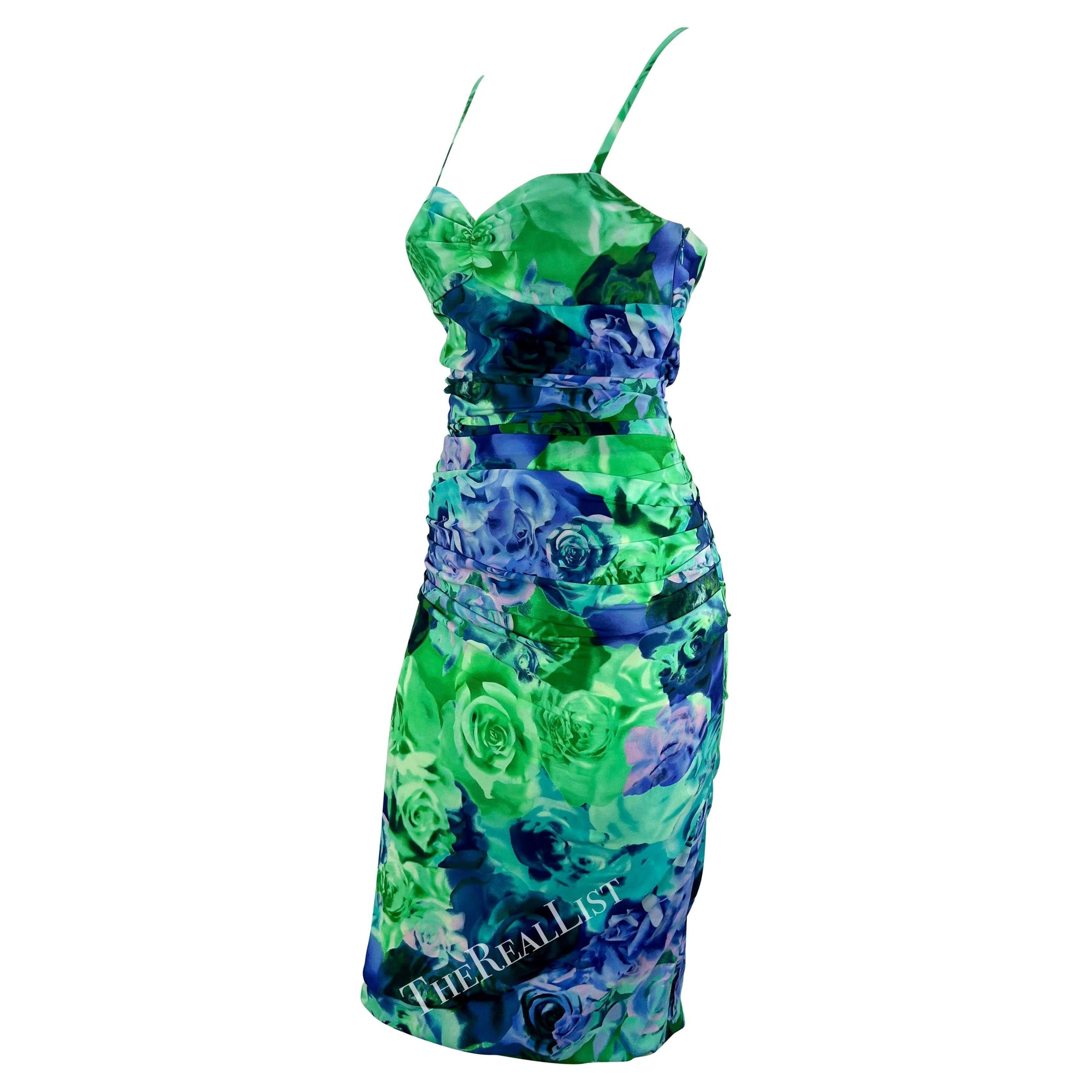 S/S 2005 Versace by Donatella Medusa Buckle Green Blue Rose Print Bodycon Dress